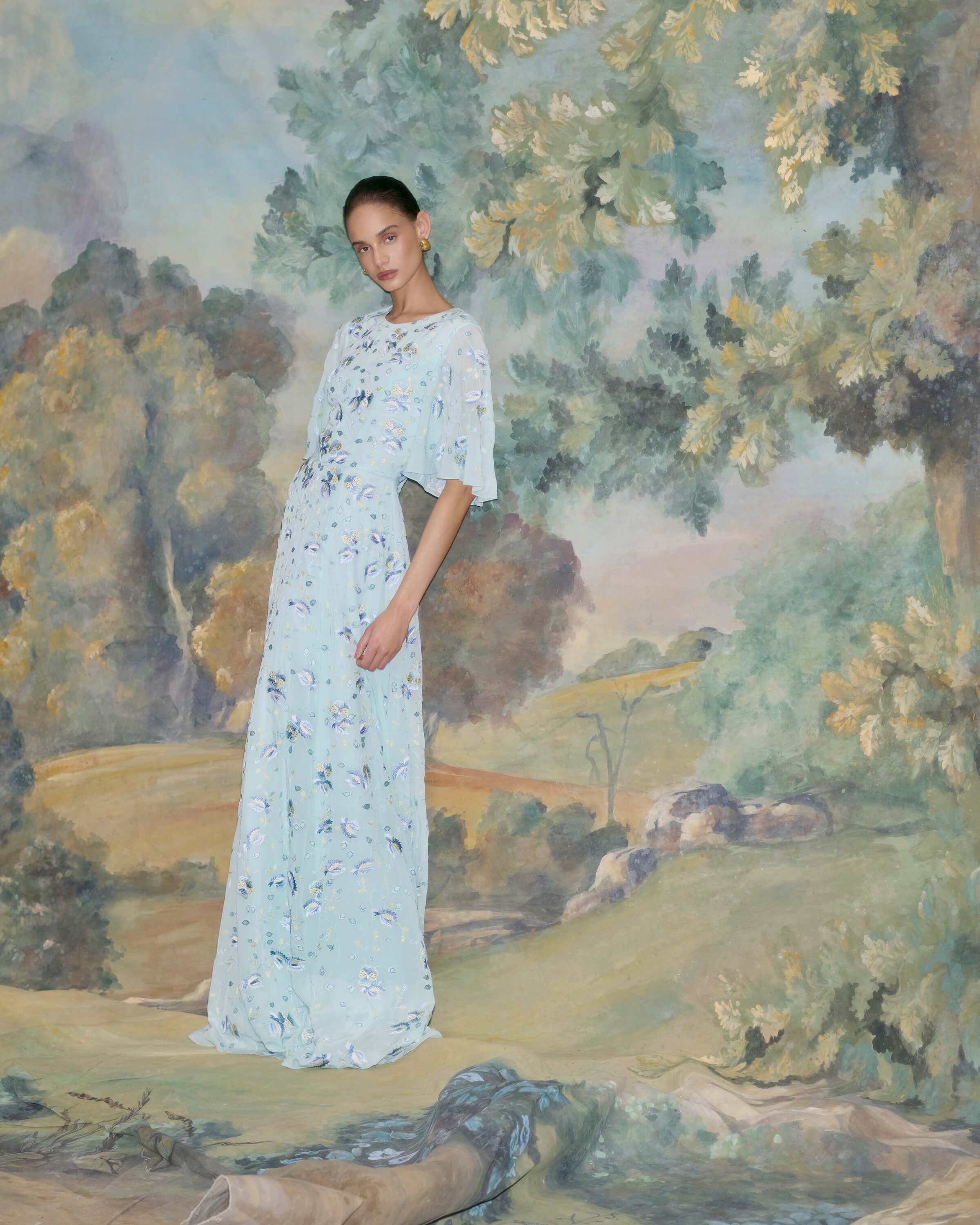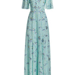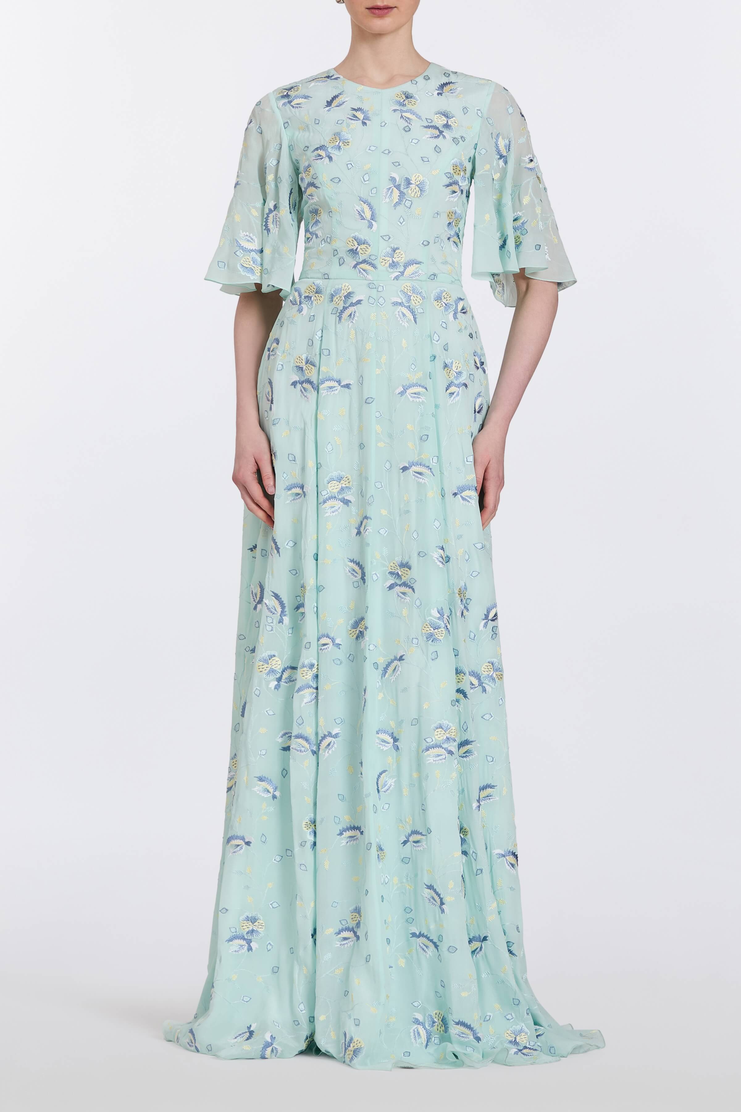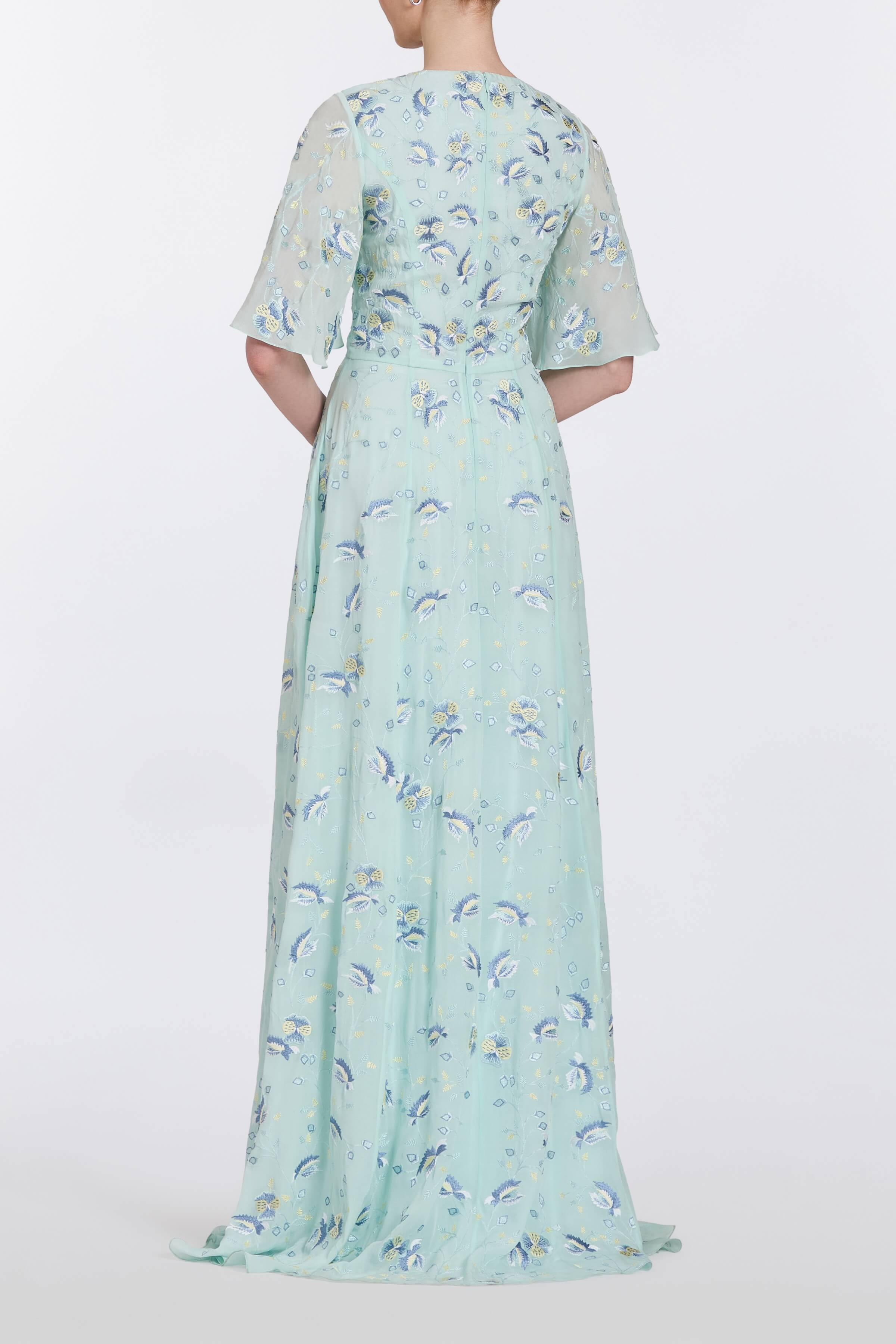 Light blue embroidered pansy full length a-line flutter sleeve gown, fully lined