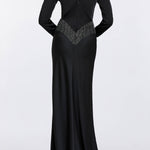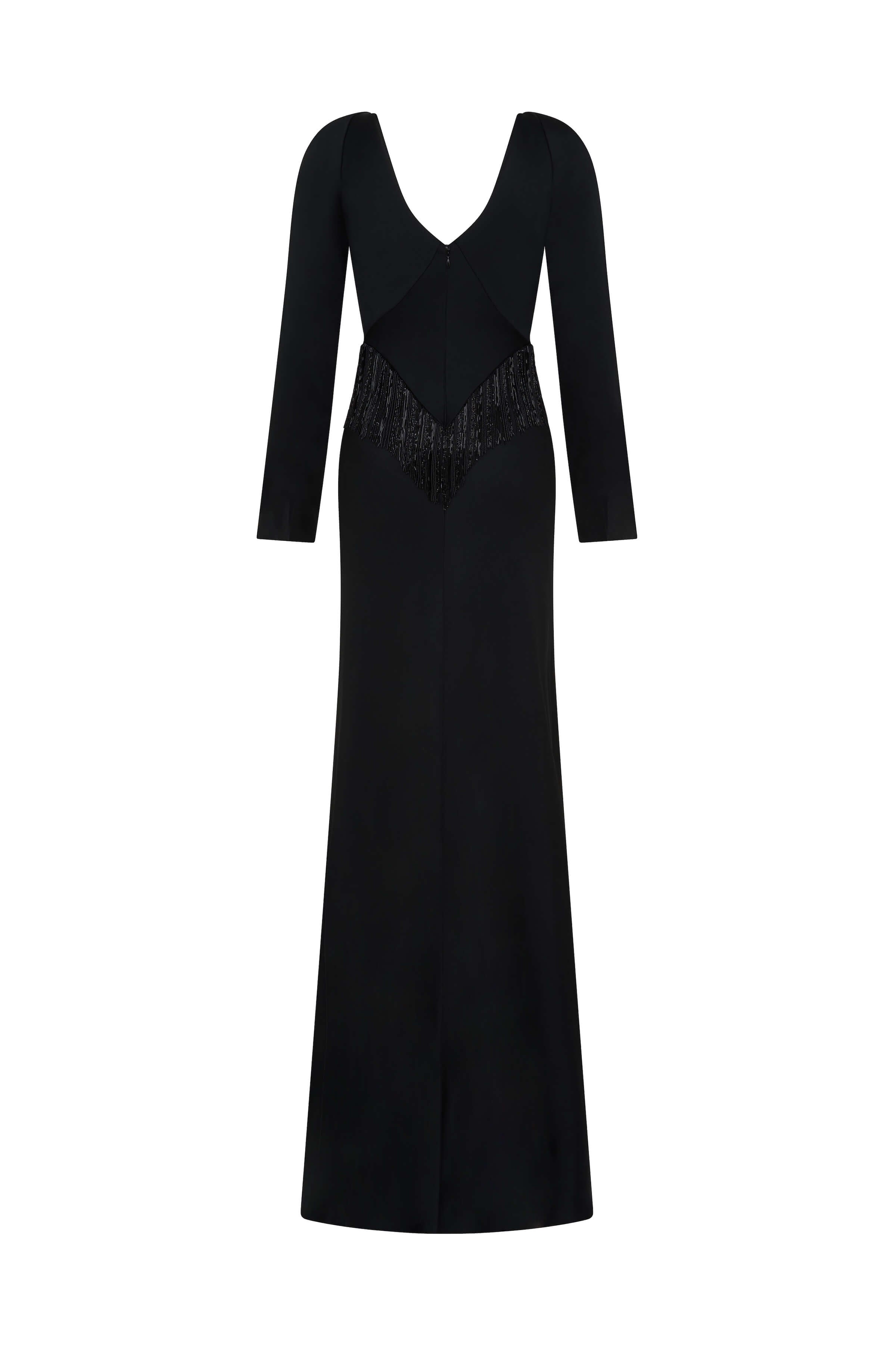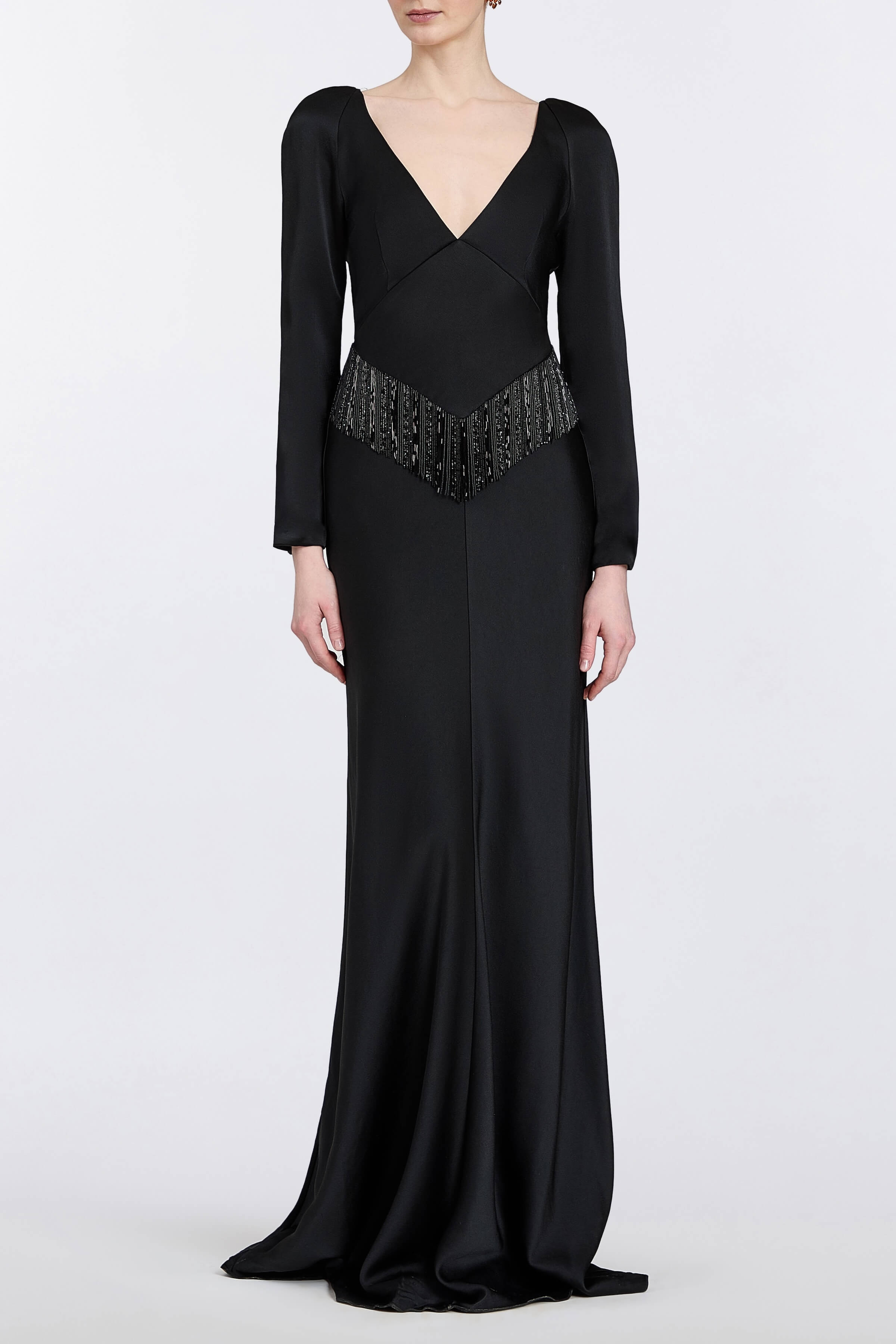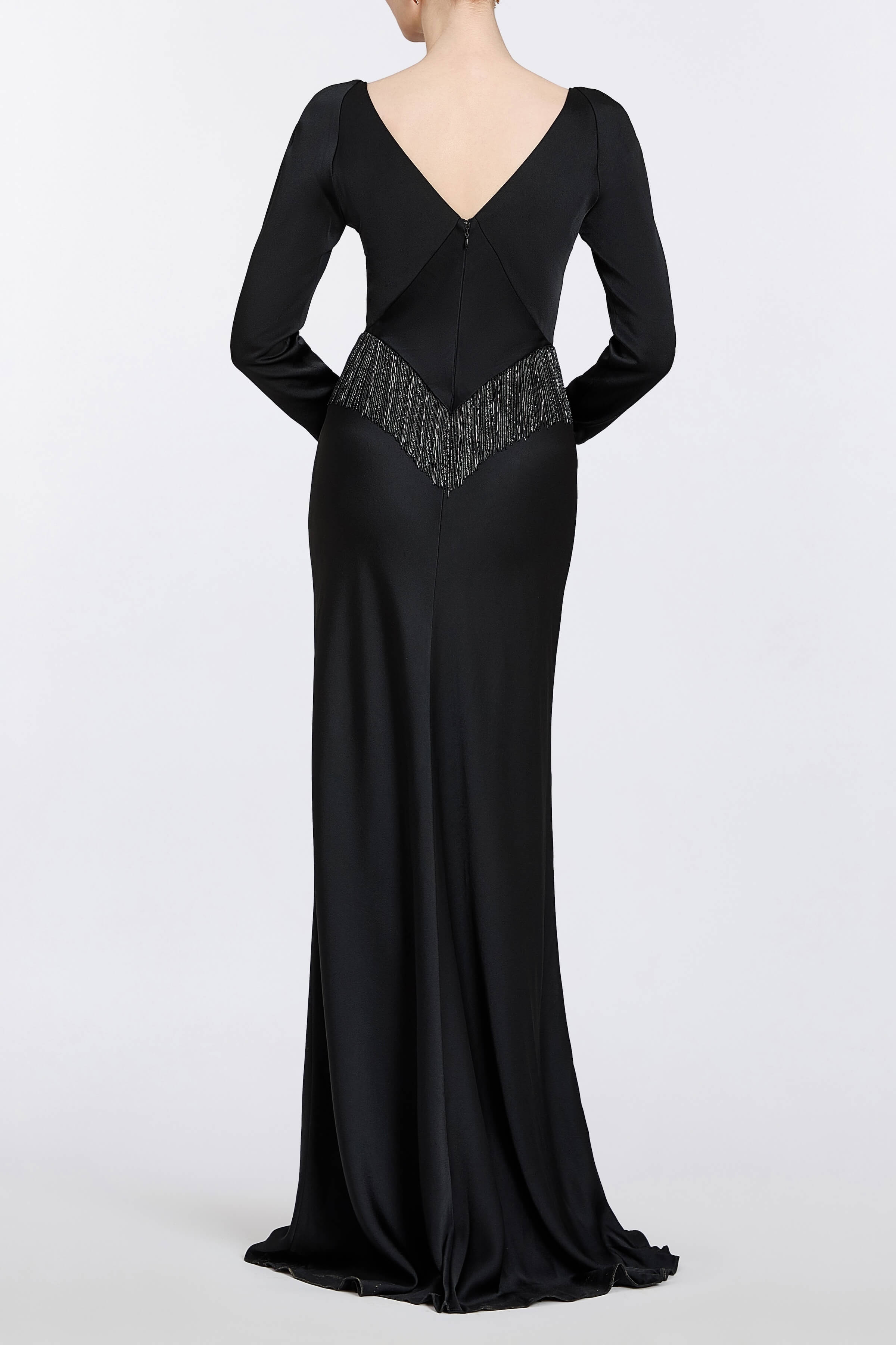 Black crepe bias cut gown with beaded fringe detail at waist and a v-neckline, fully lined