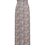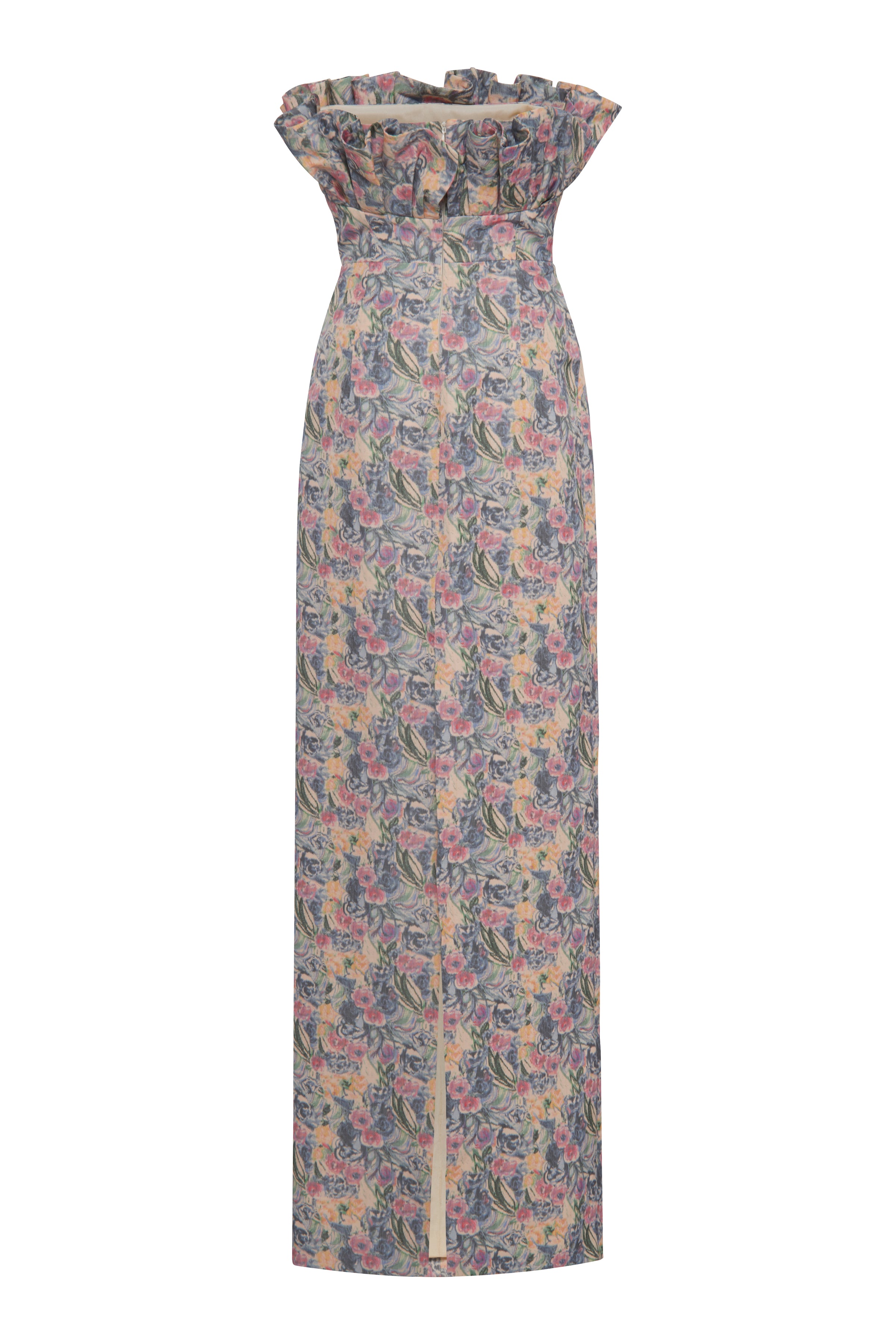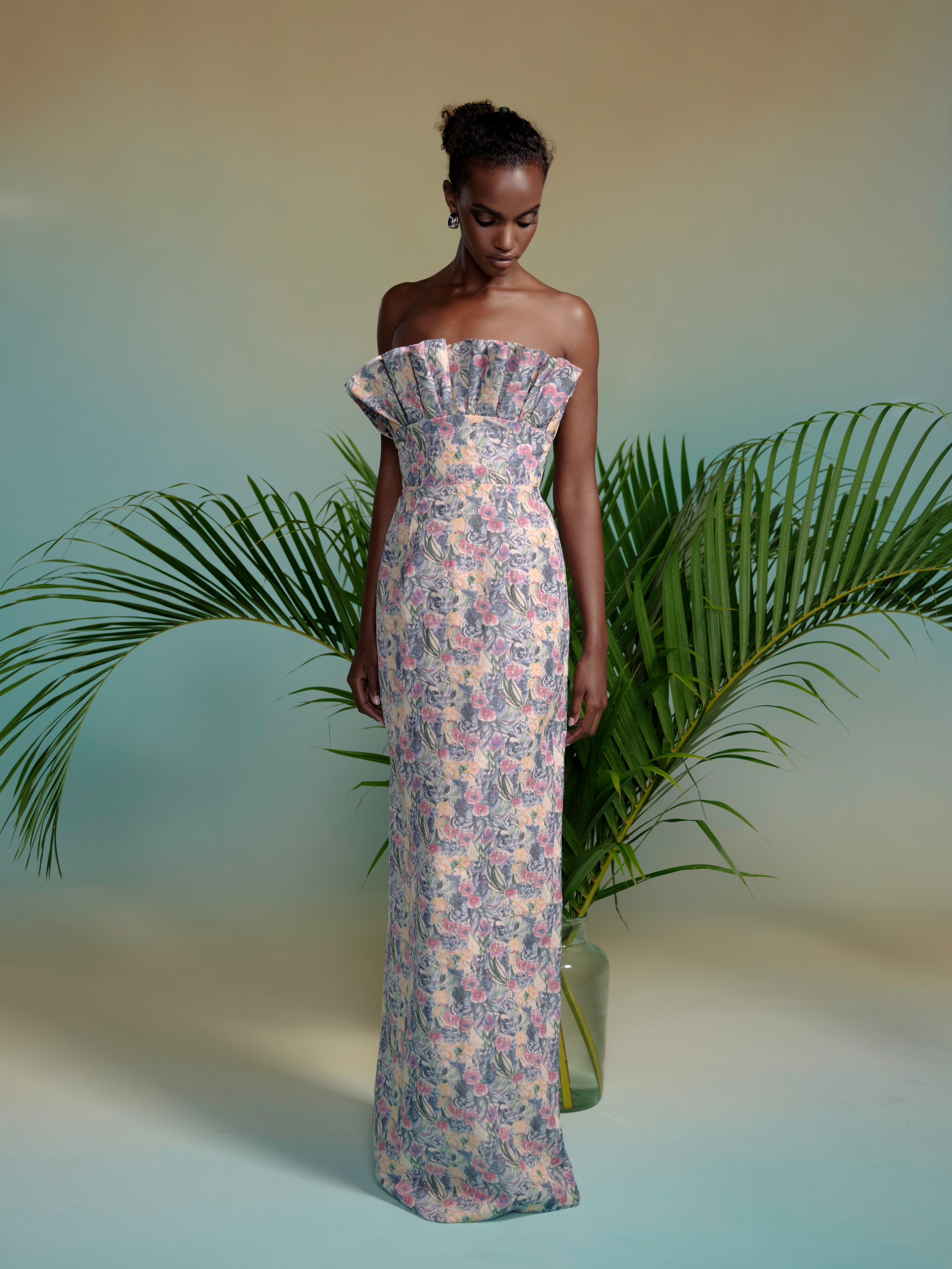 • Sustainable watercolor floral ikat strapless column gown with ruffle corset bodice and back slit, fully lined