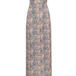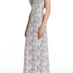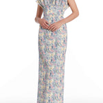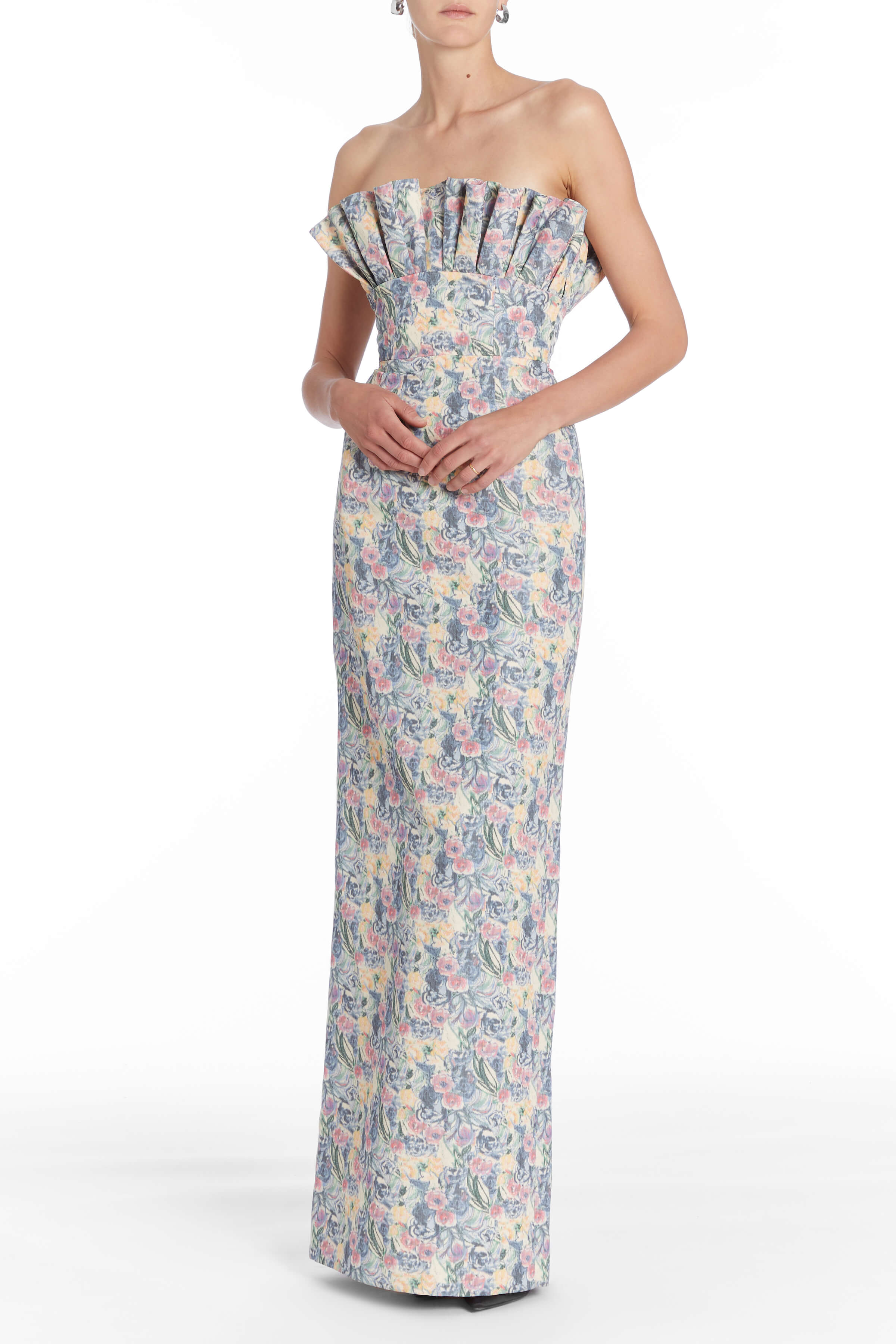 Demetra Watercolor Floral Ikat Ruffled Bodice Gown