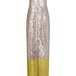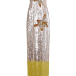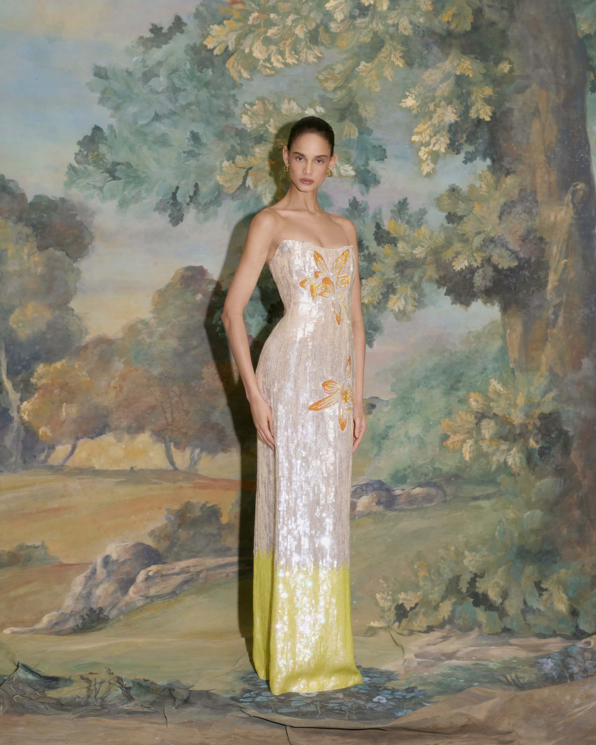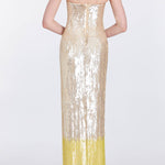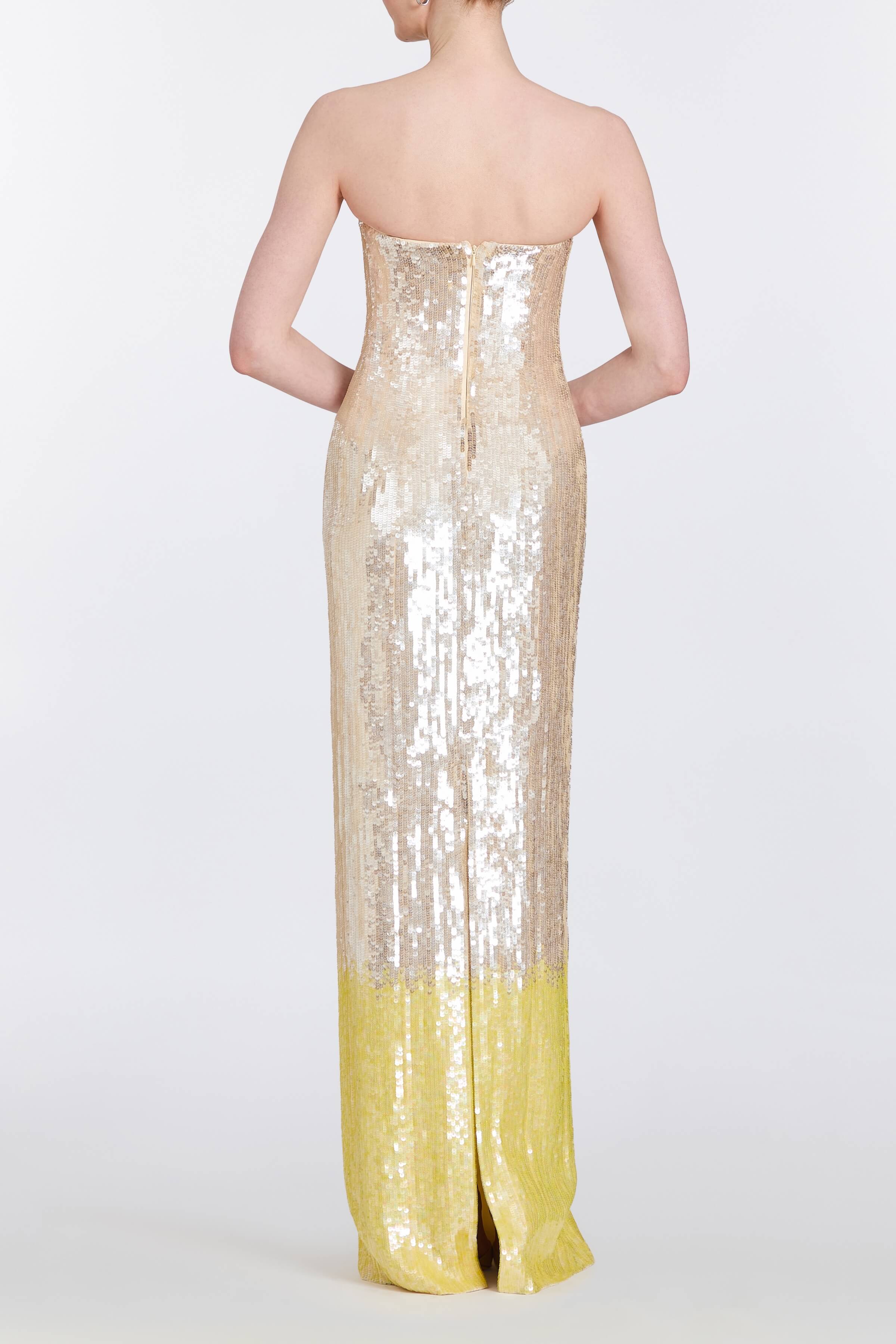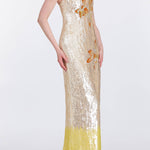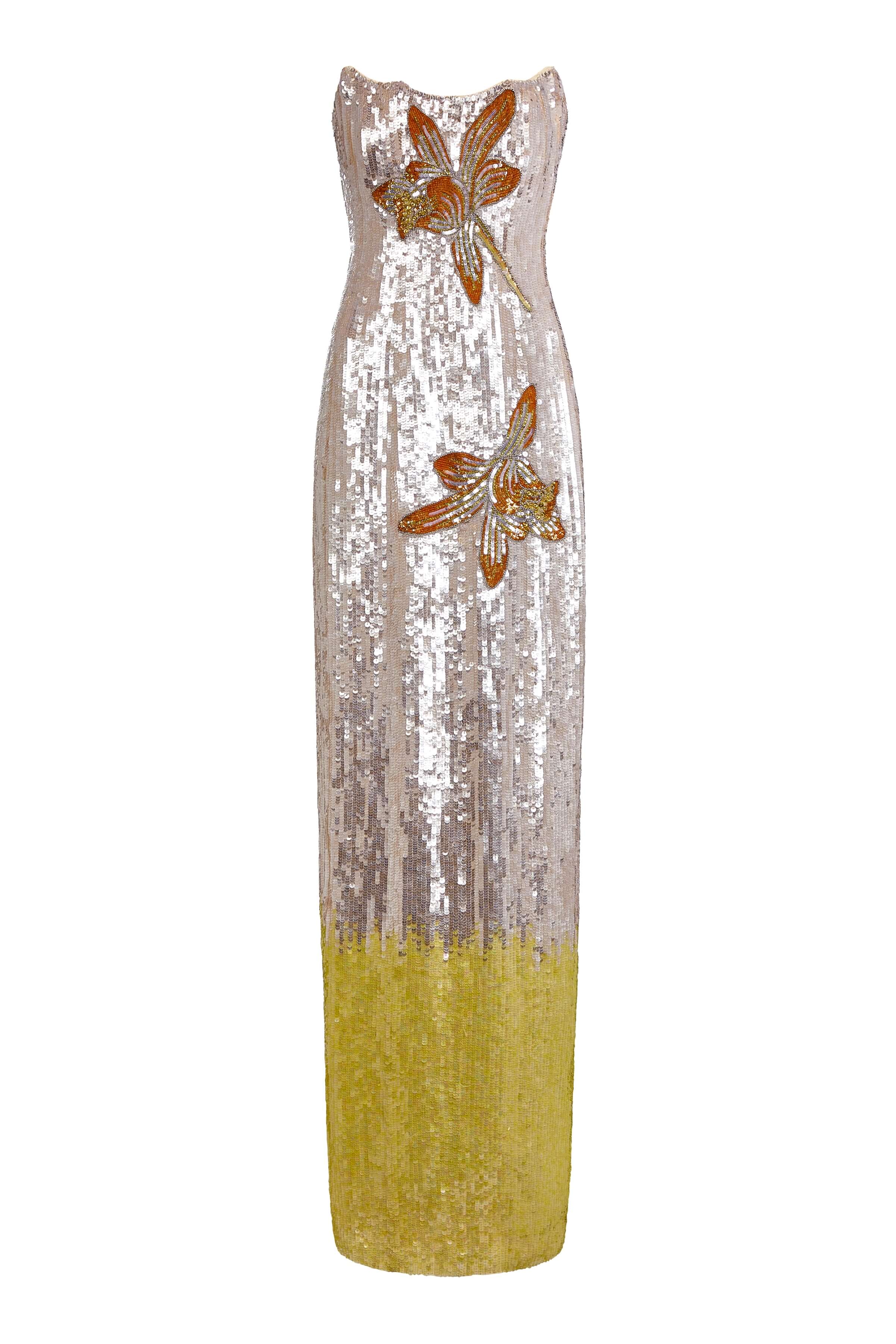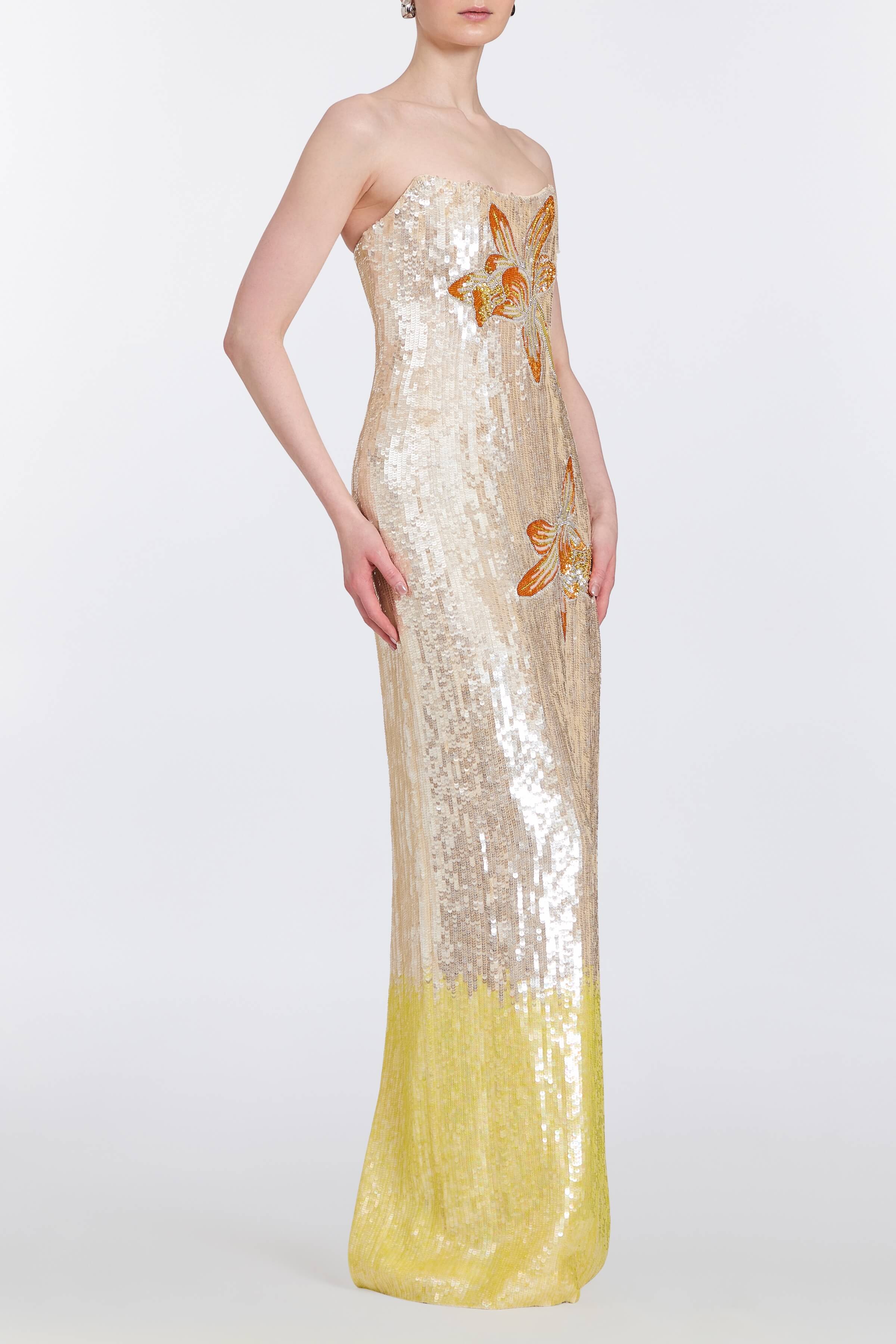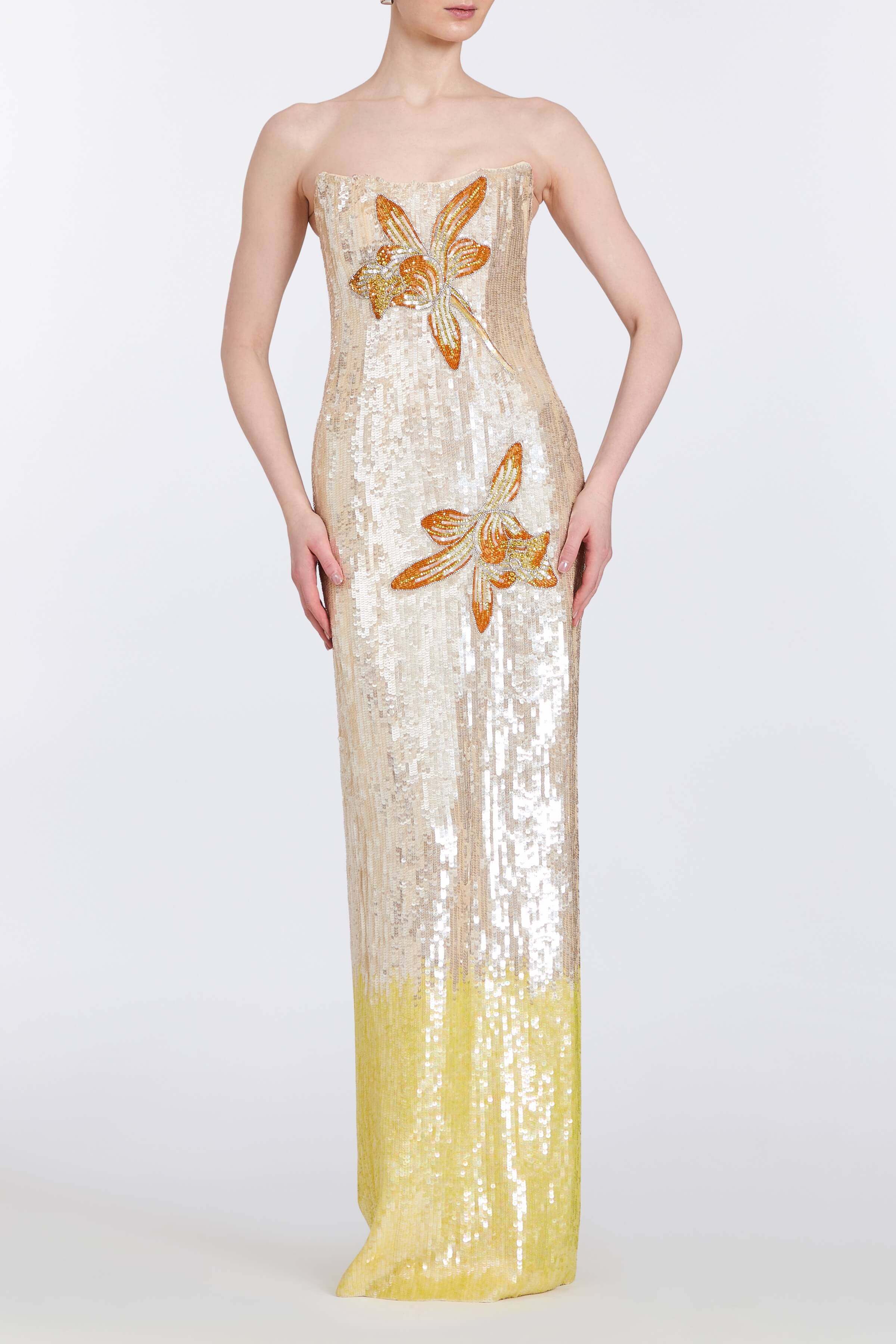 - Hand beaded yellow and silver floral sequin strapless column gown with back slit, fully lined