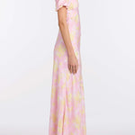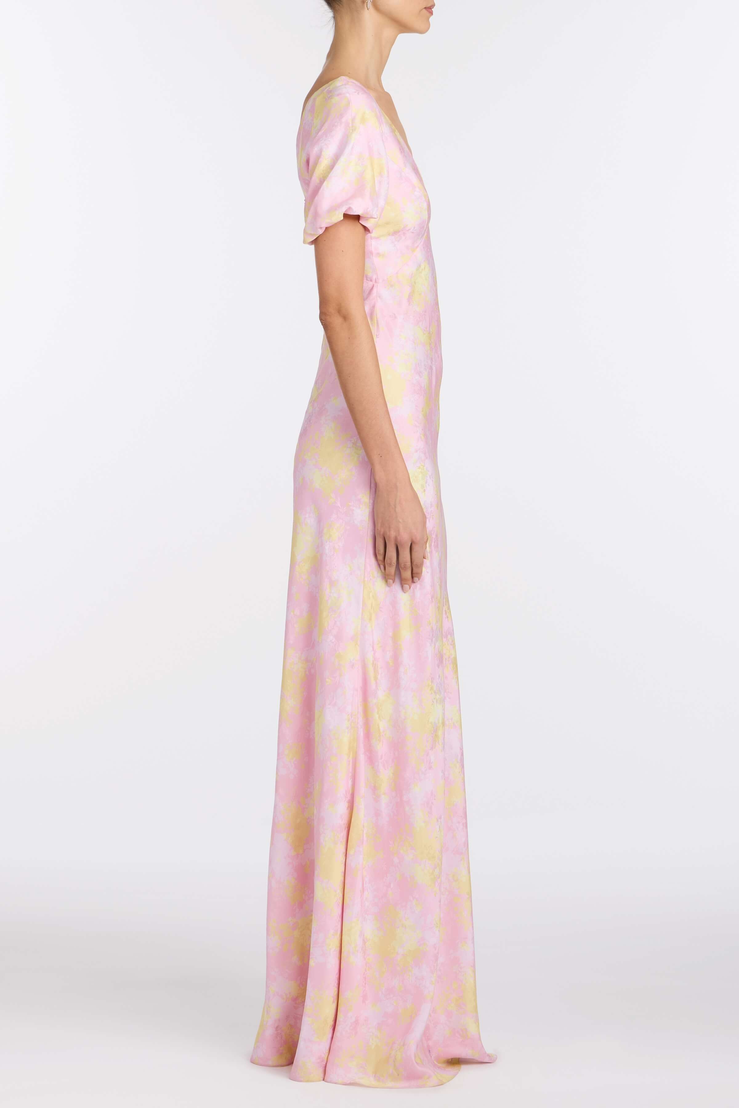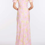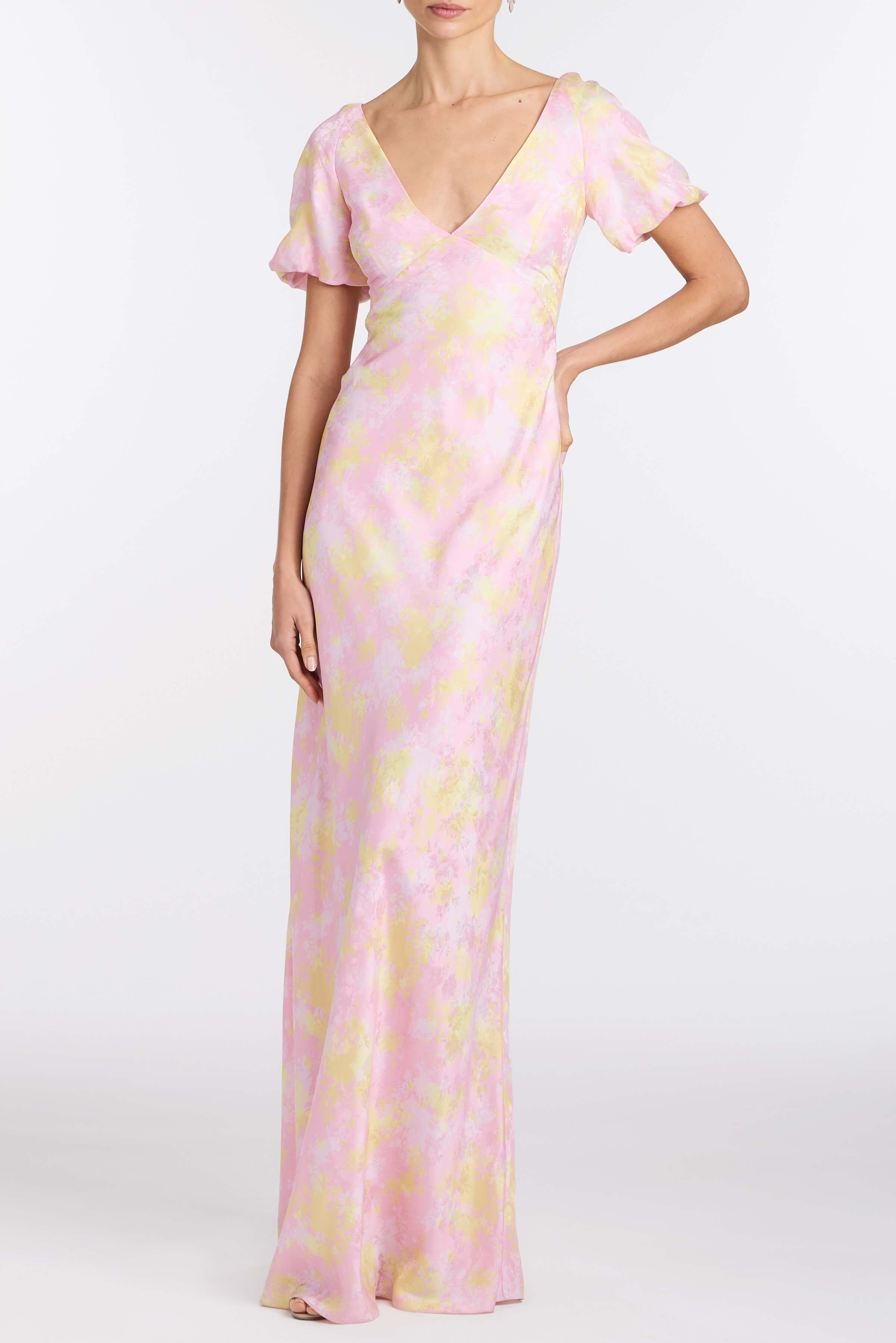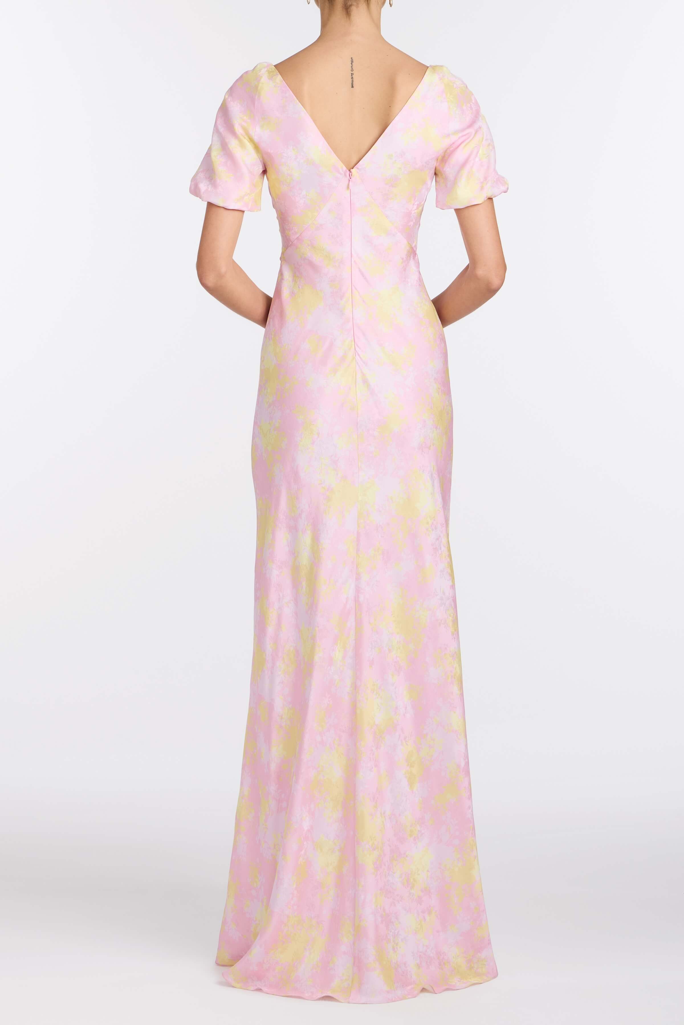 - Pink and yellow printed floral satin puff sleeve v-neck gown with v-back, fully lined