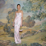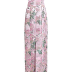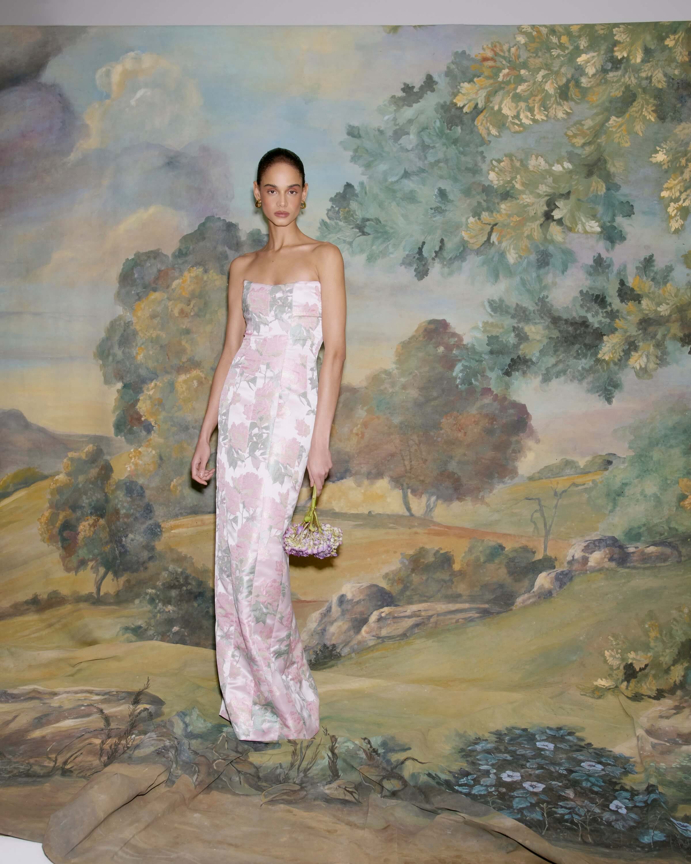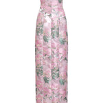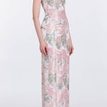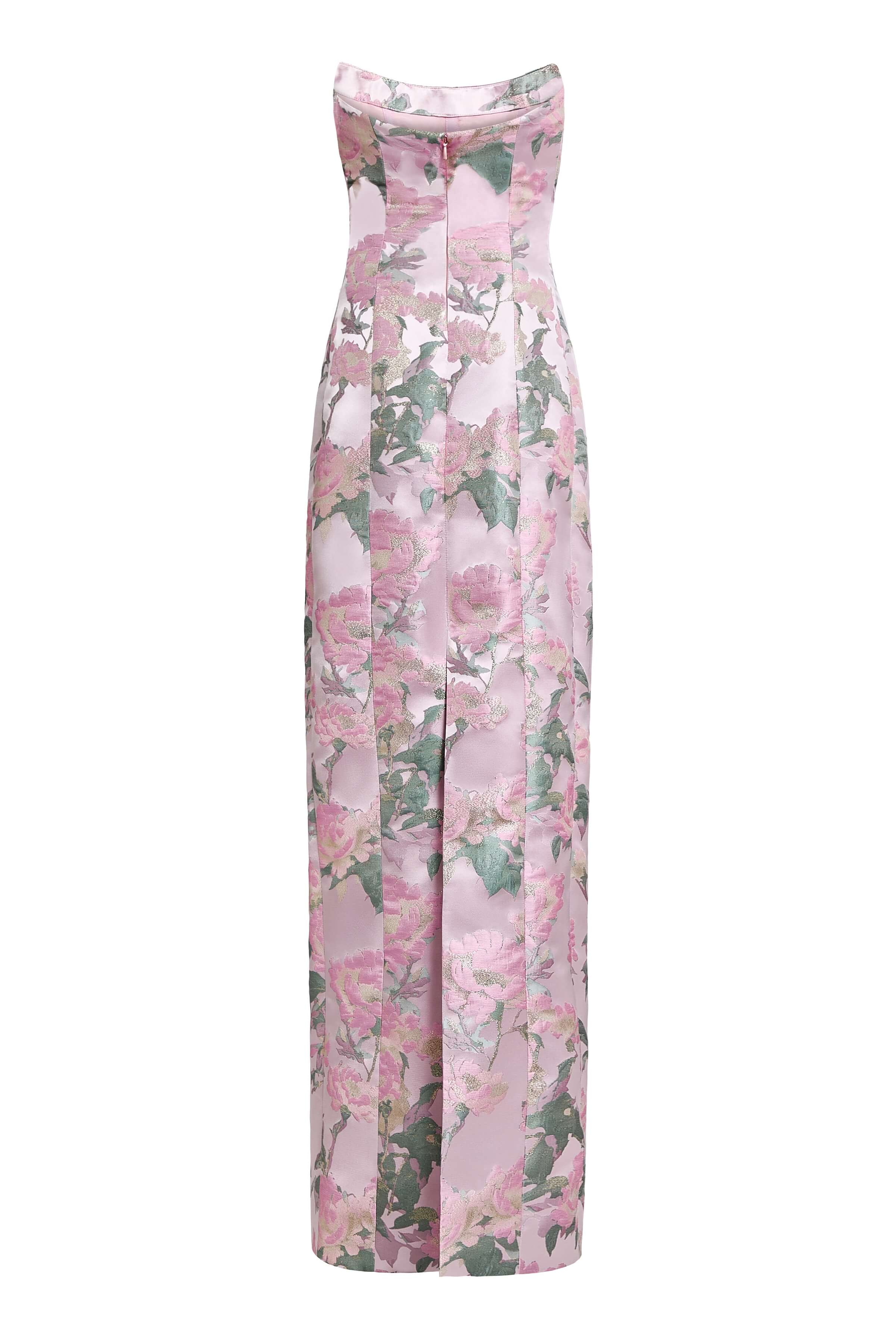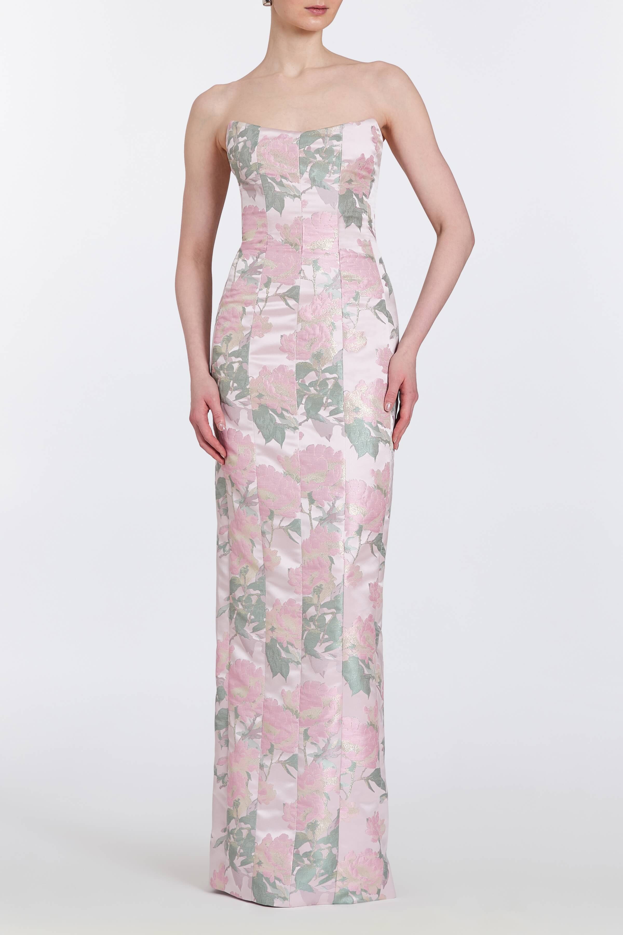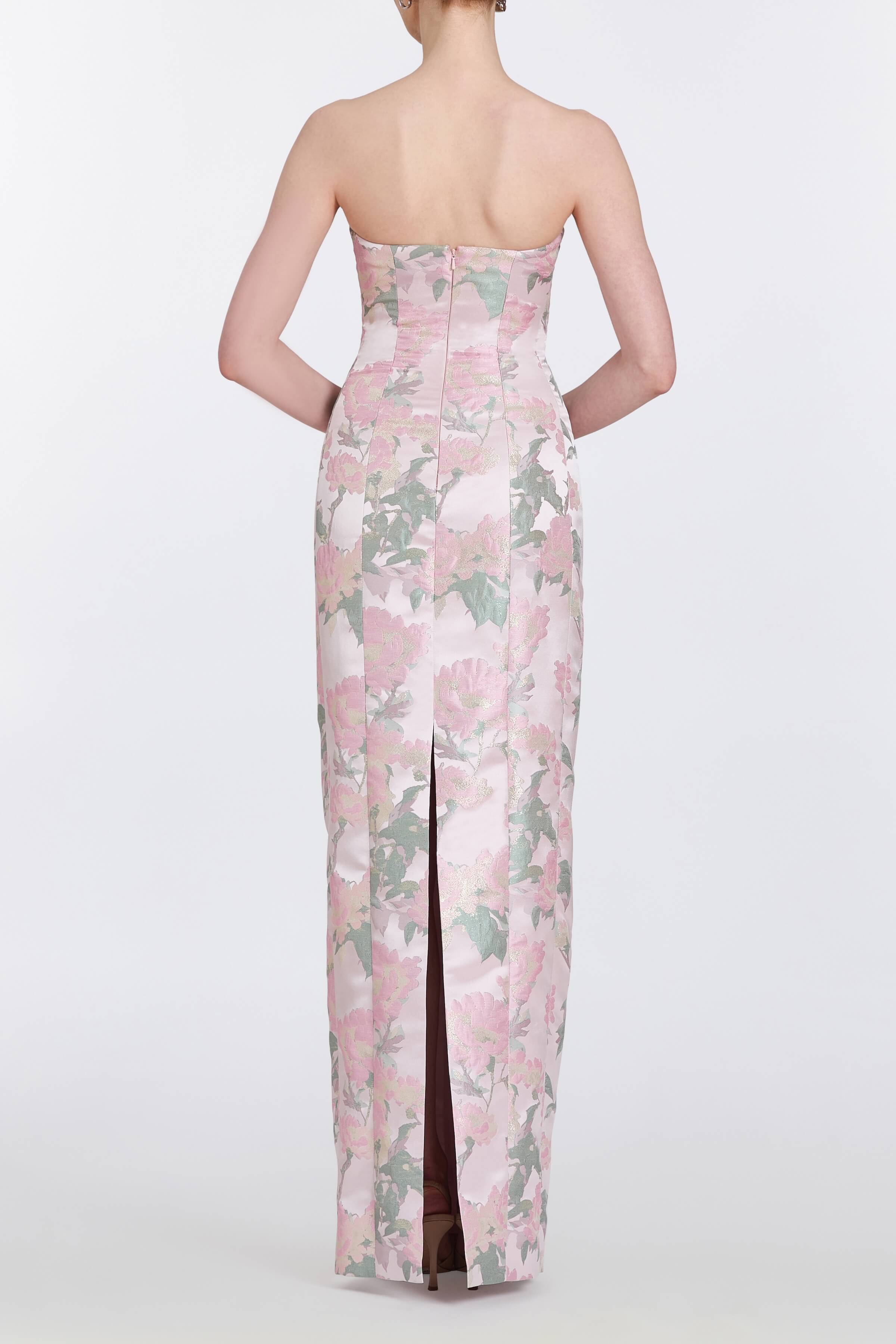 Light pink metallic floral brocade strapless column gown with back slit, fully lined