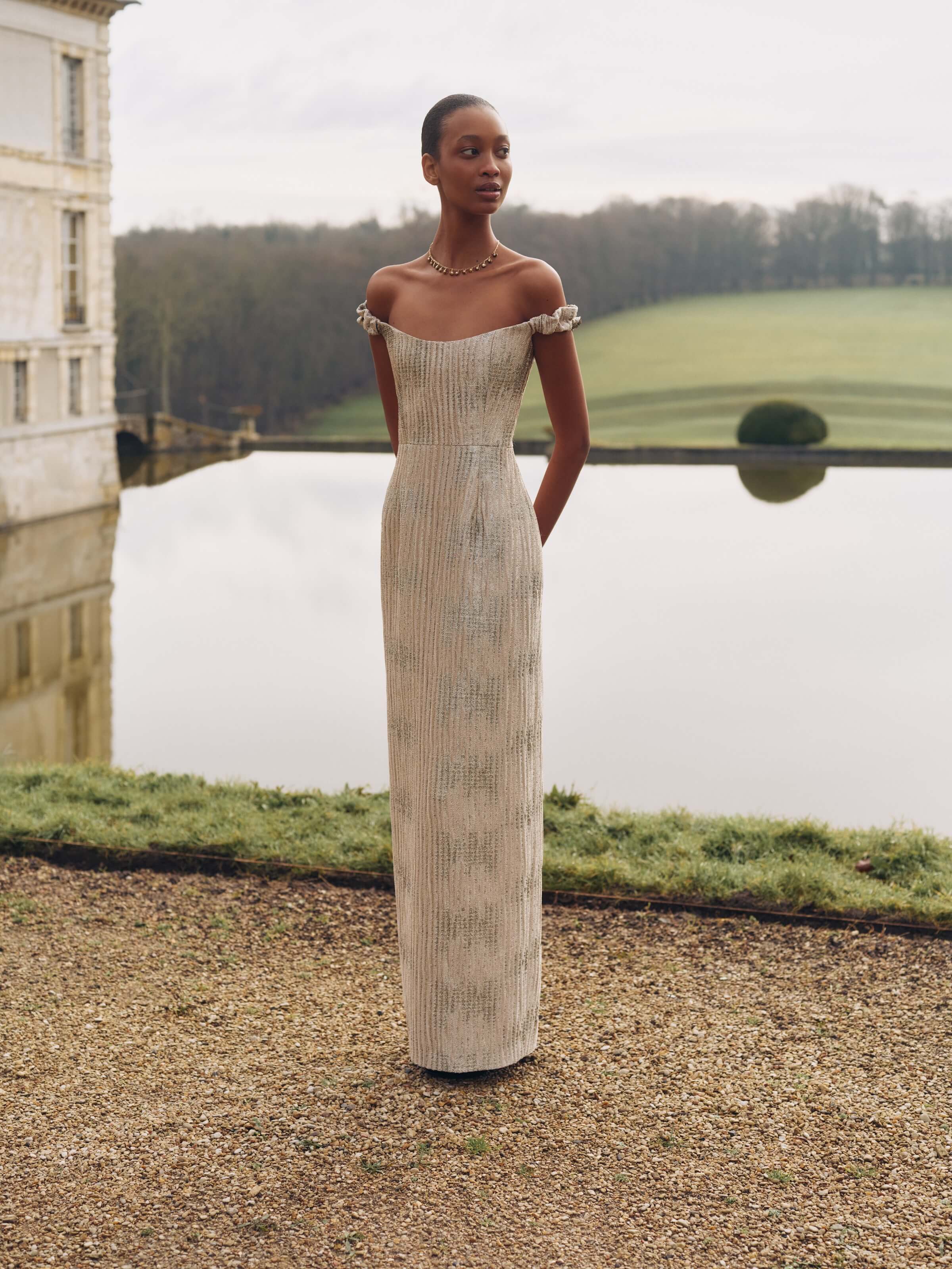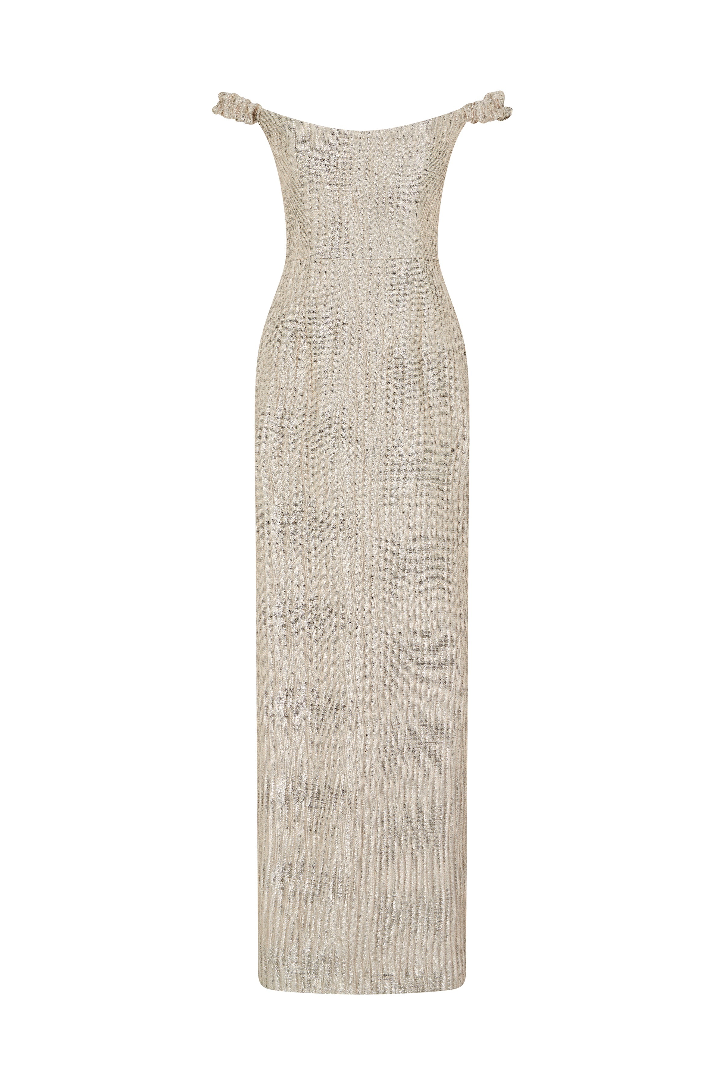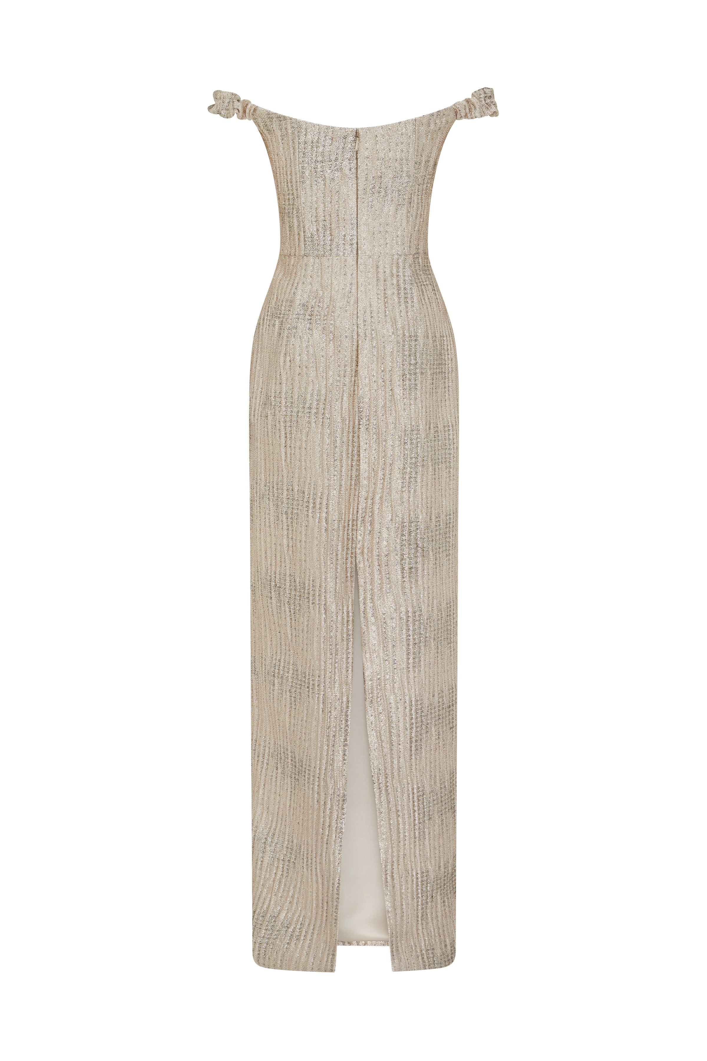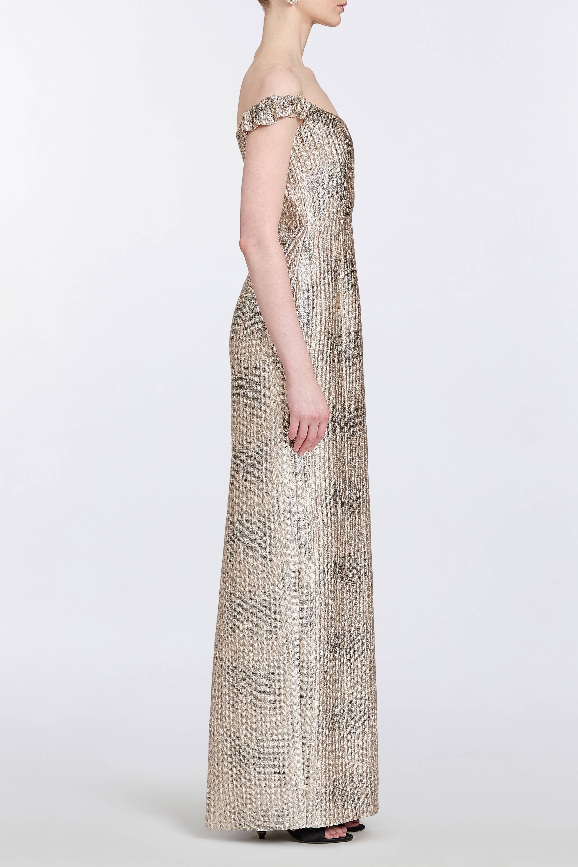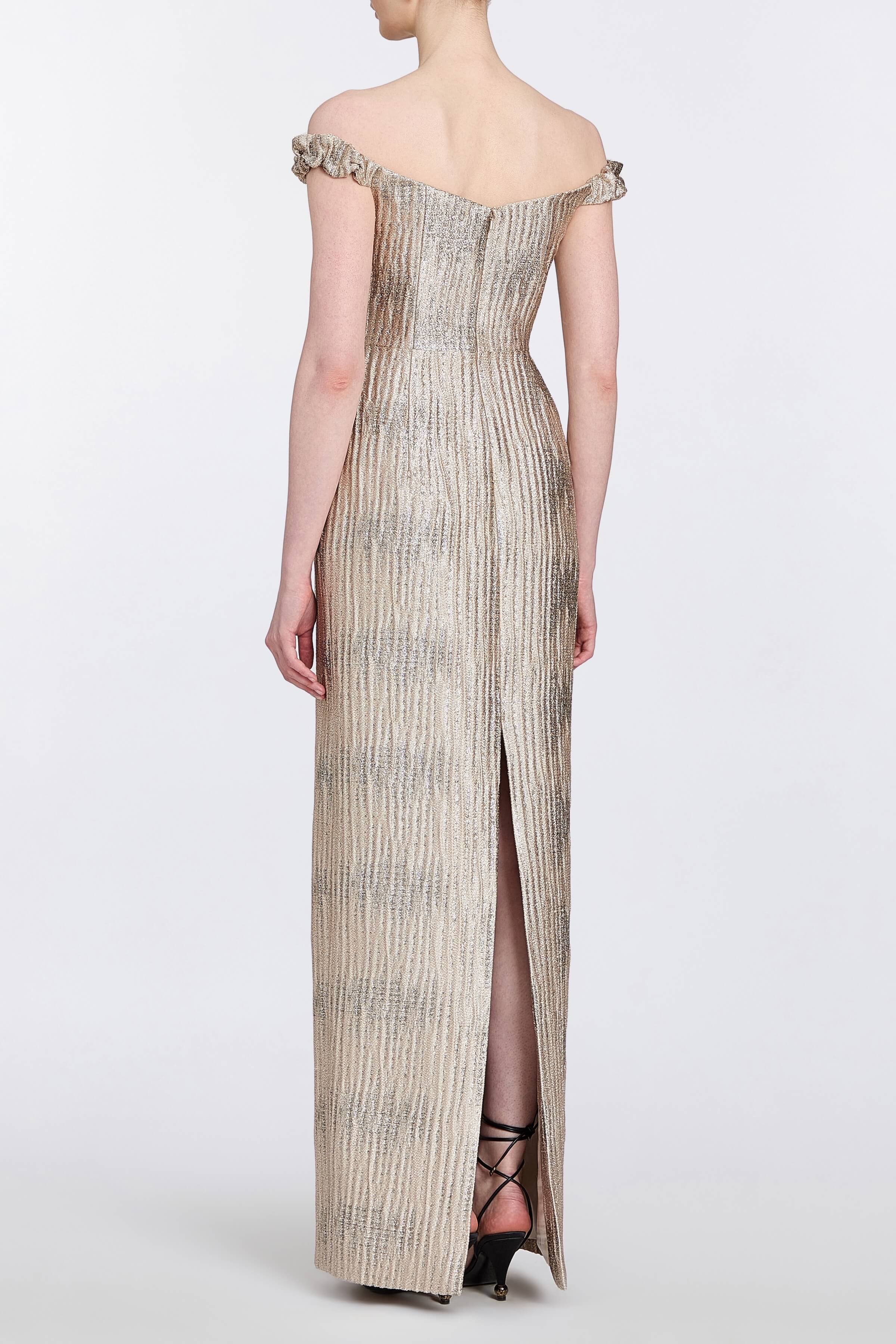 • Off-the-shoulder column gown with straight neckline and back slit, fully lined