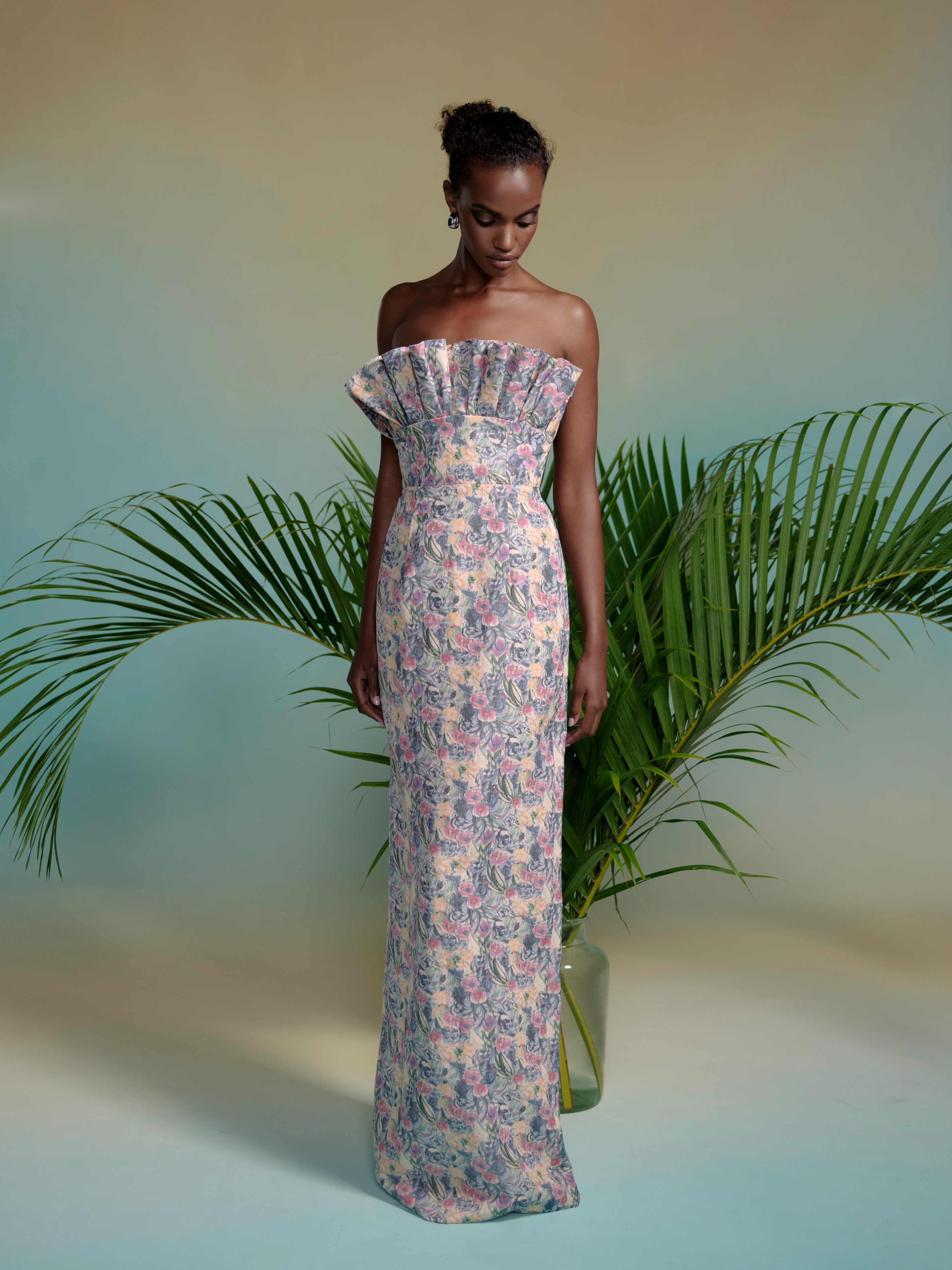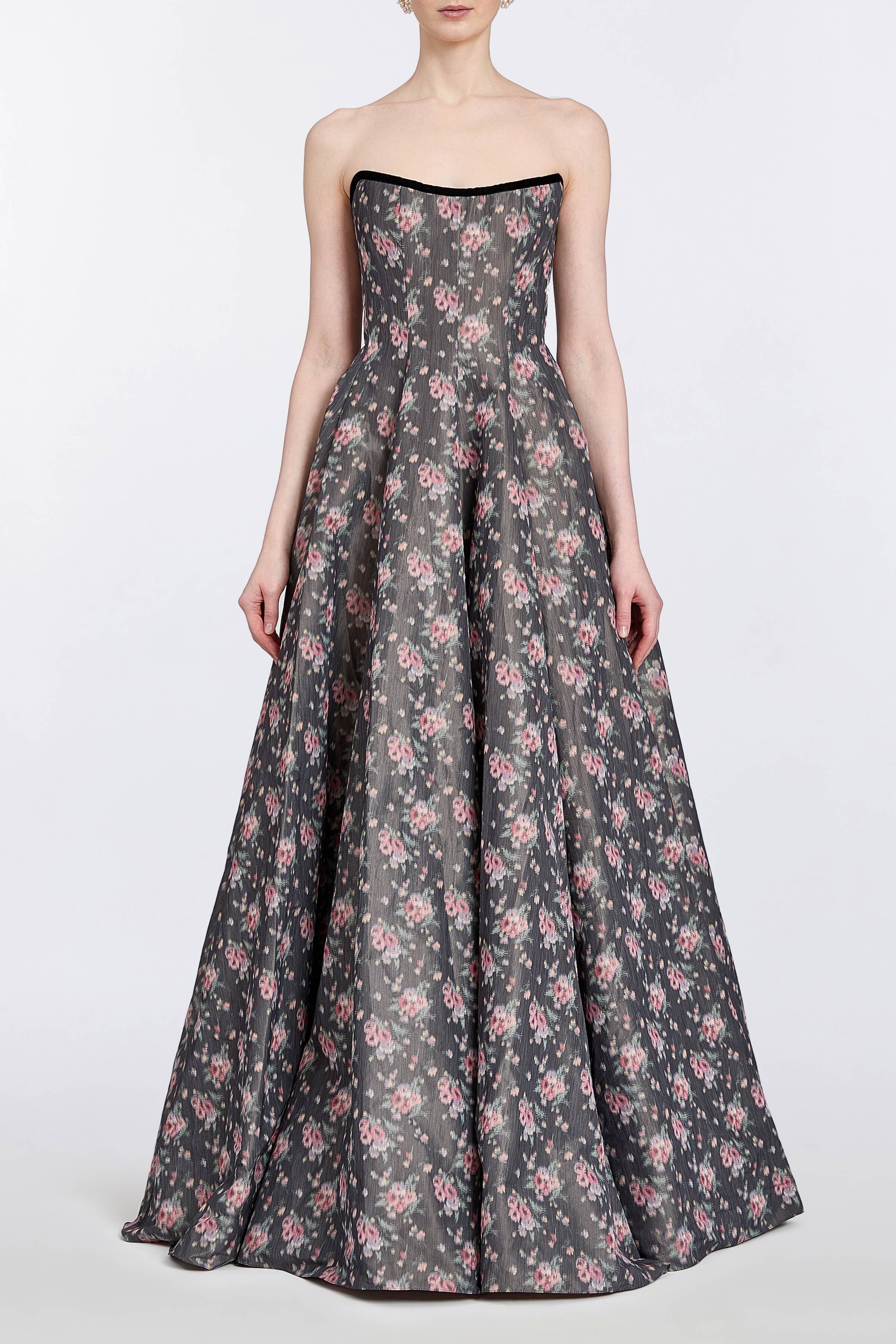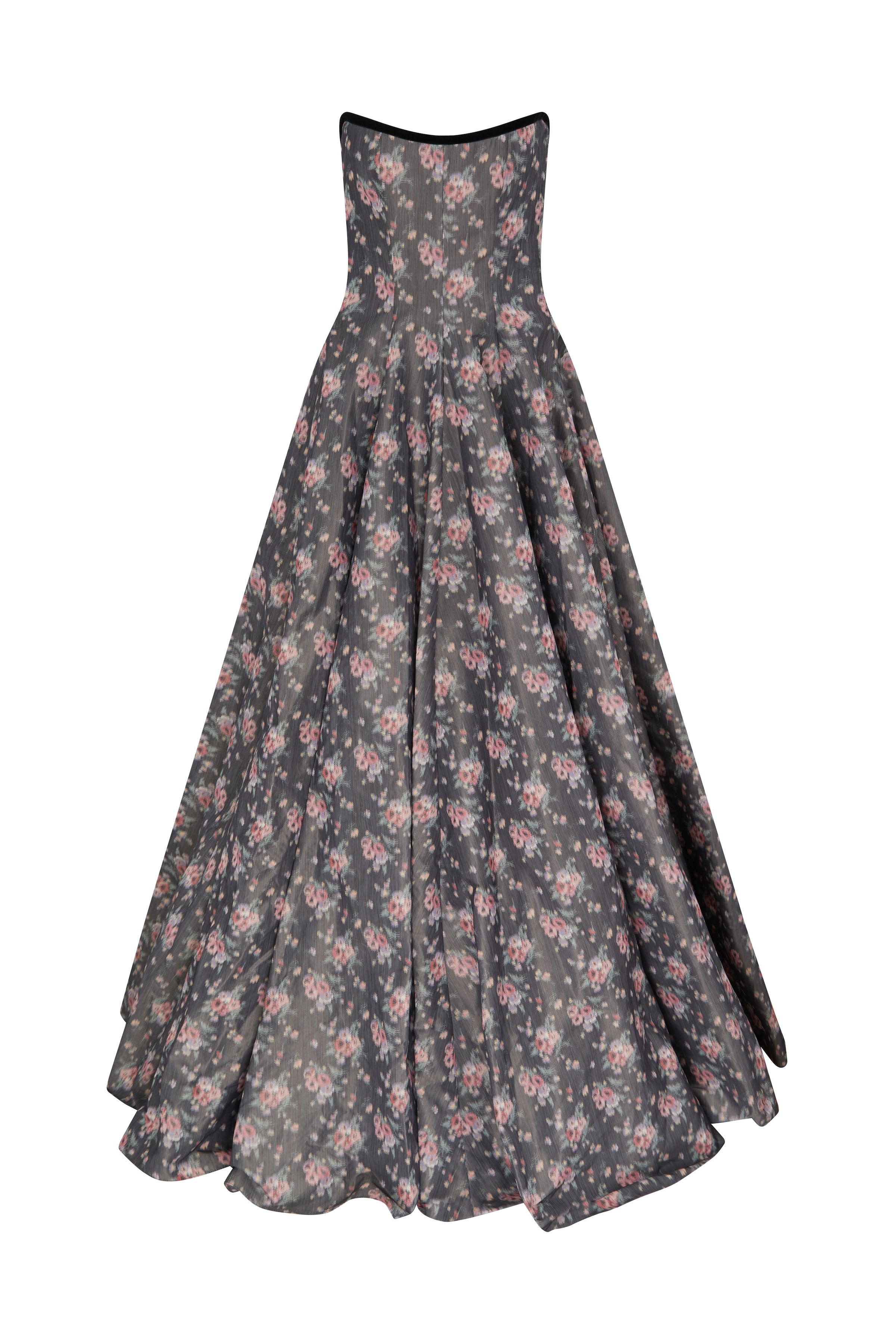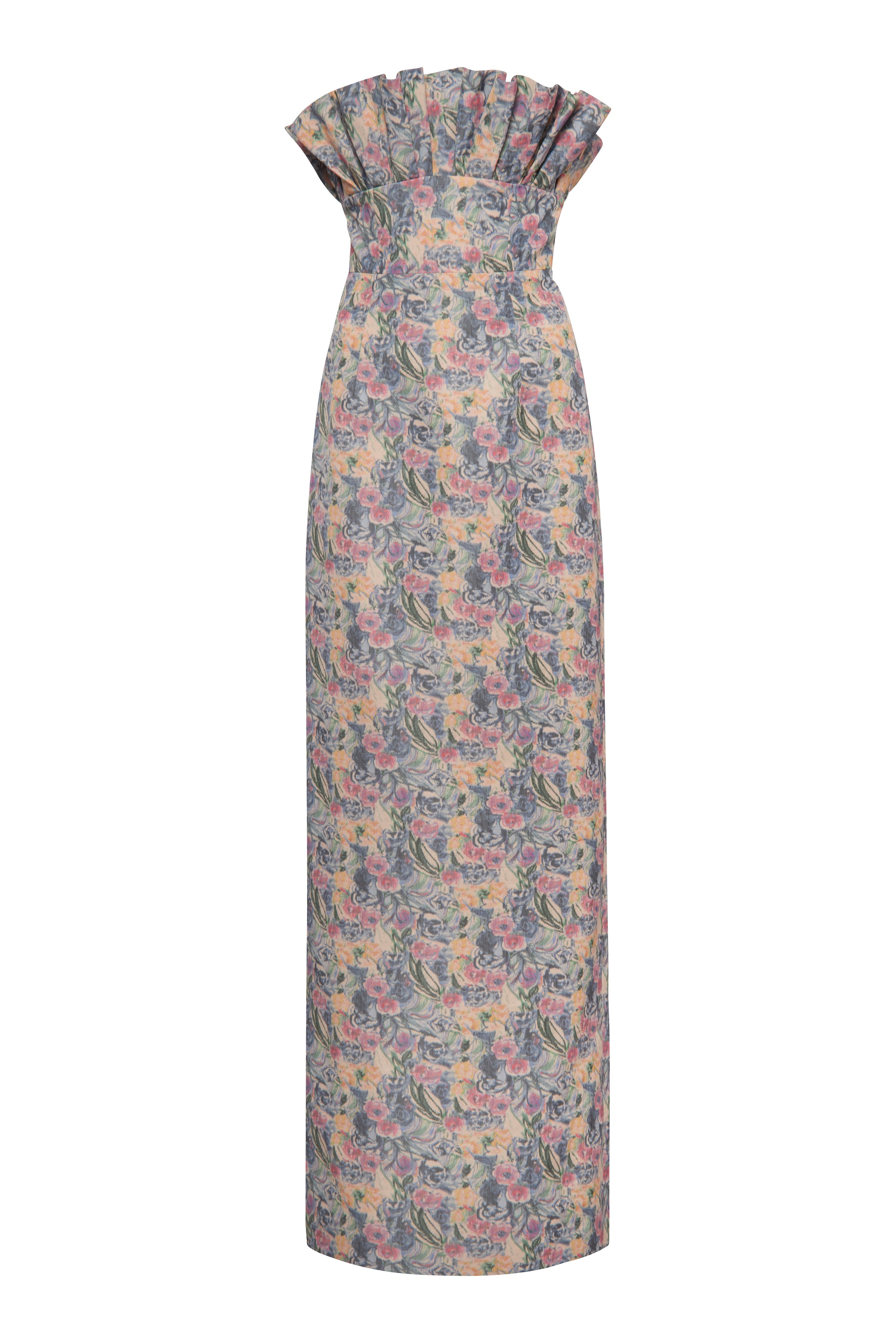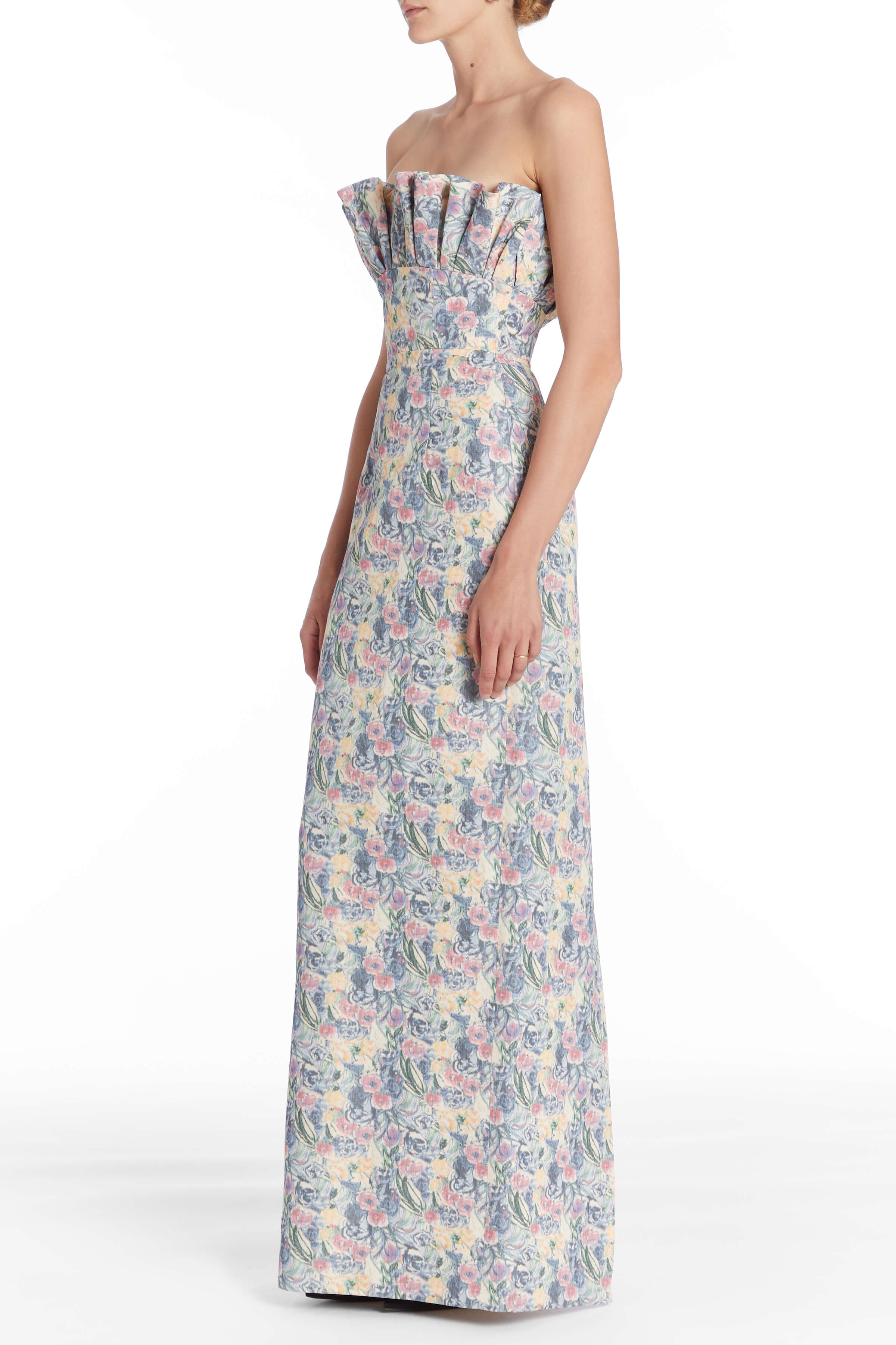 Demetra Watercolor Floral Ikat Ruffled Bodice Gown