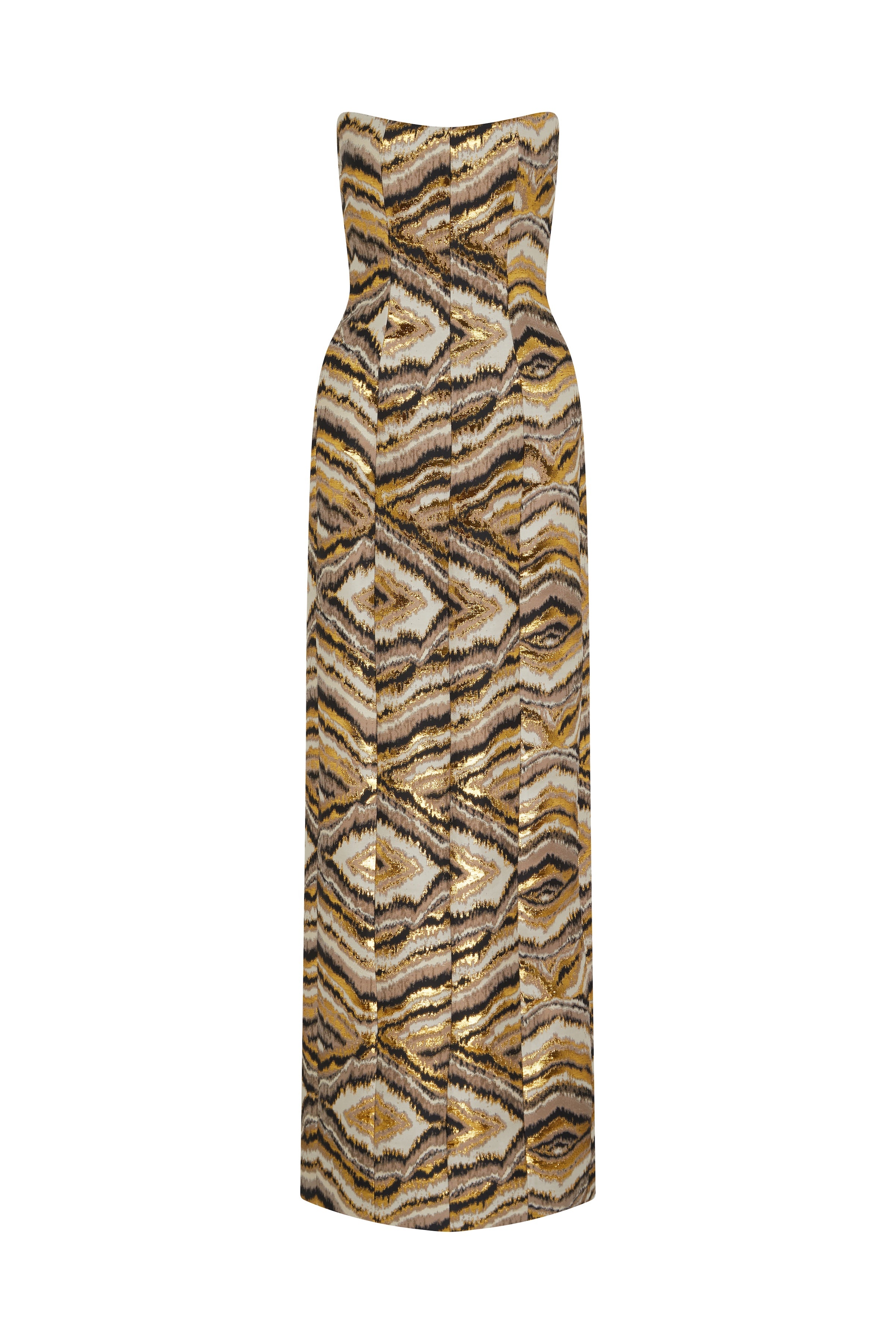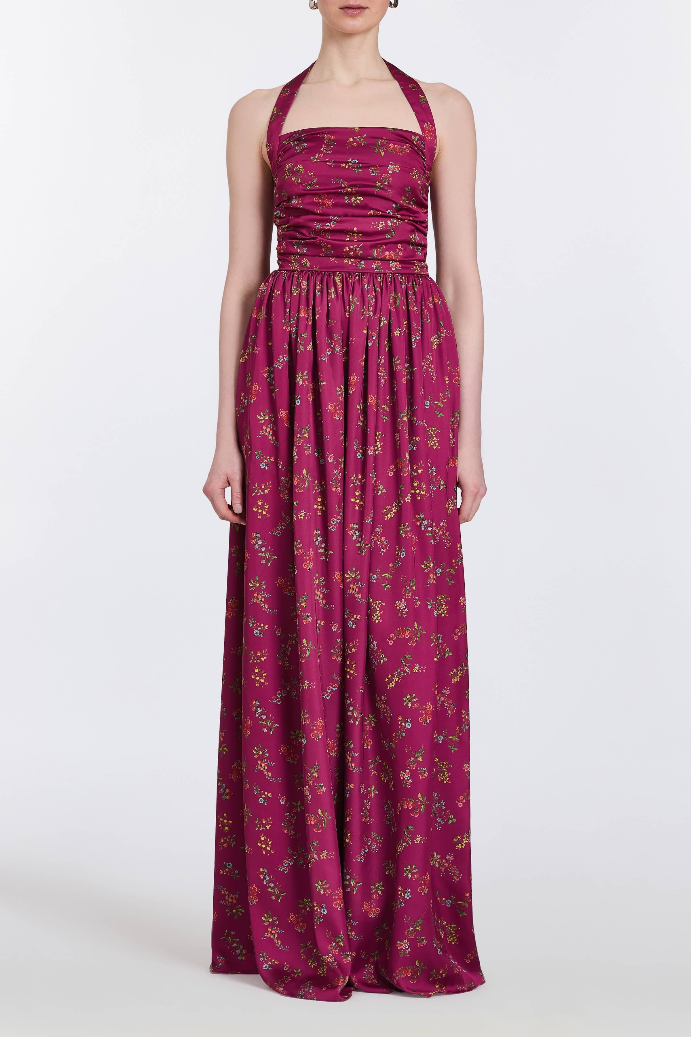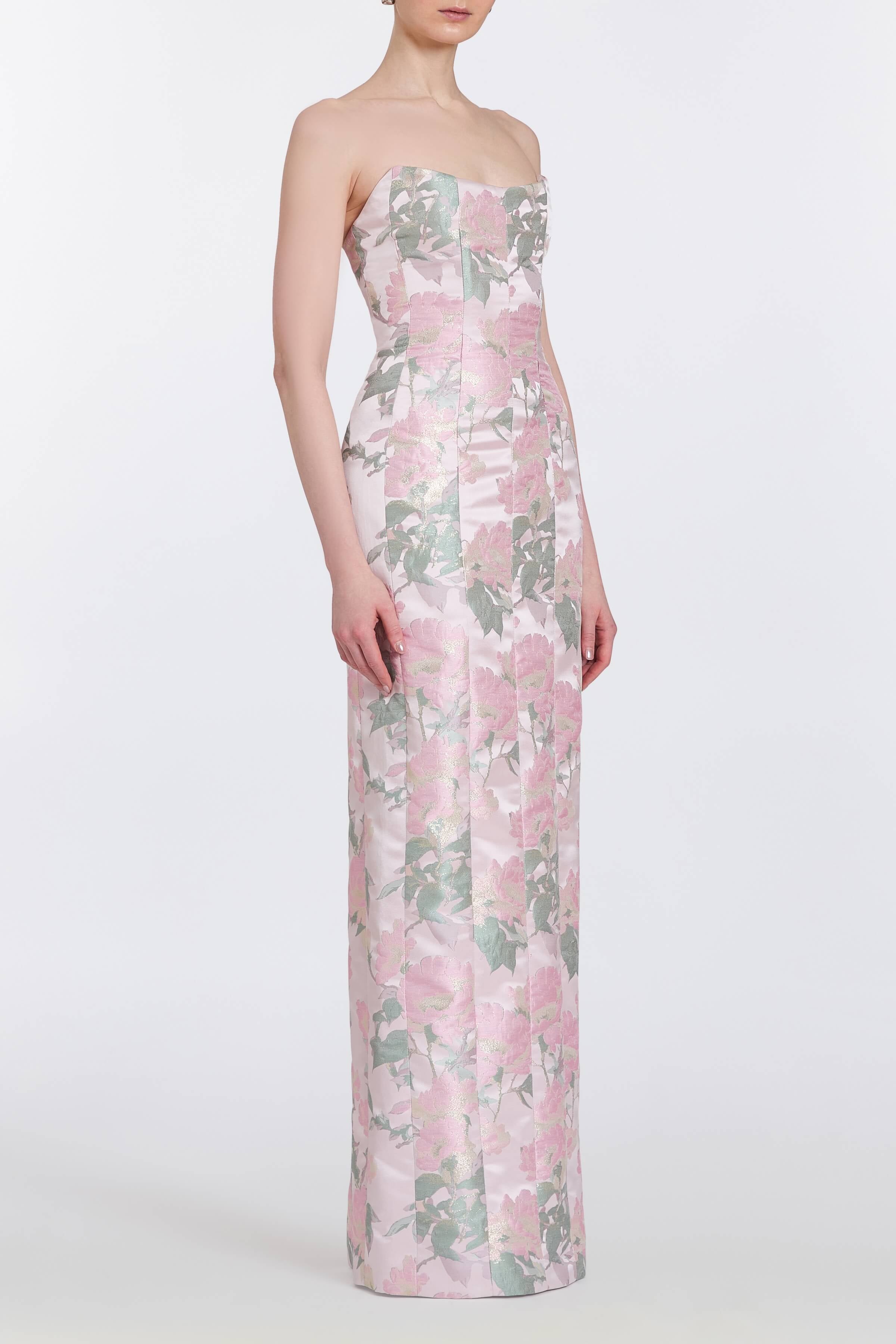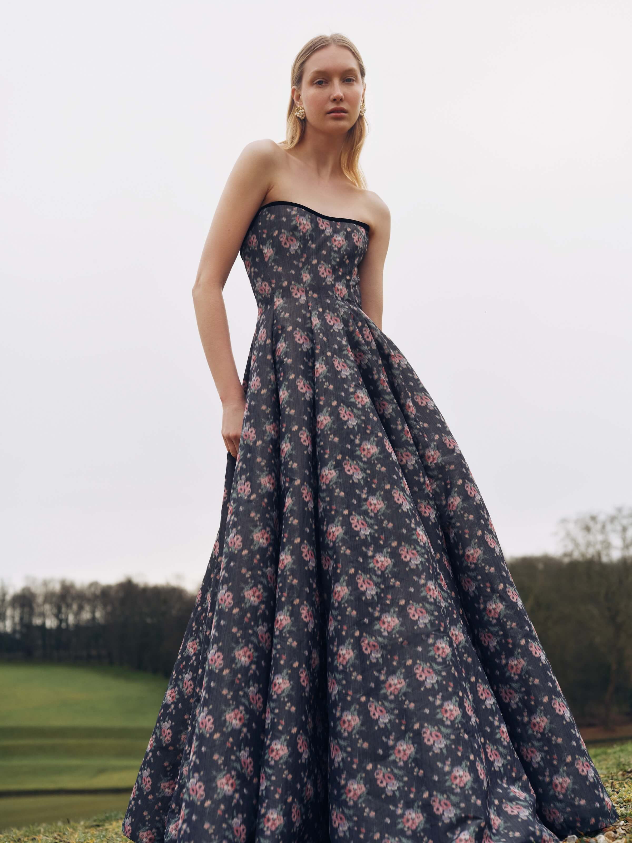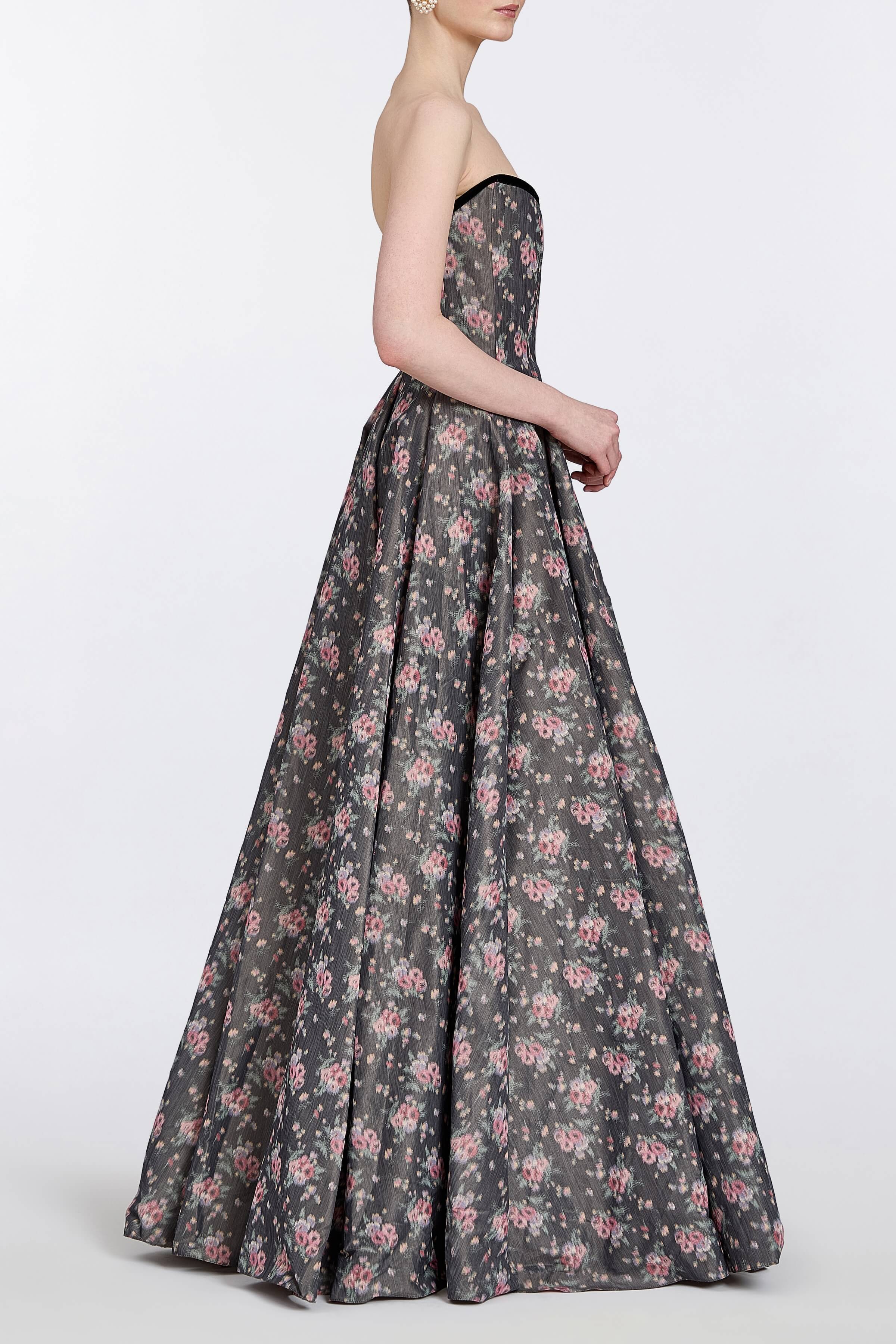 Demetra Watercolor Floral Ikat Ruffled Bodice Gown