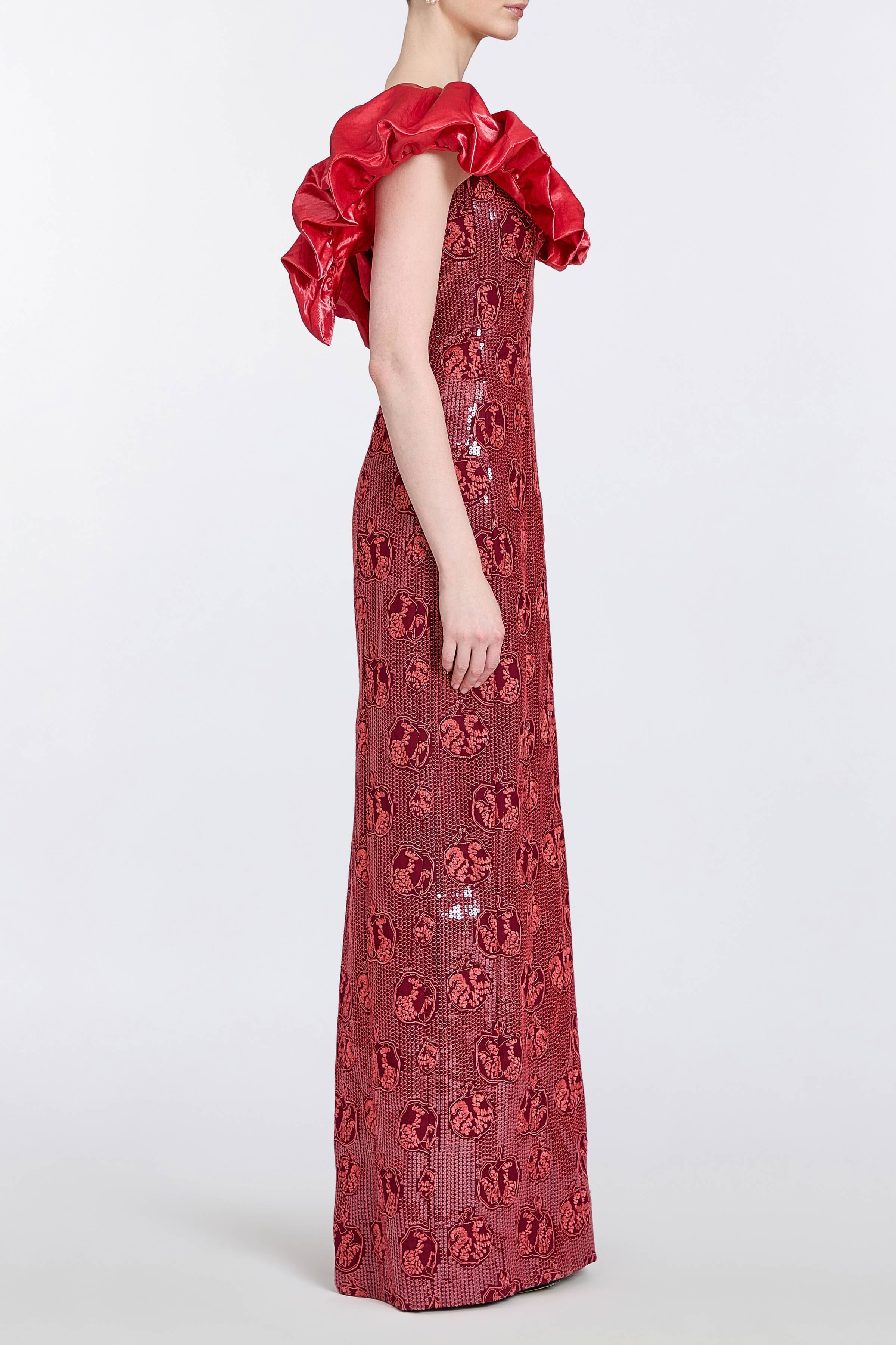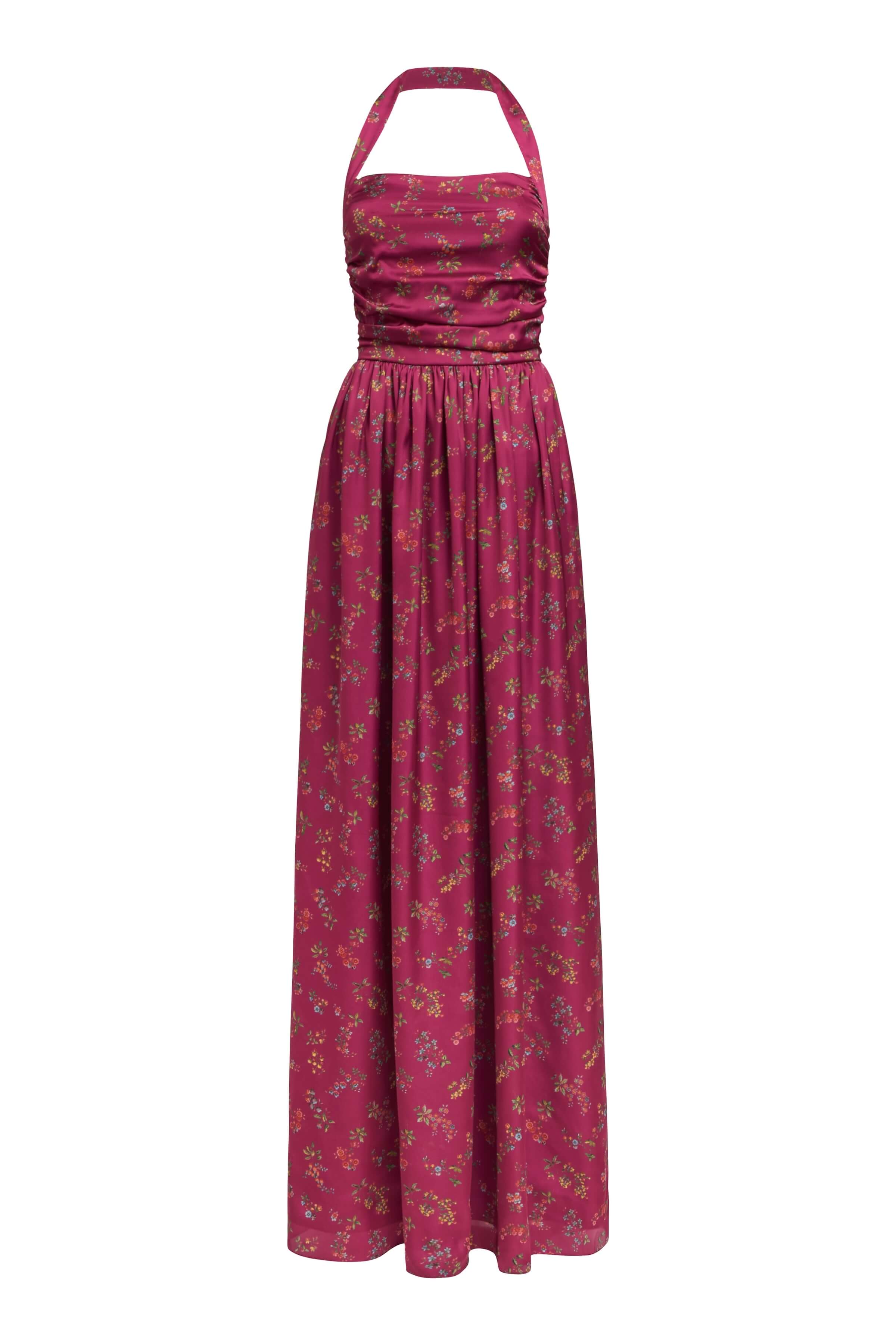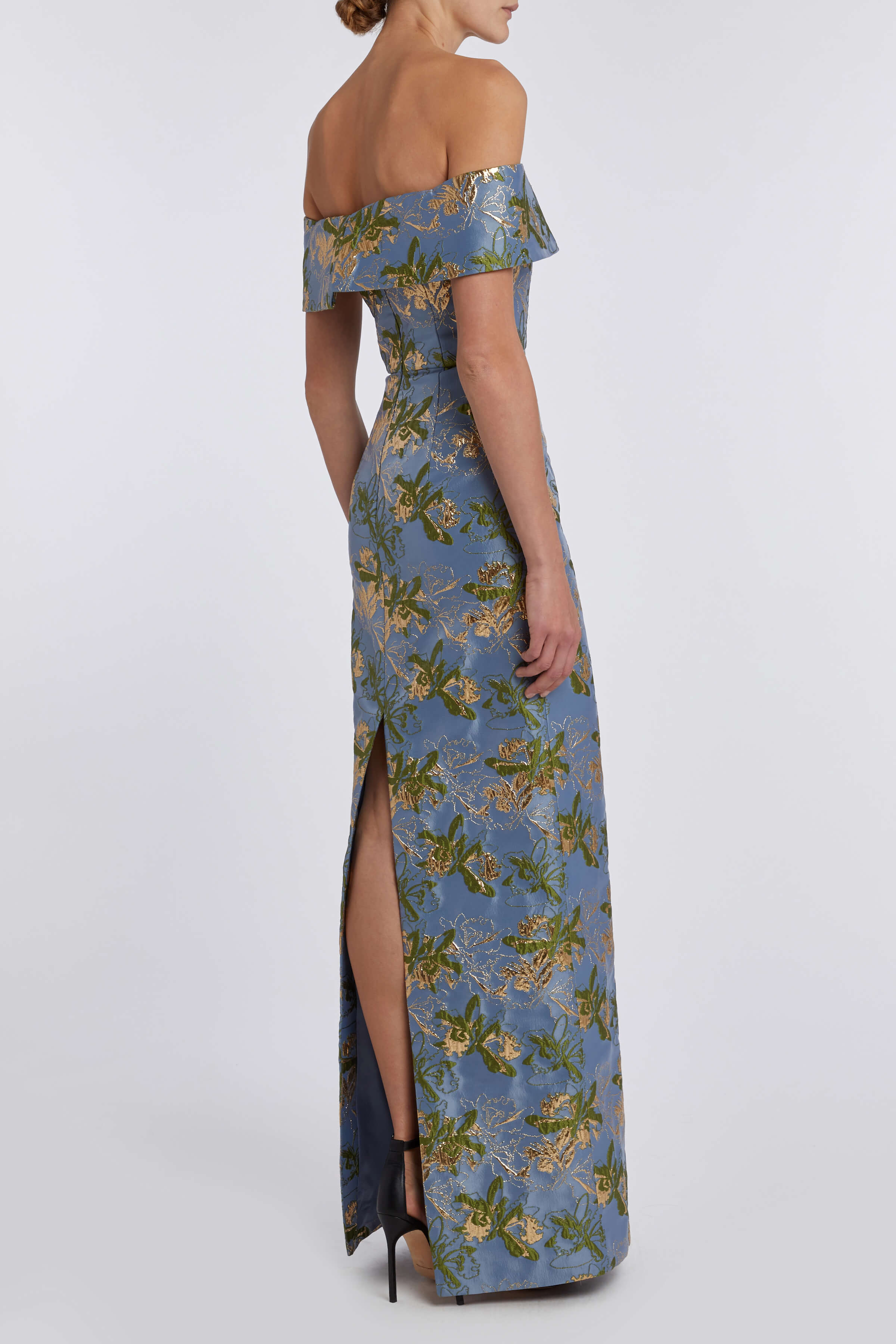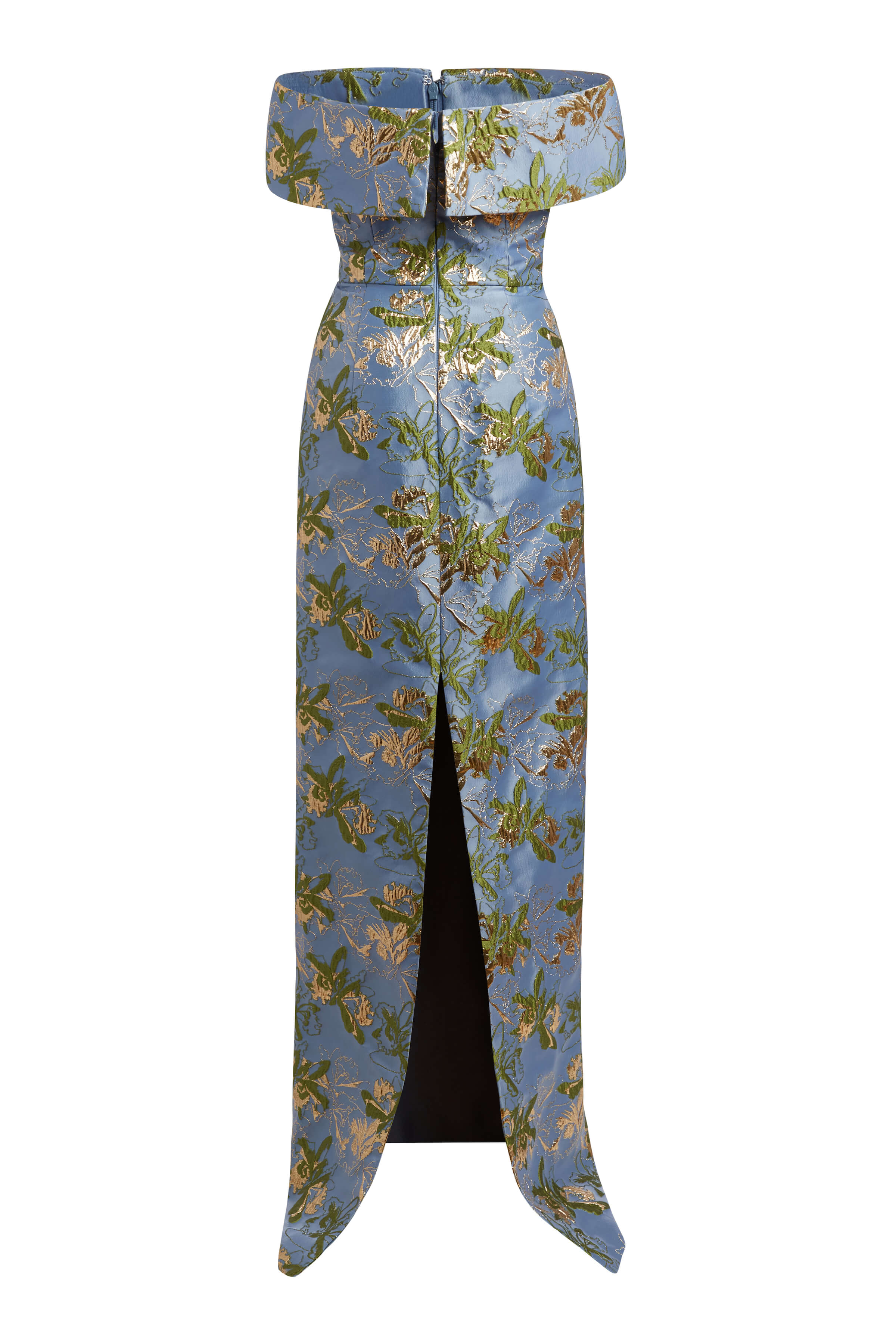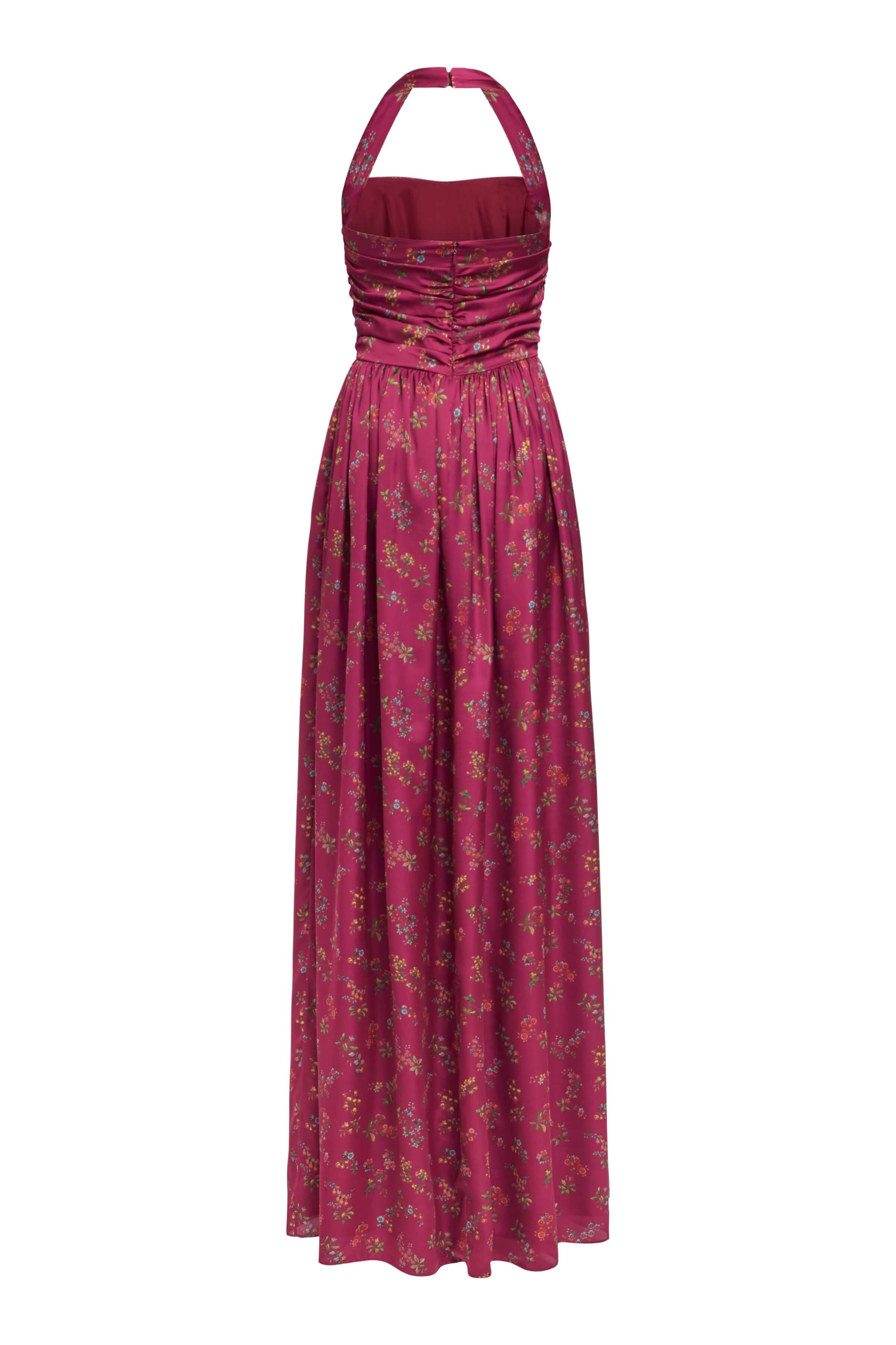 Demetra Watercolor Floral Ikat Ruffled Bodice Gown