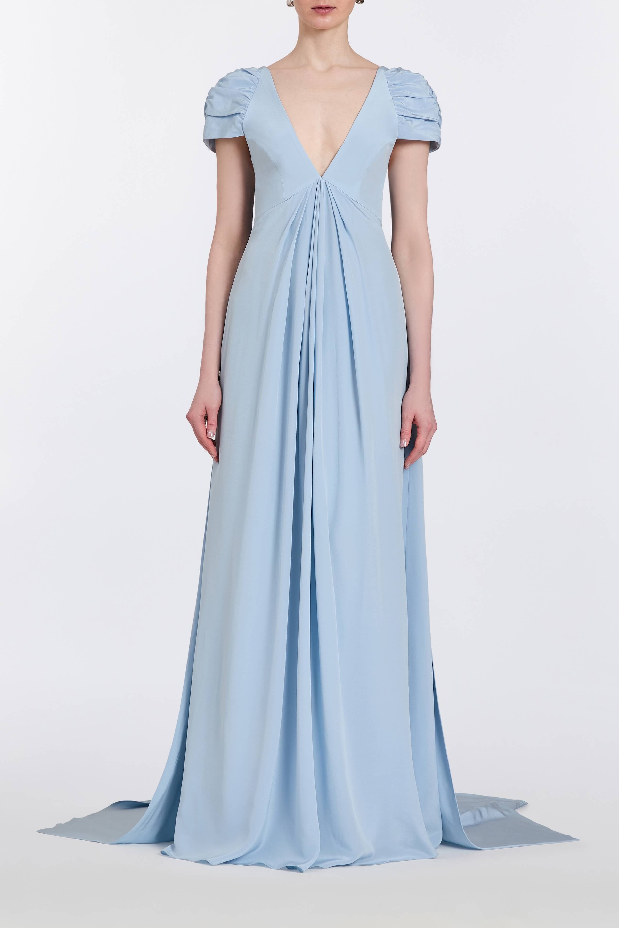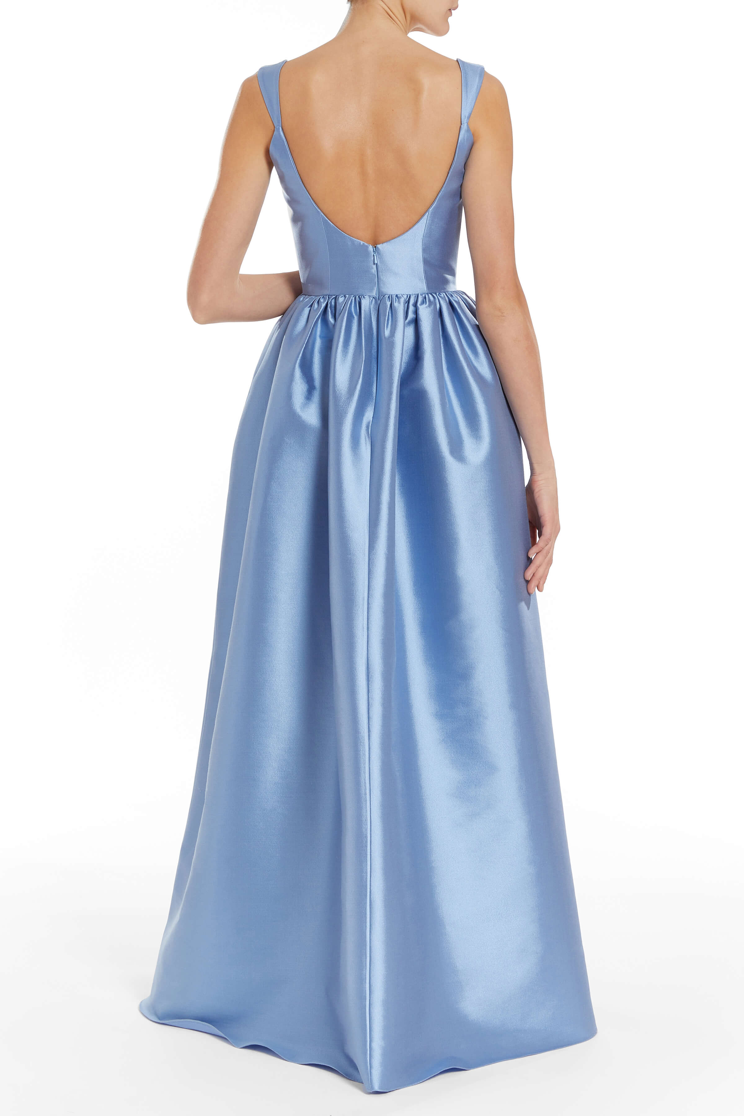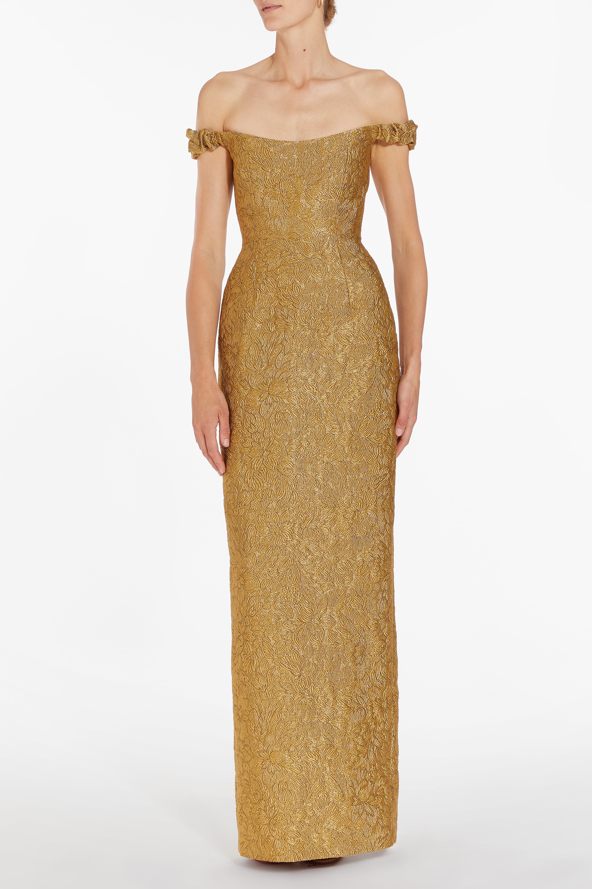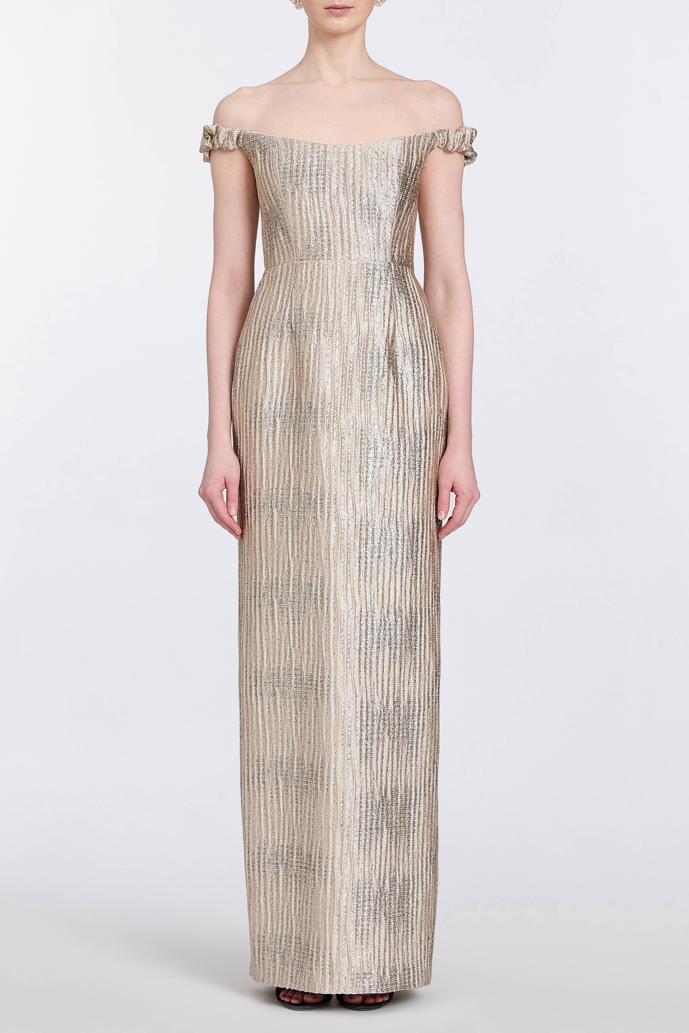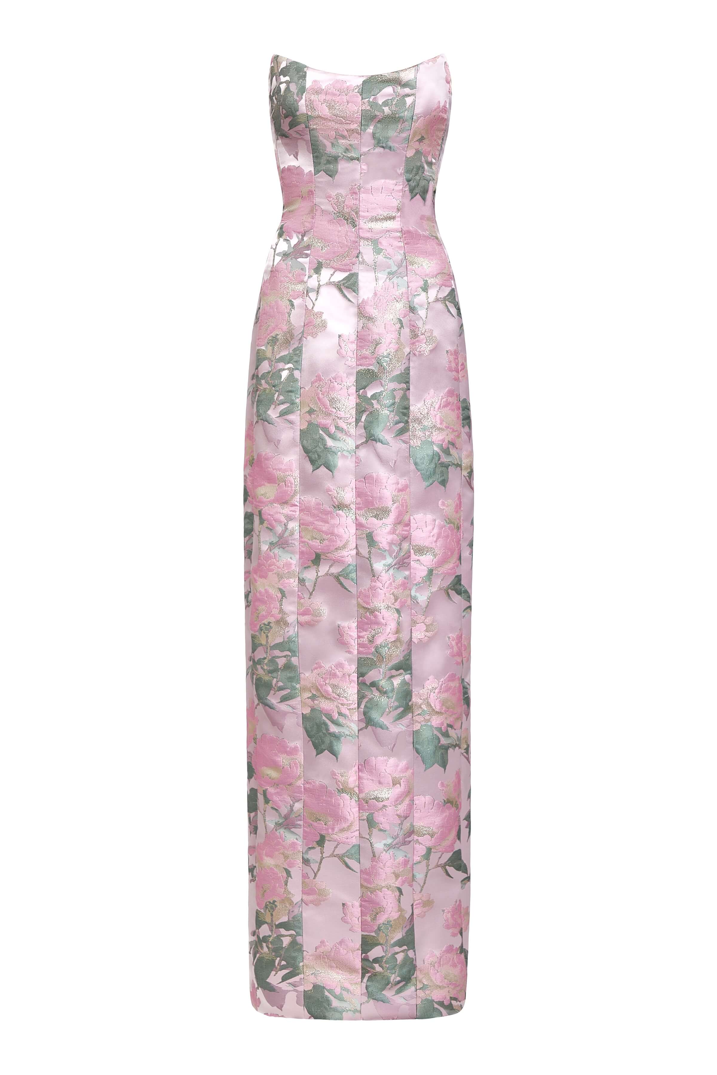 Demetra Watercolor Floral Ikat Ruffled Bodice Gown