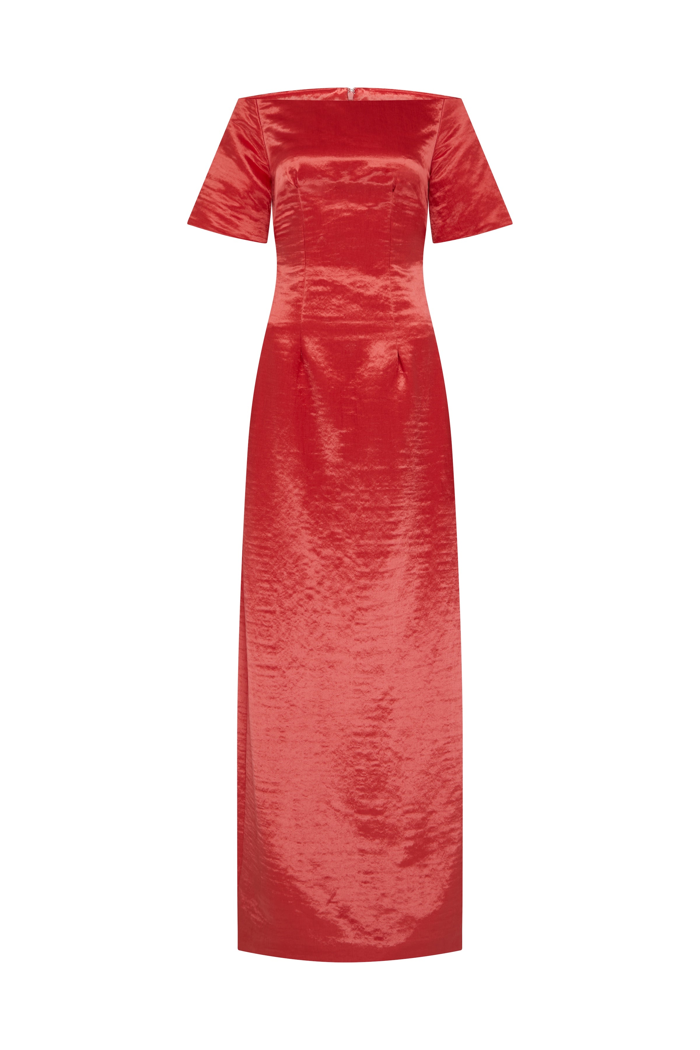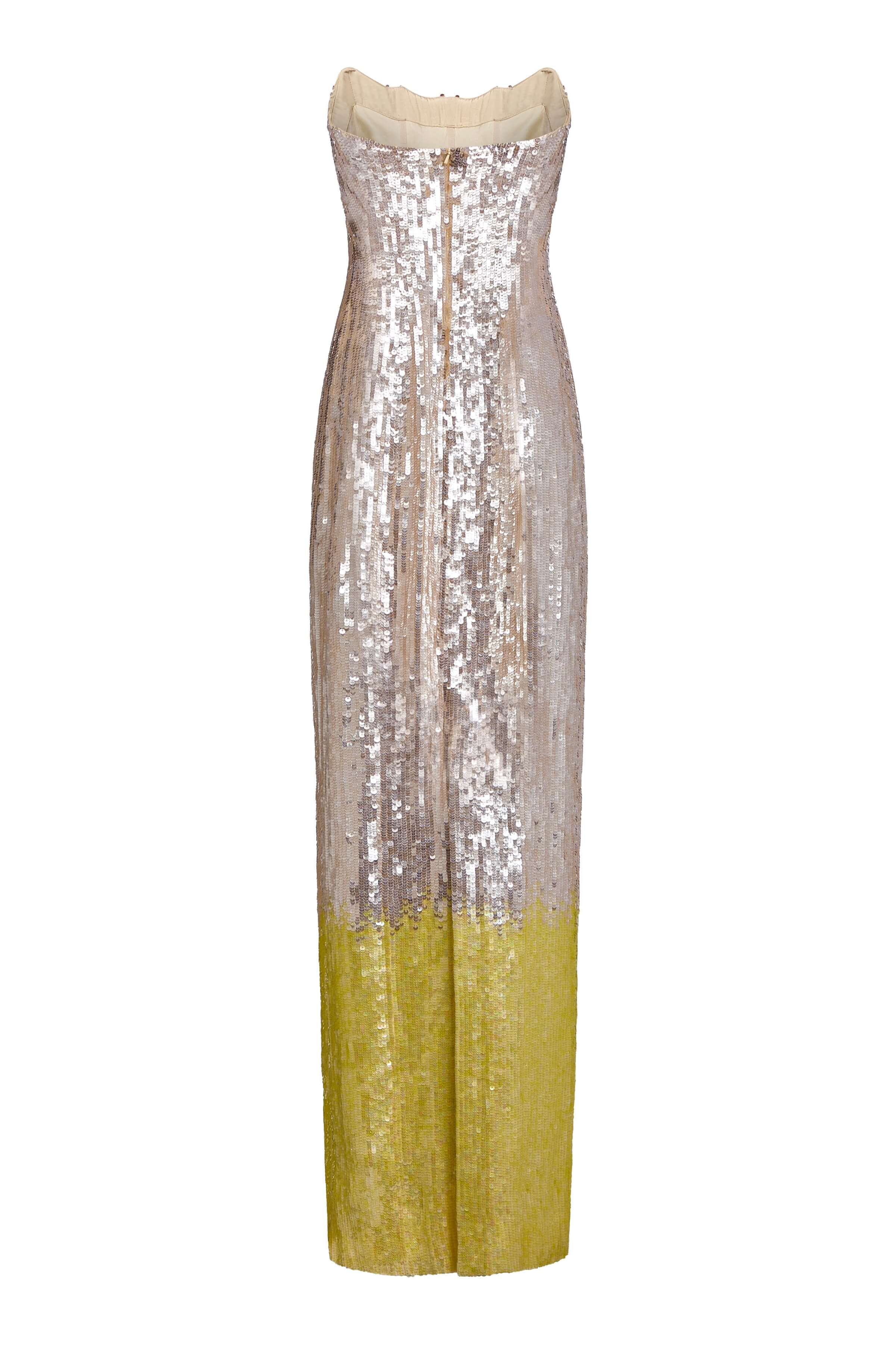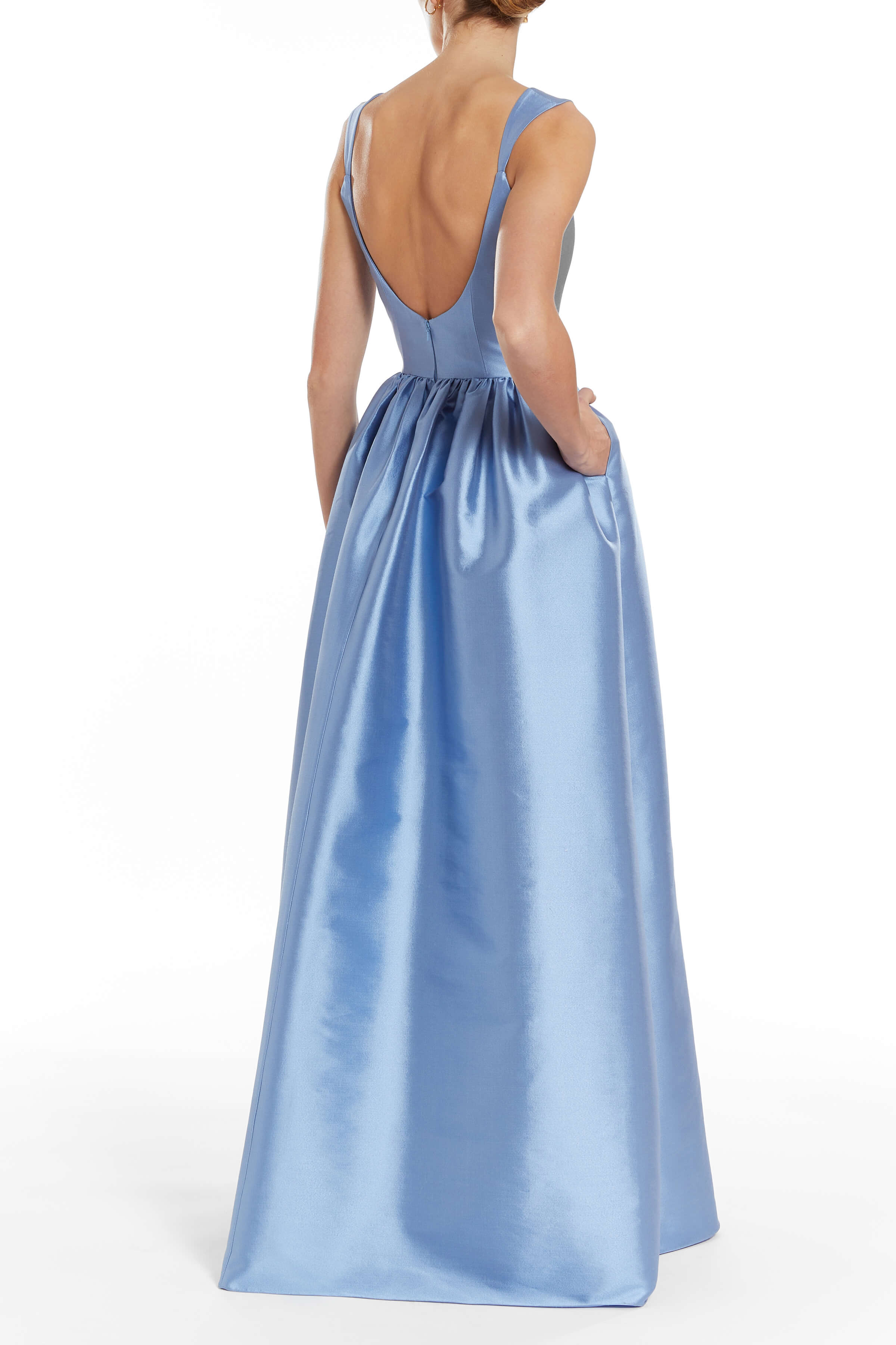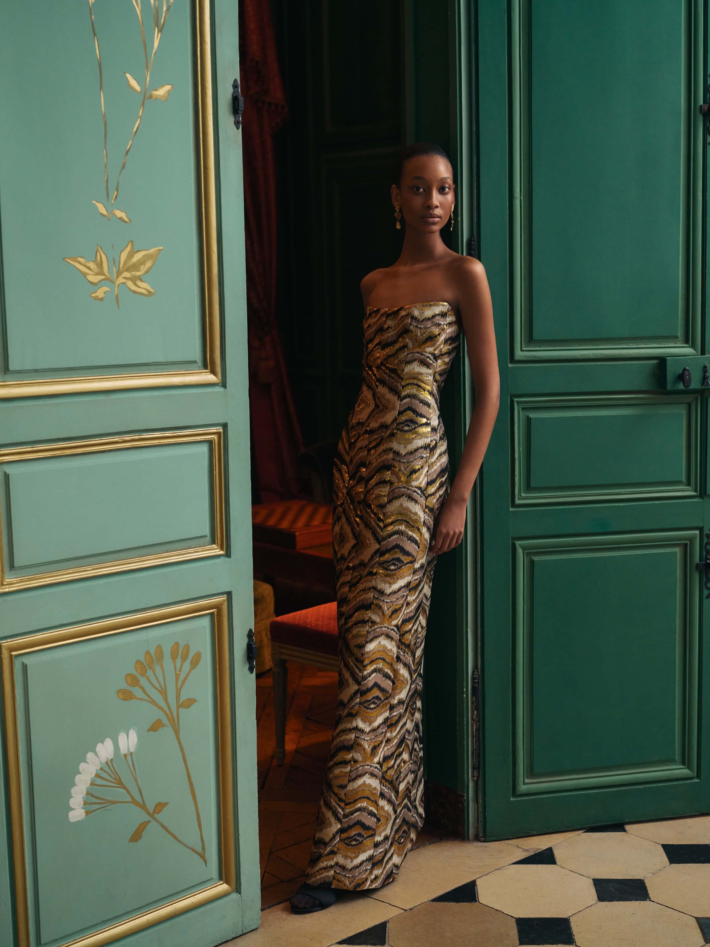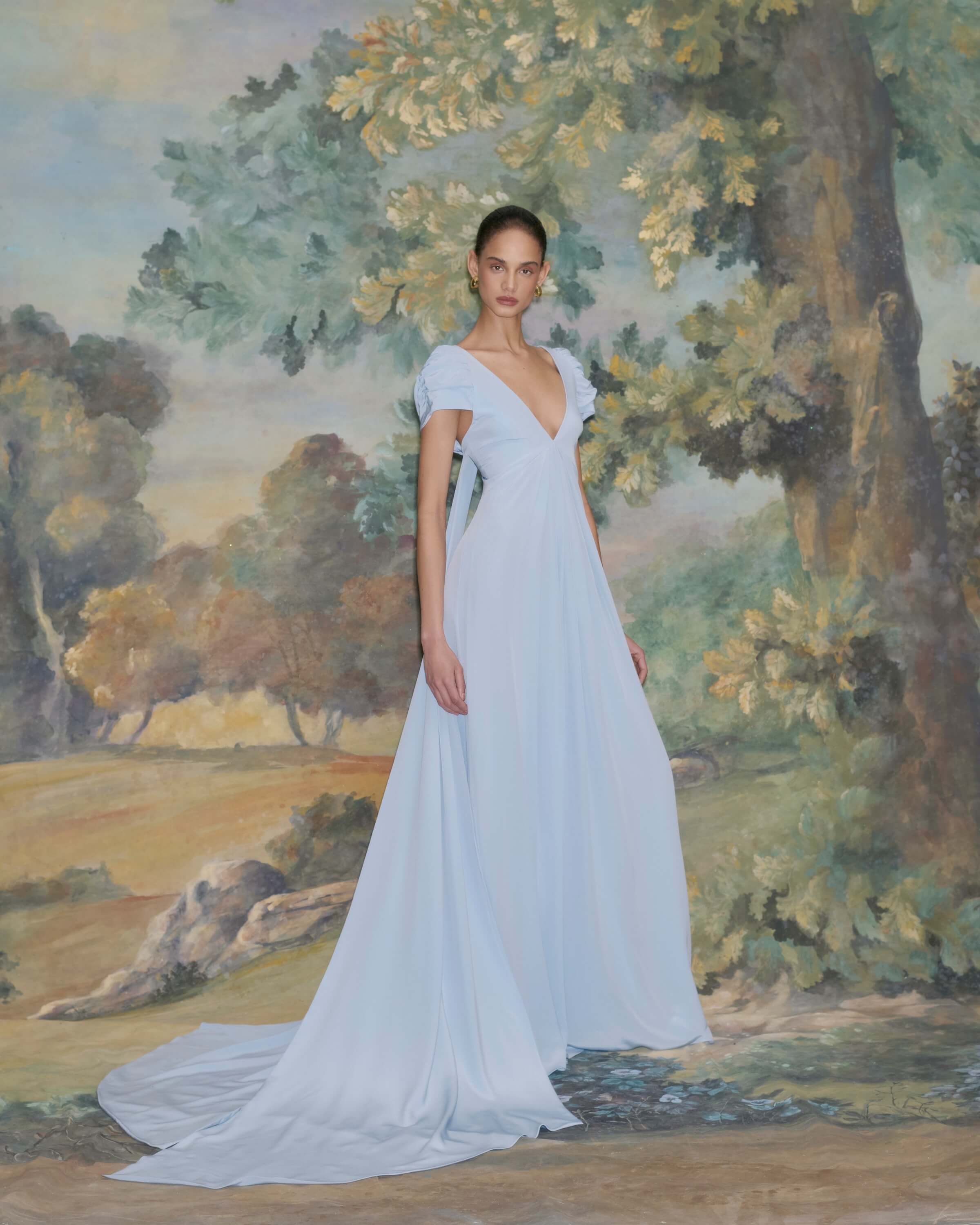 Demetra Watercolor Floral Ikat Ruffled Bodice Gown