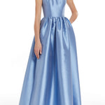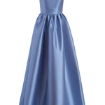 • Periwinkle mikado full skirt corset gown with scooped neckline, contoured straps, and pockets, fully lined