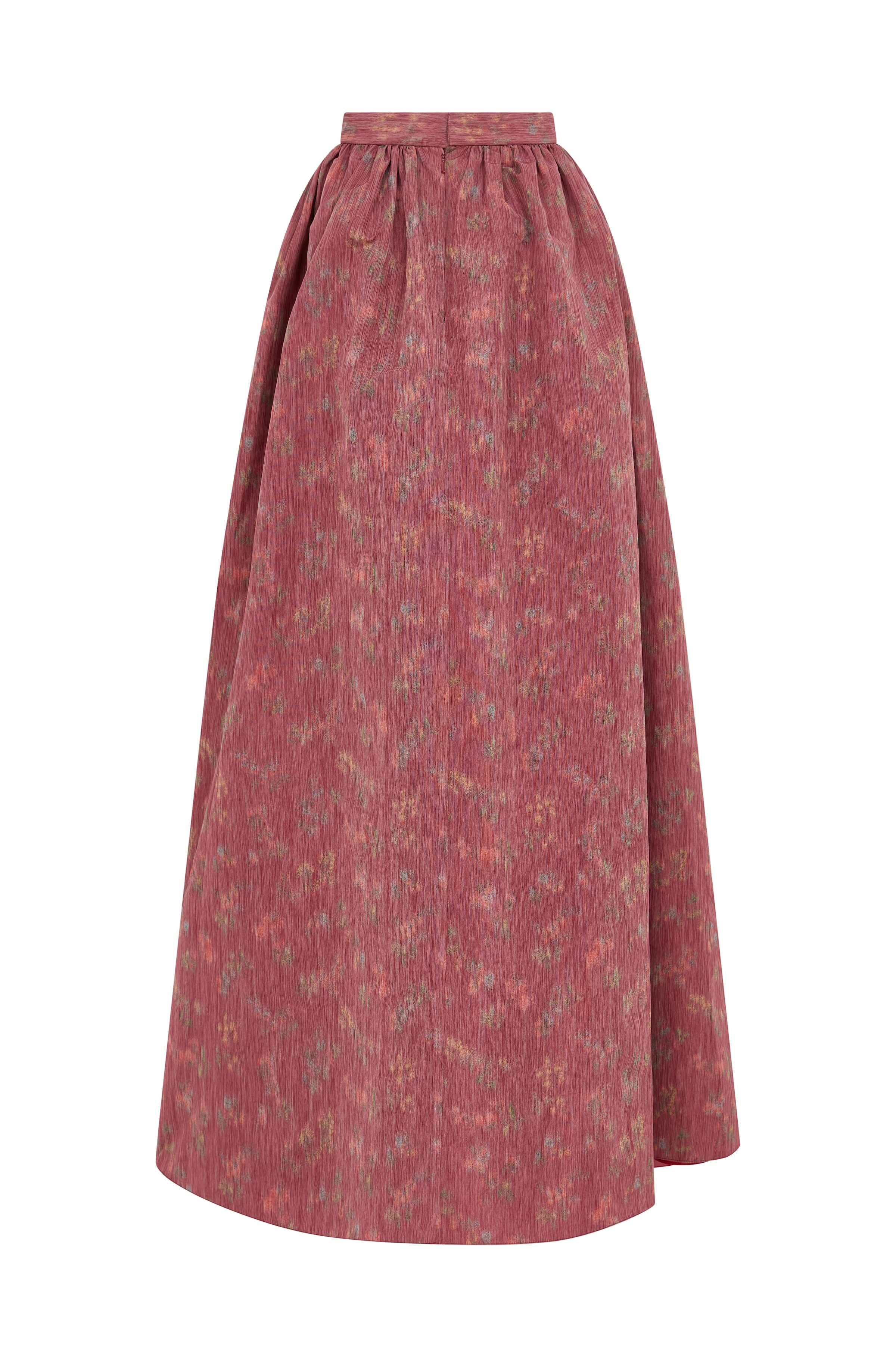 The Morgaine Floral Ikat Full Skirt is styled with the Margery Pomegranate Cotton Shirt in the AW25 lookbook image.