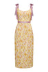 - Daisy stretch brocade round neckline midi dress with tie strap, detachable belt and scoop back, corset bodice, and back slit