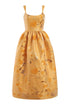 - Yellow floral brocade corset bodice full skirt midi dress with scooped neckline and pockets, fully lined