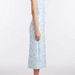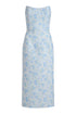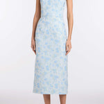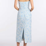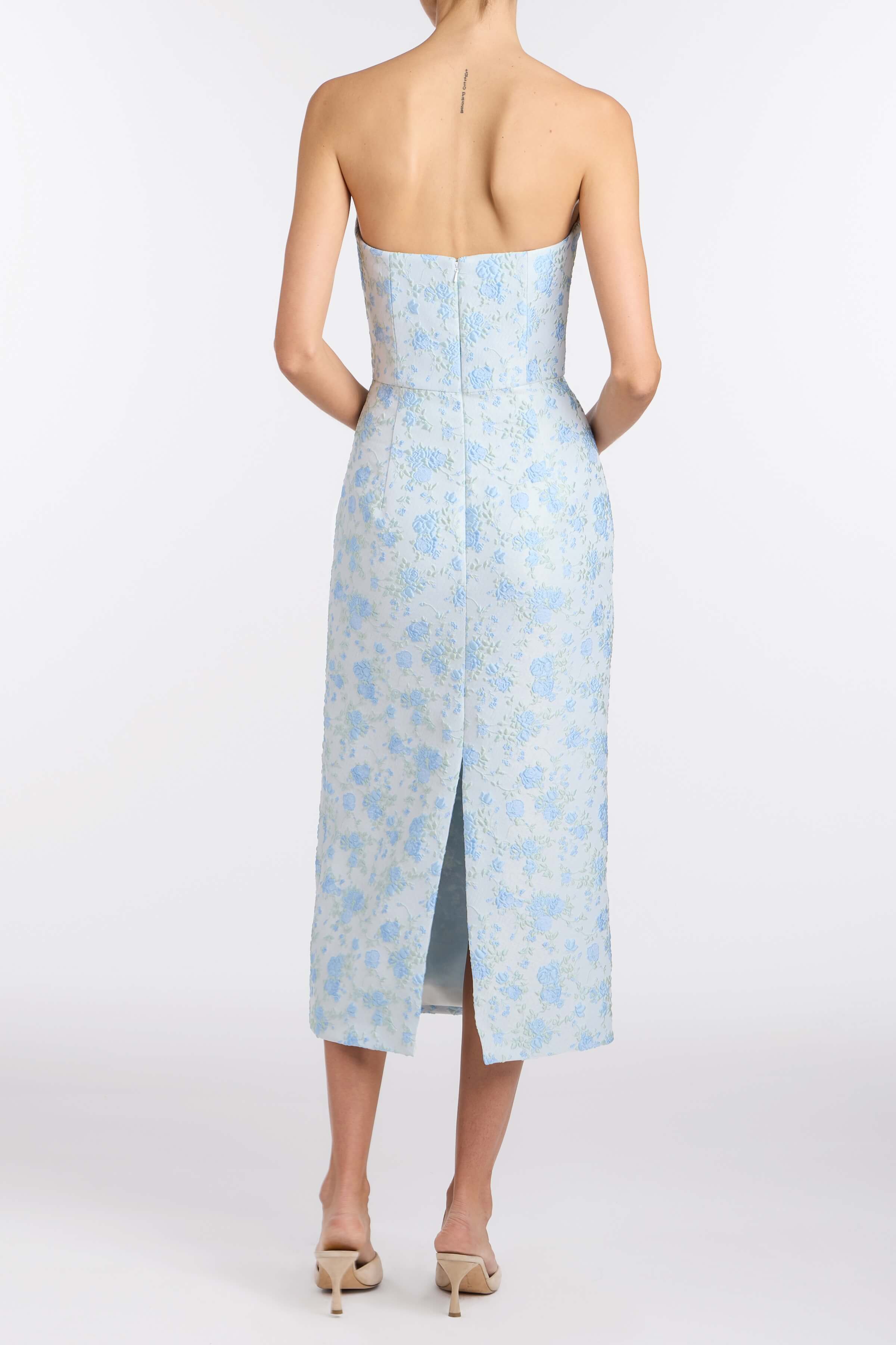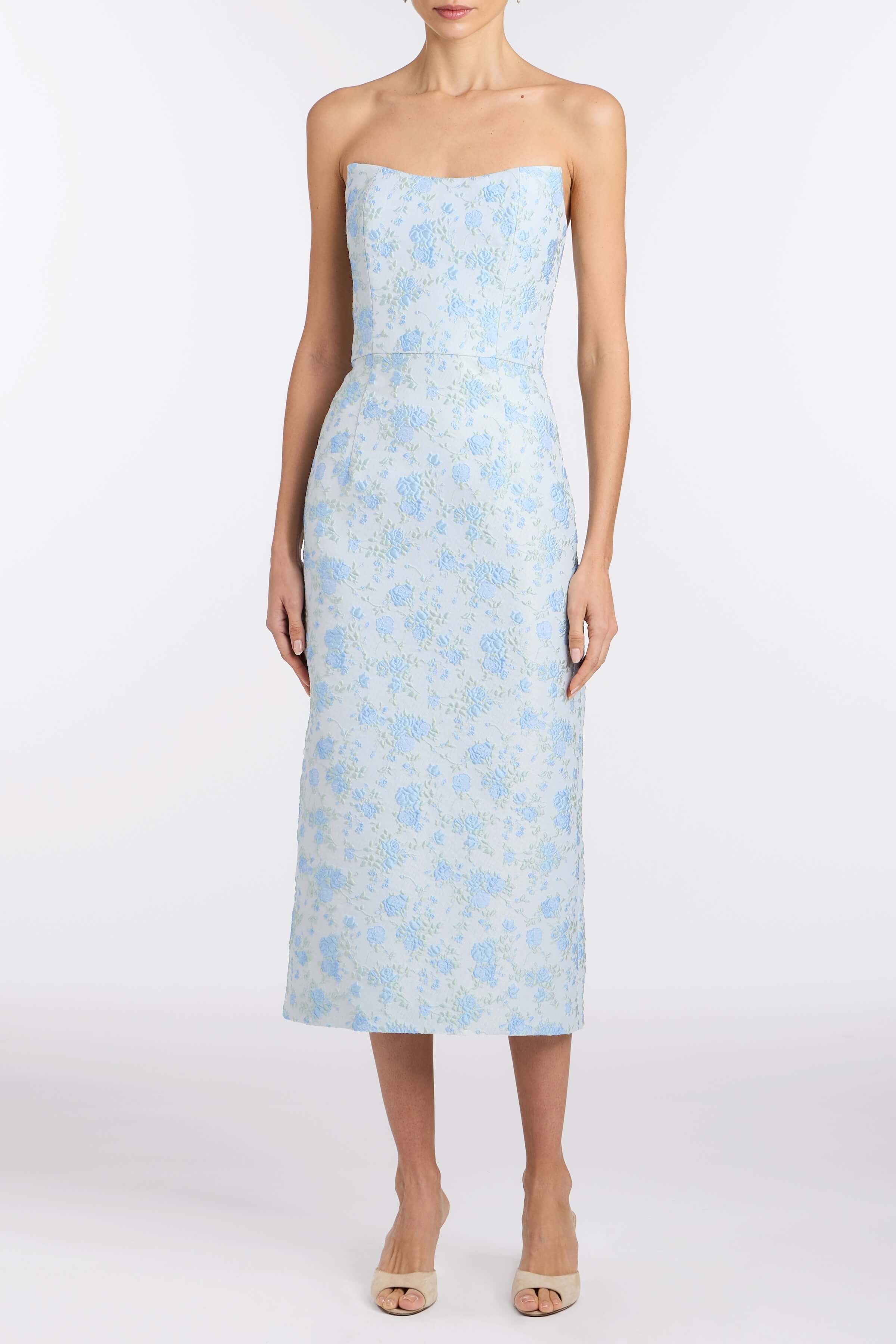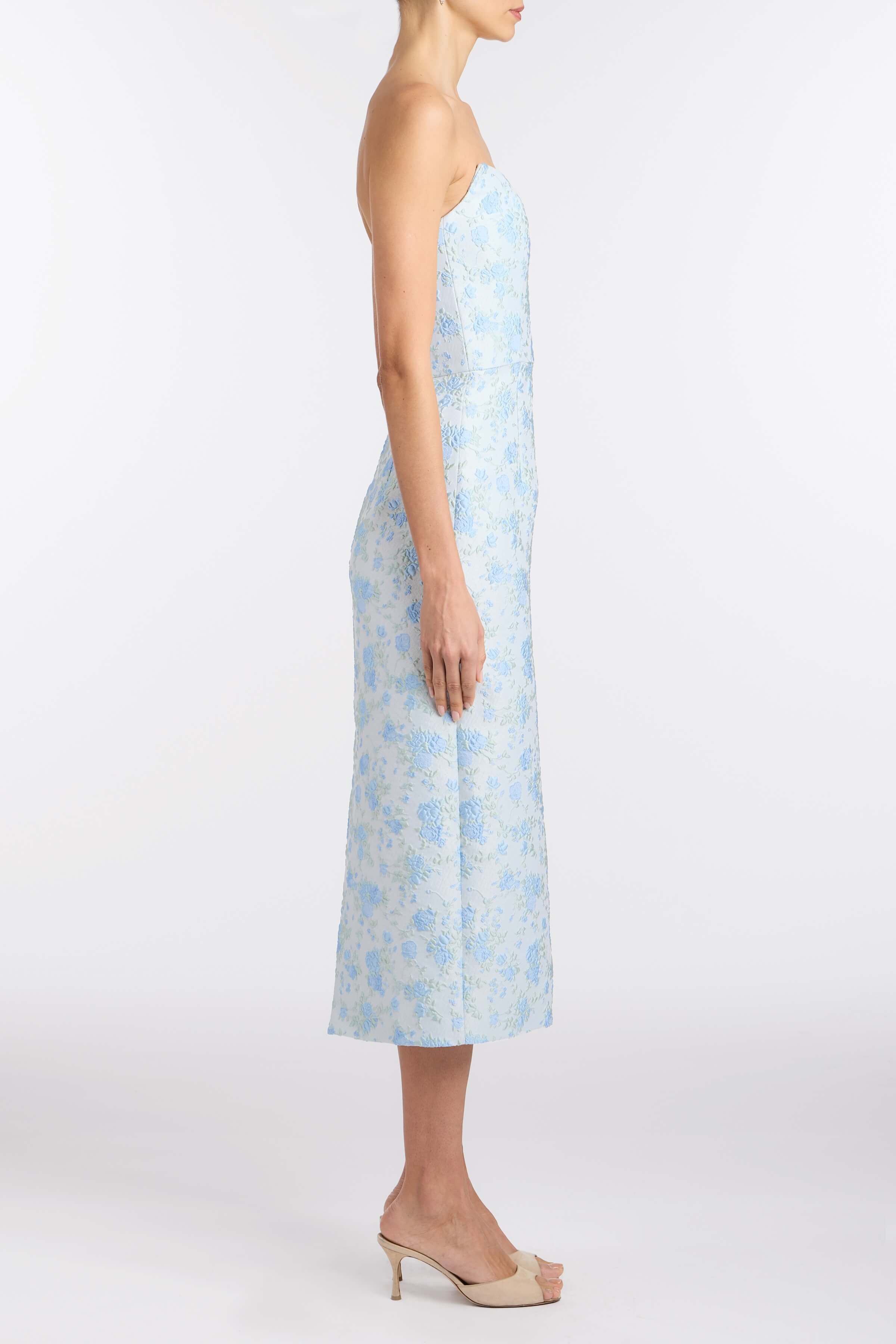 - Cornflower and mint floral brocade scooped strapless neckline and midi column skirt with back slit