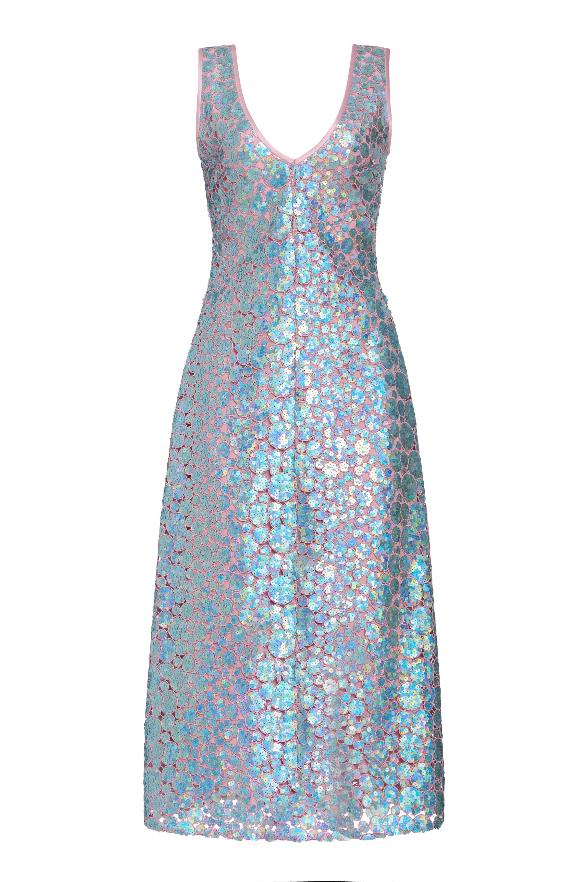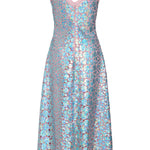 - V-neck midi dress with fringe hem and silk piping, fully lined