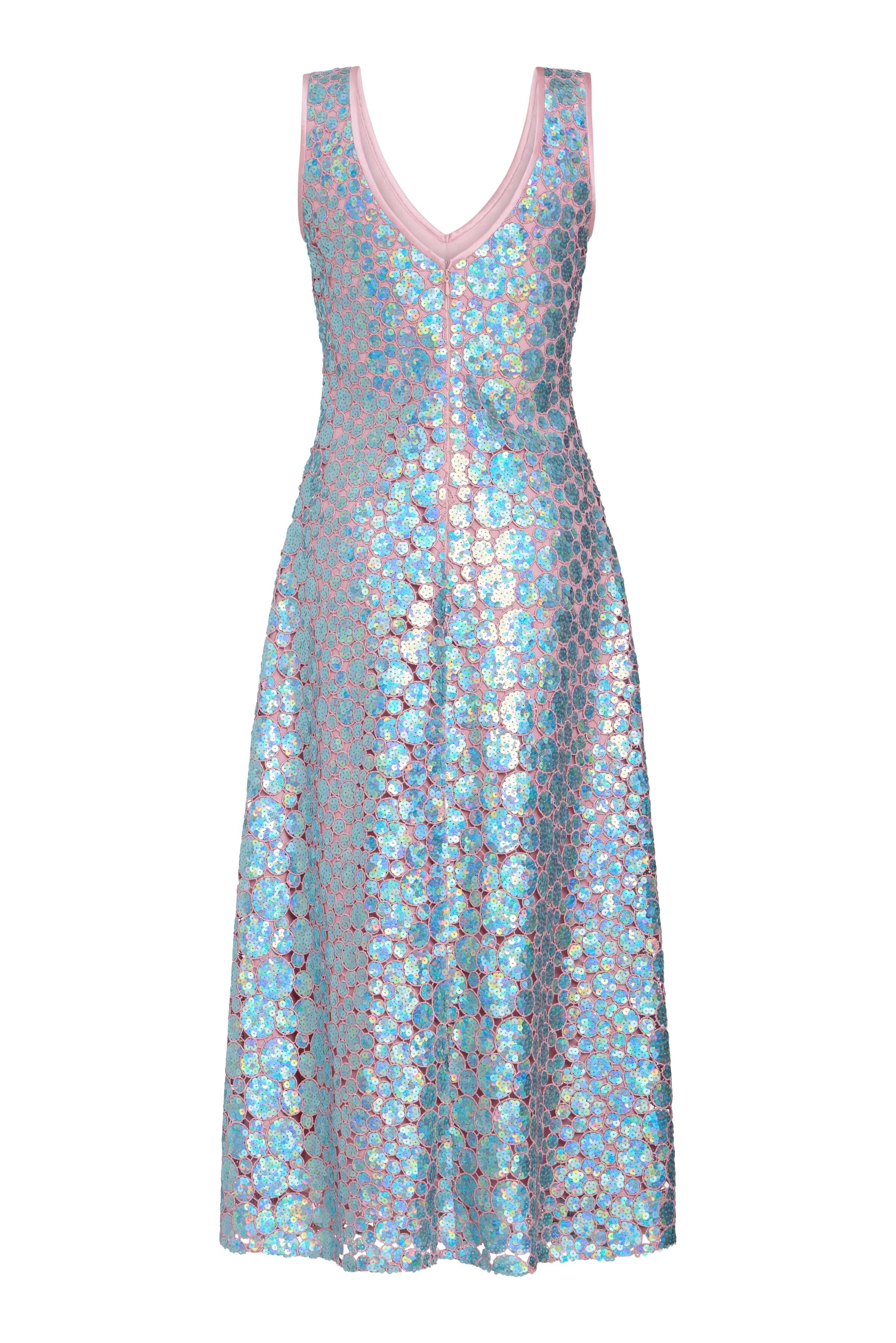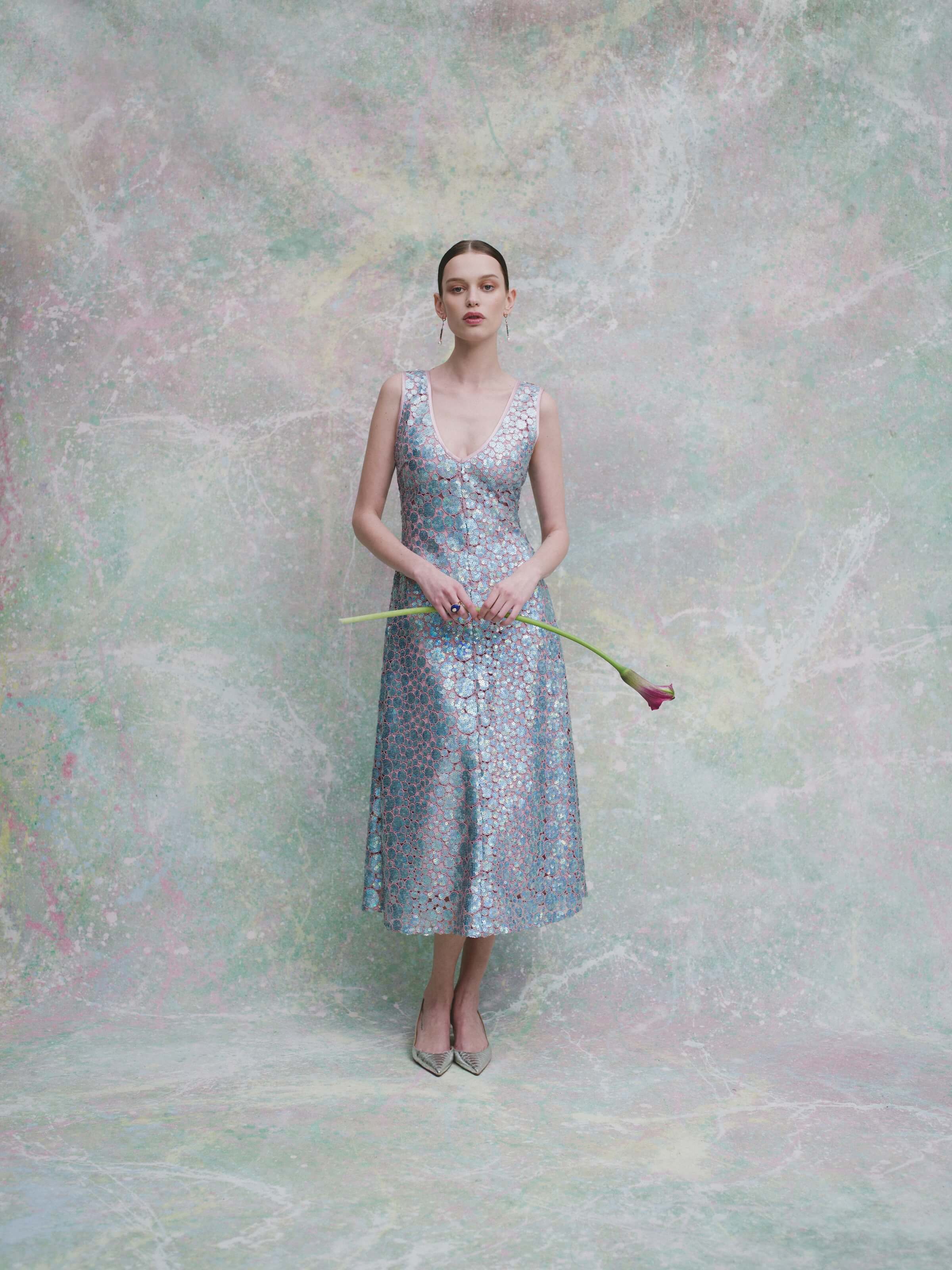 Rousseau Powder Blue Floral Cloque Midi Dress