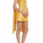 • Yellow floral brocade A-line silhouette mini dress with scooped neckline and matching shoulder bows, fully lined