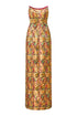 - Scoop neck strapless column gown with contrast binding and back slit, fully lined