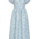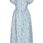 - Cornflower and mint floral brocade v-neck midi dress with puffed sleeves, fully lined