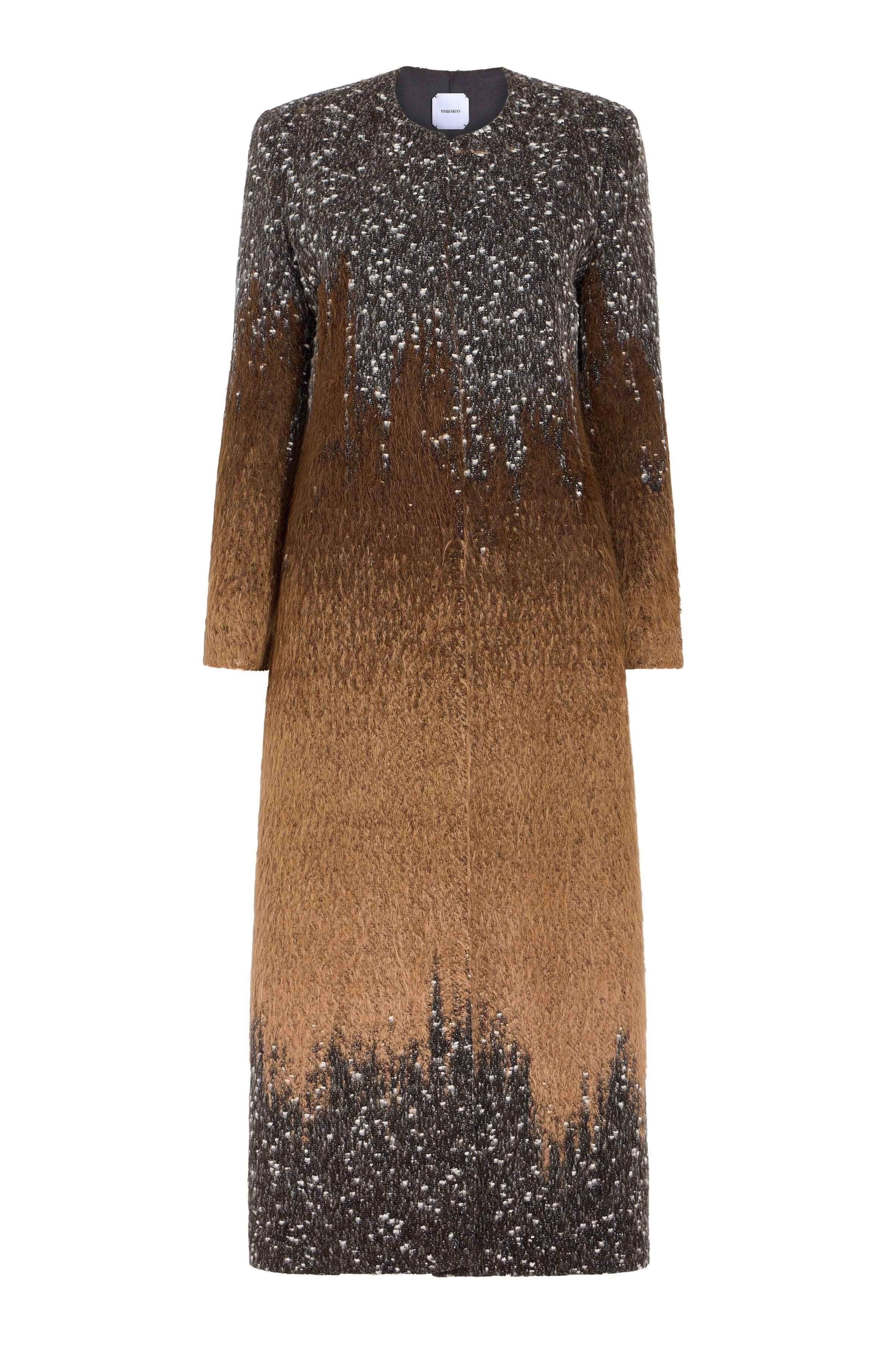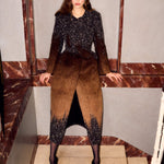 - Speckled brown ombre wooly shearling collarless coat with pockets and a self tie belt, fully lined.