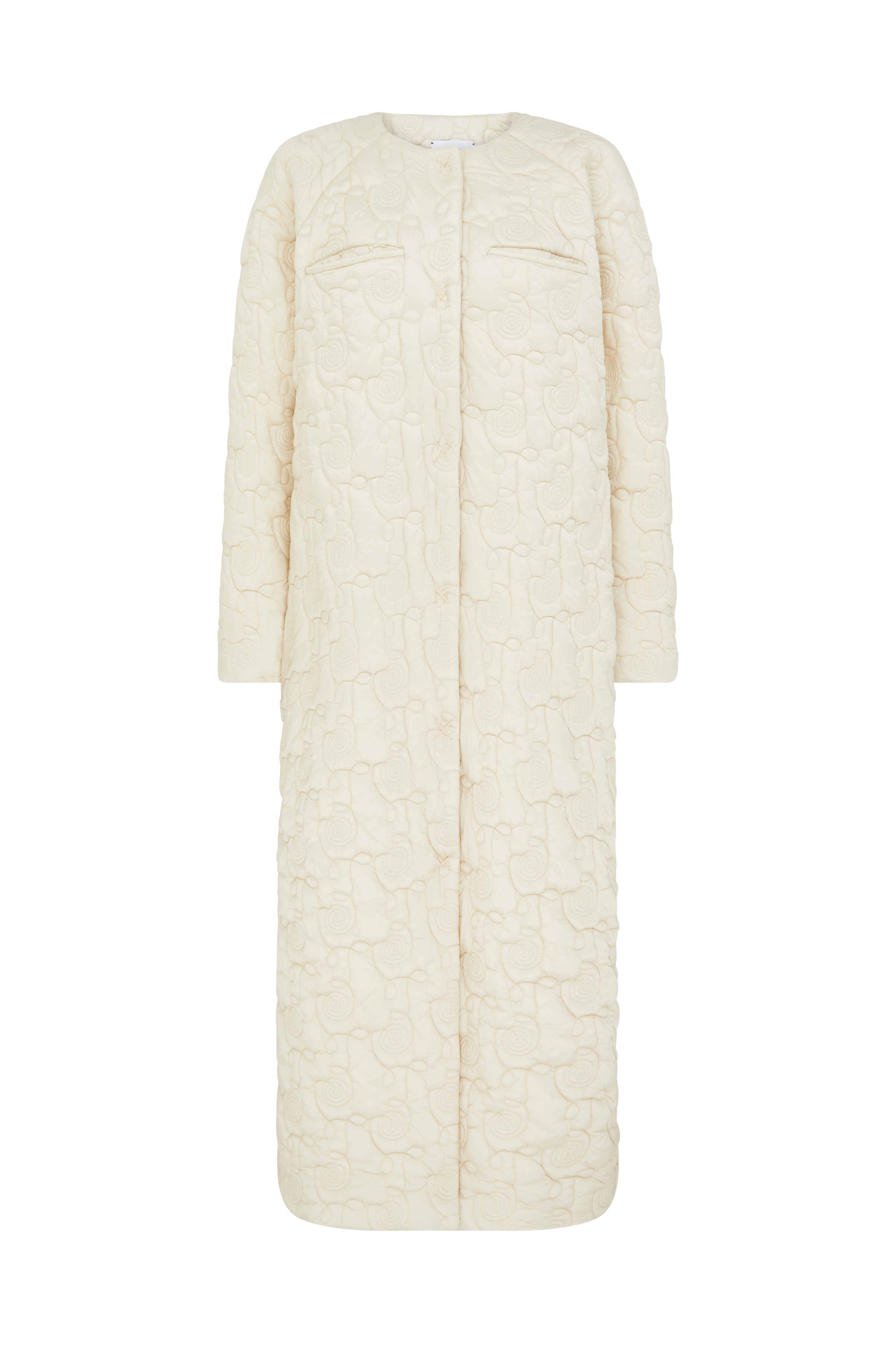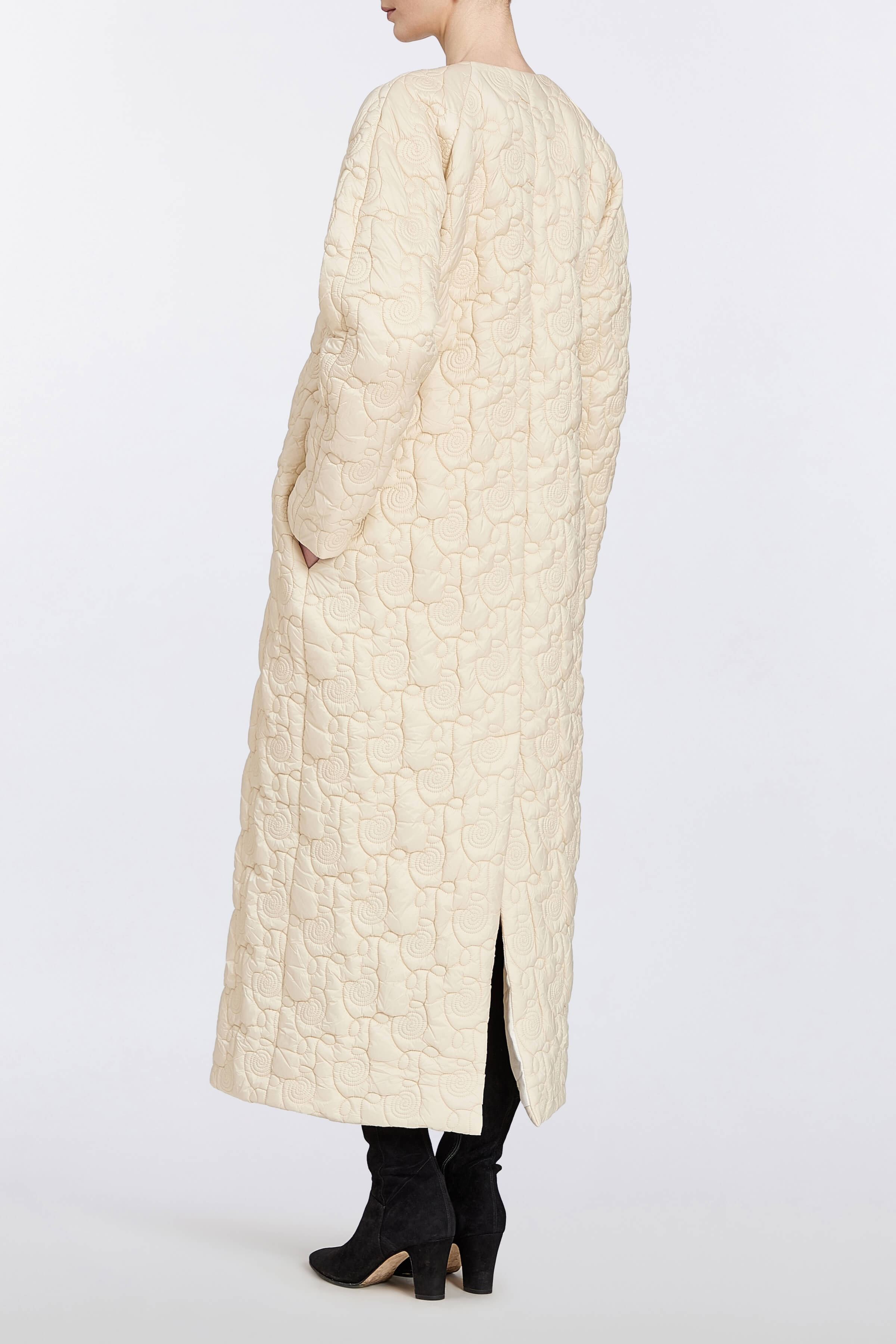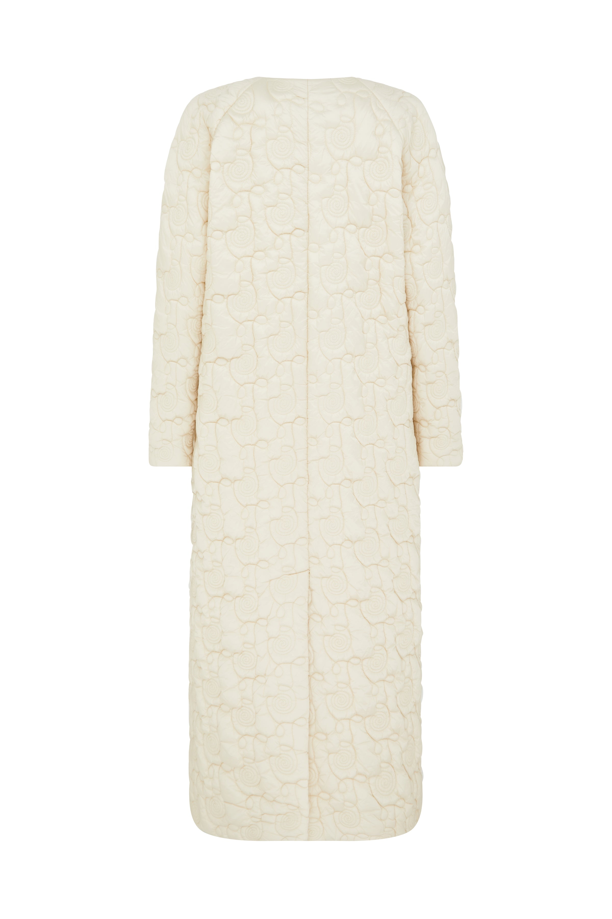 - Quilted ivory swirl long coat with raglan sleeve and pockets, fully lined
