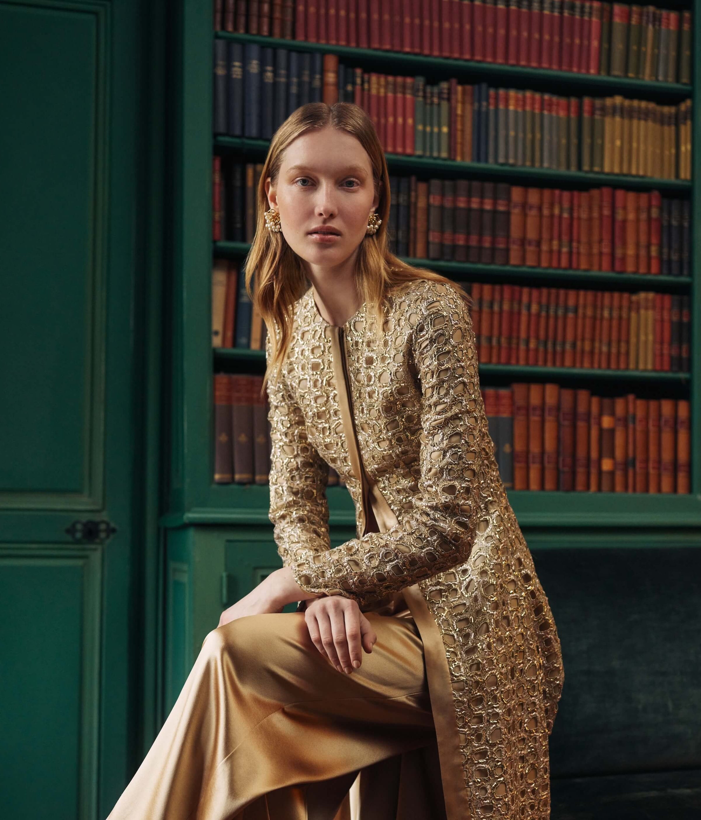 The Isolde Gold Satin Pant is styled with the Beatrice Gold Sequin Top in the AW25 lookbook image.