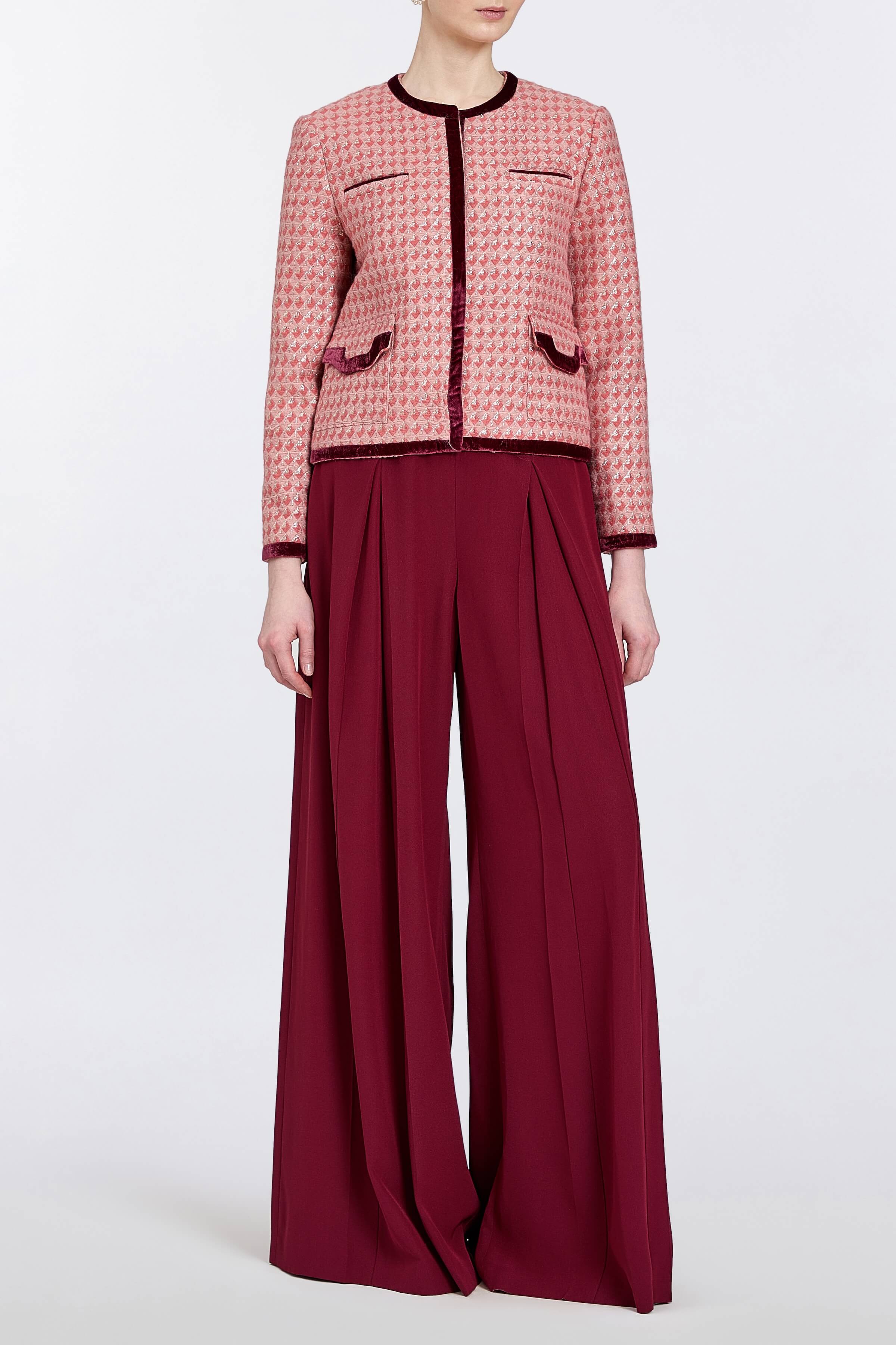 The Lois Satin Pleated Wide Leg Pant is styled with the Helen Tweed and Velvet Jacket in the AW25 lookbook.