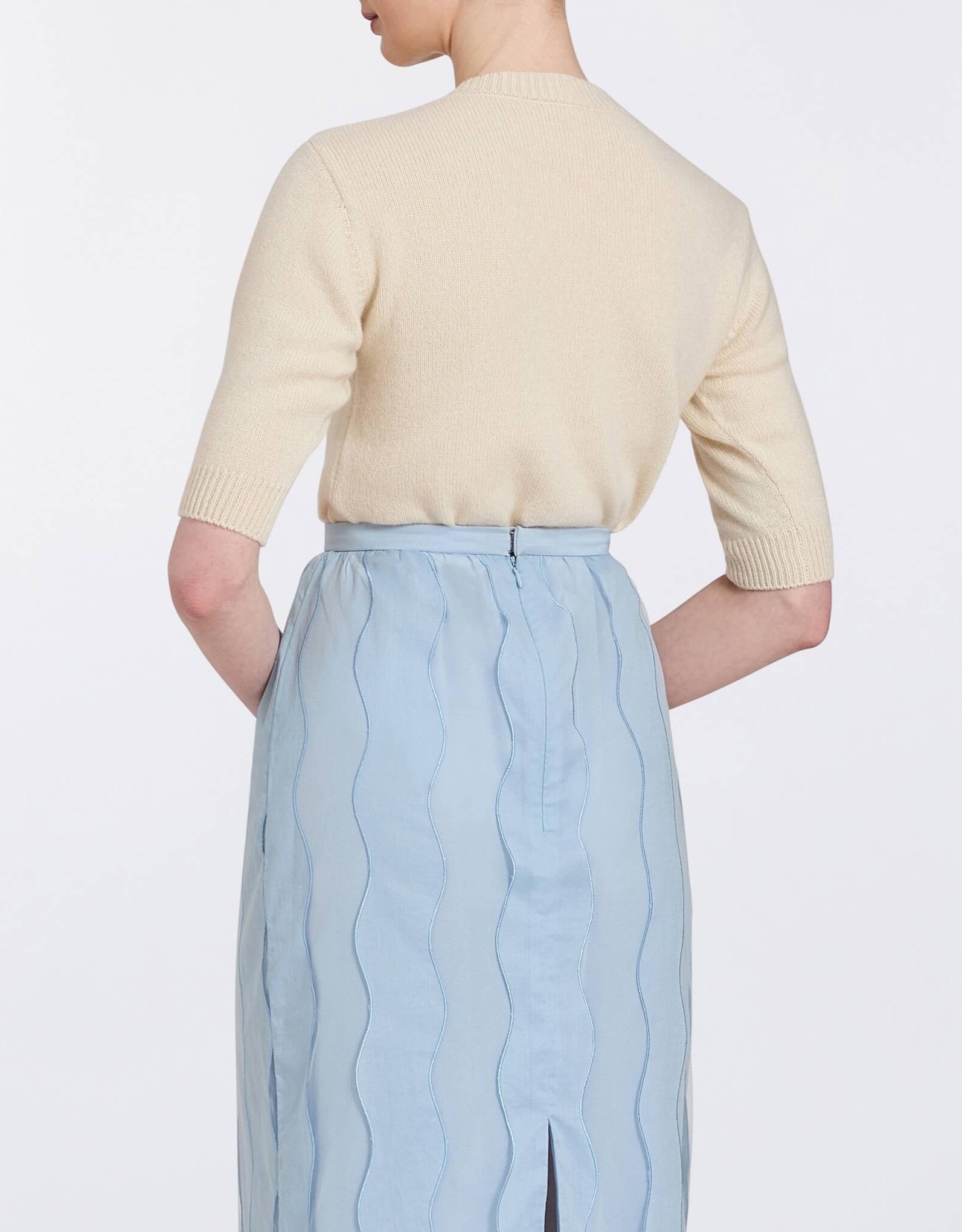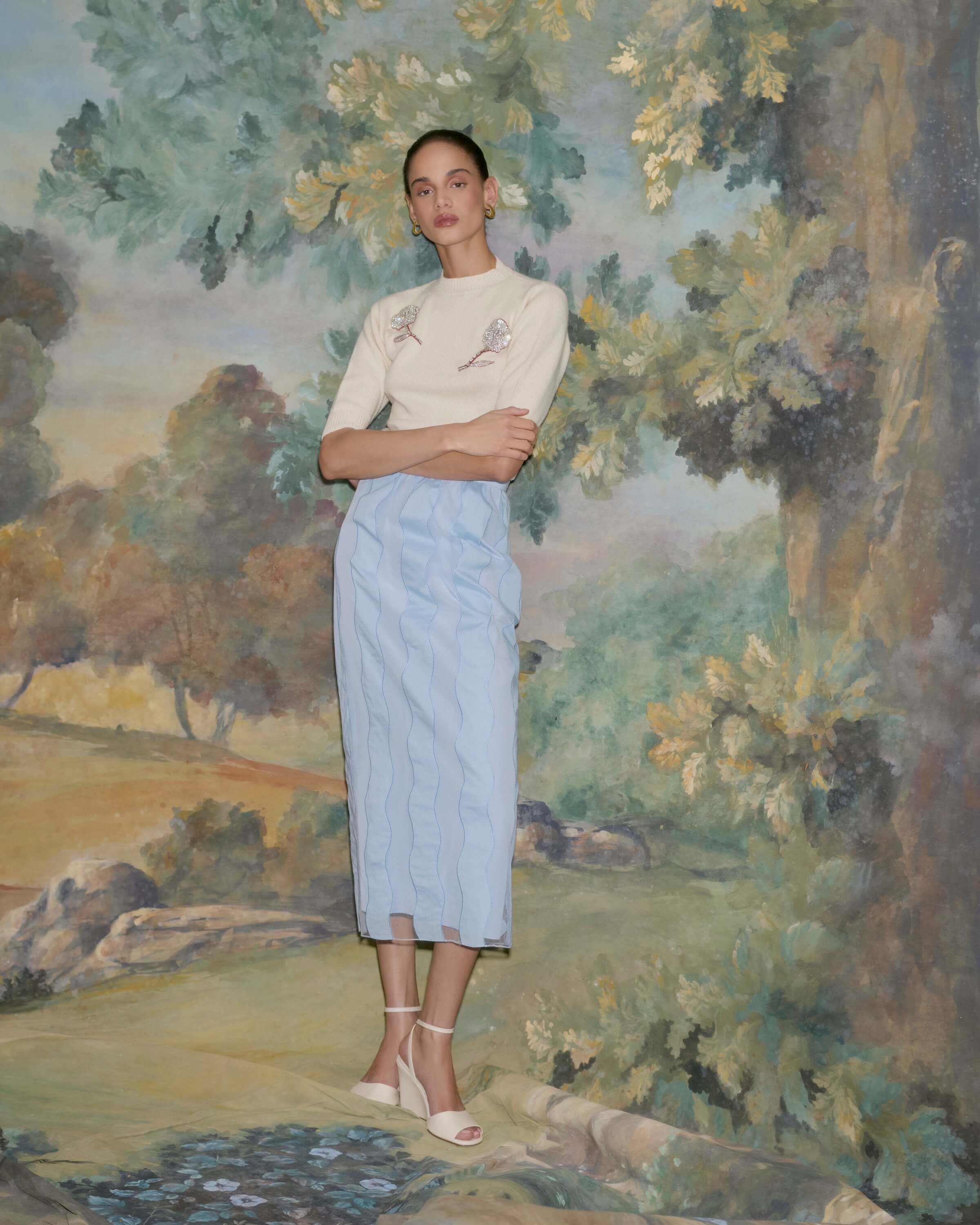 - The Posy Off White Sweater with Floral Beaded Patches is styled with our Lucy Light Blue Wave Pencil Skirt