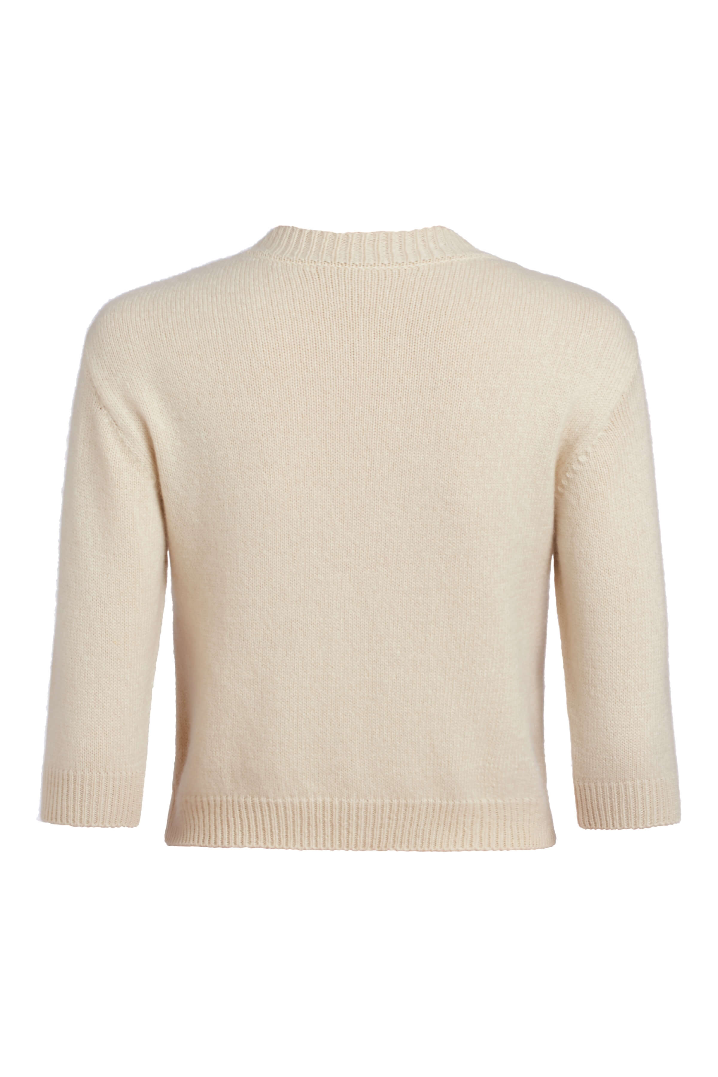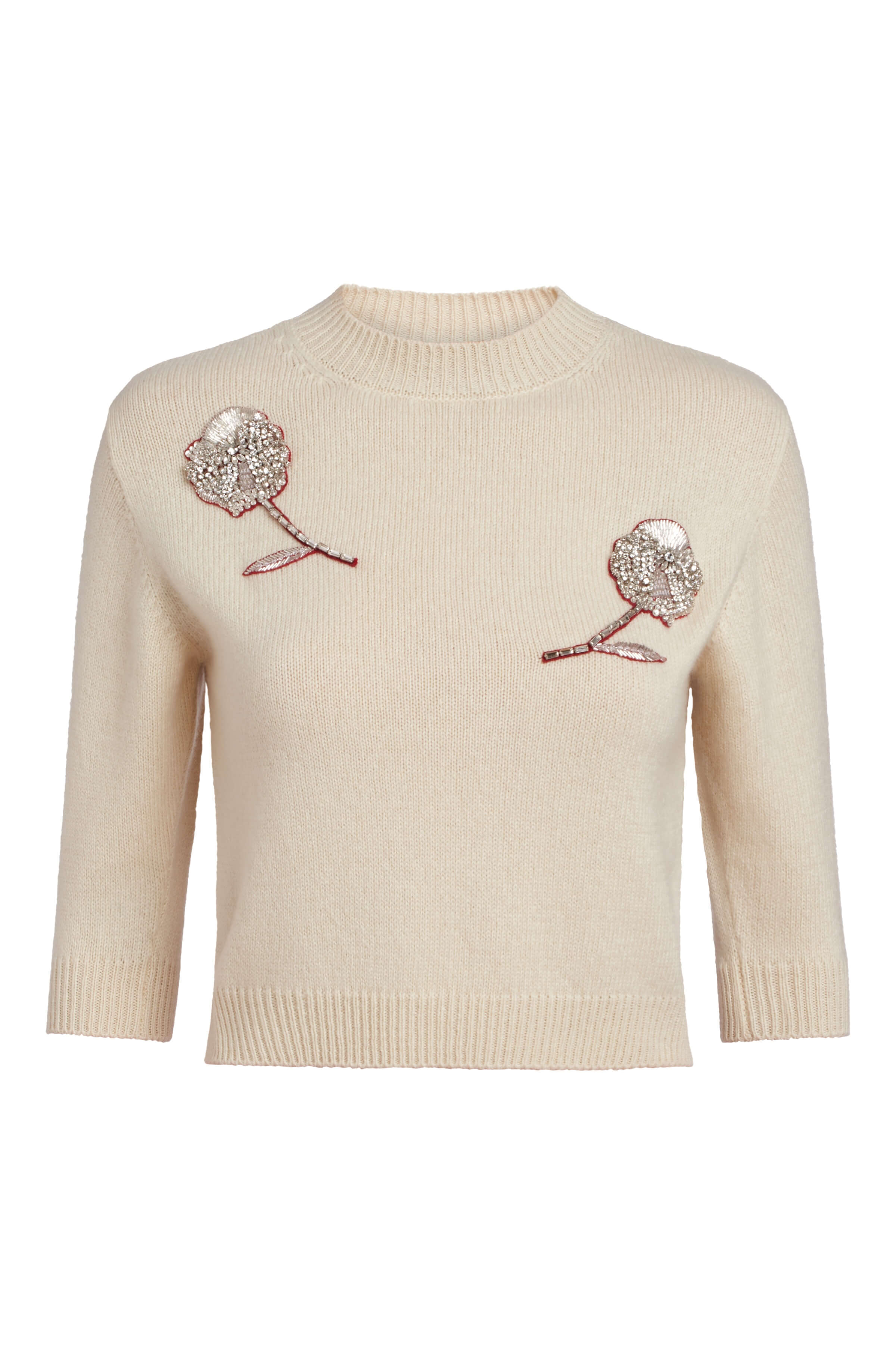 - Cashmere, short sleeve crewneck with floral beaded patches, unlined