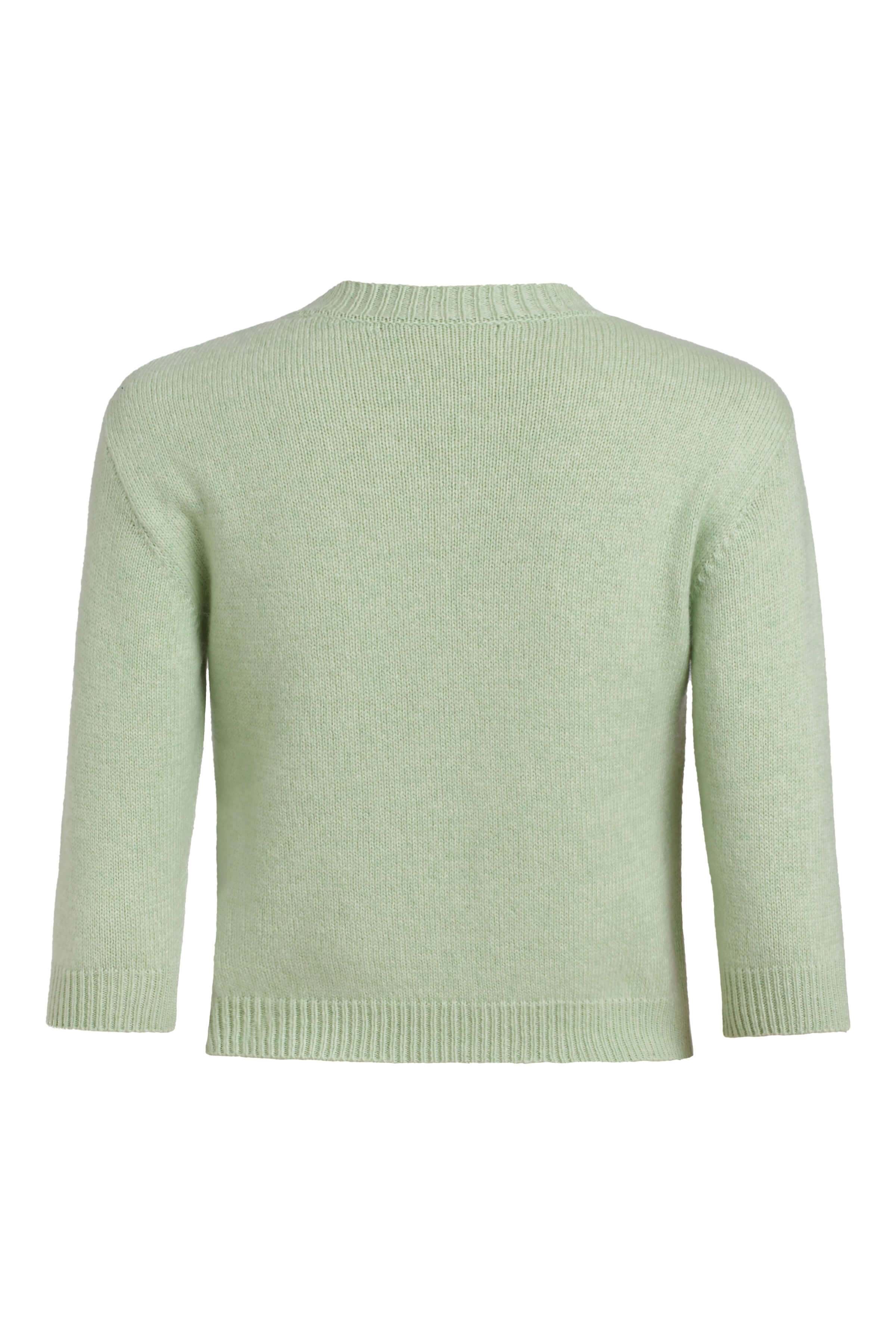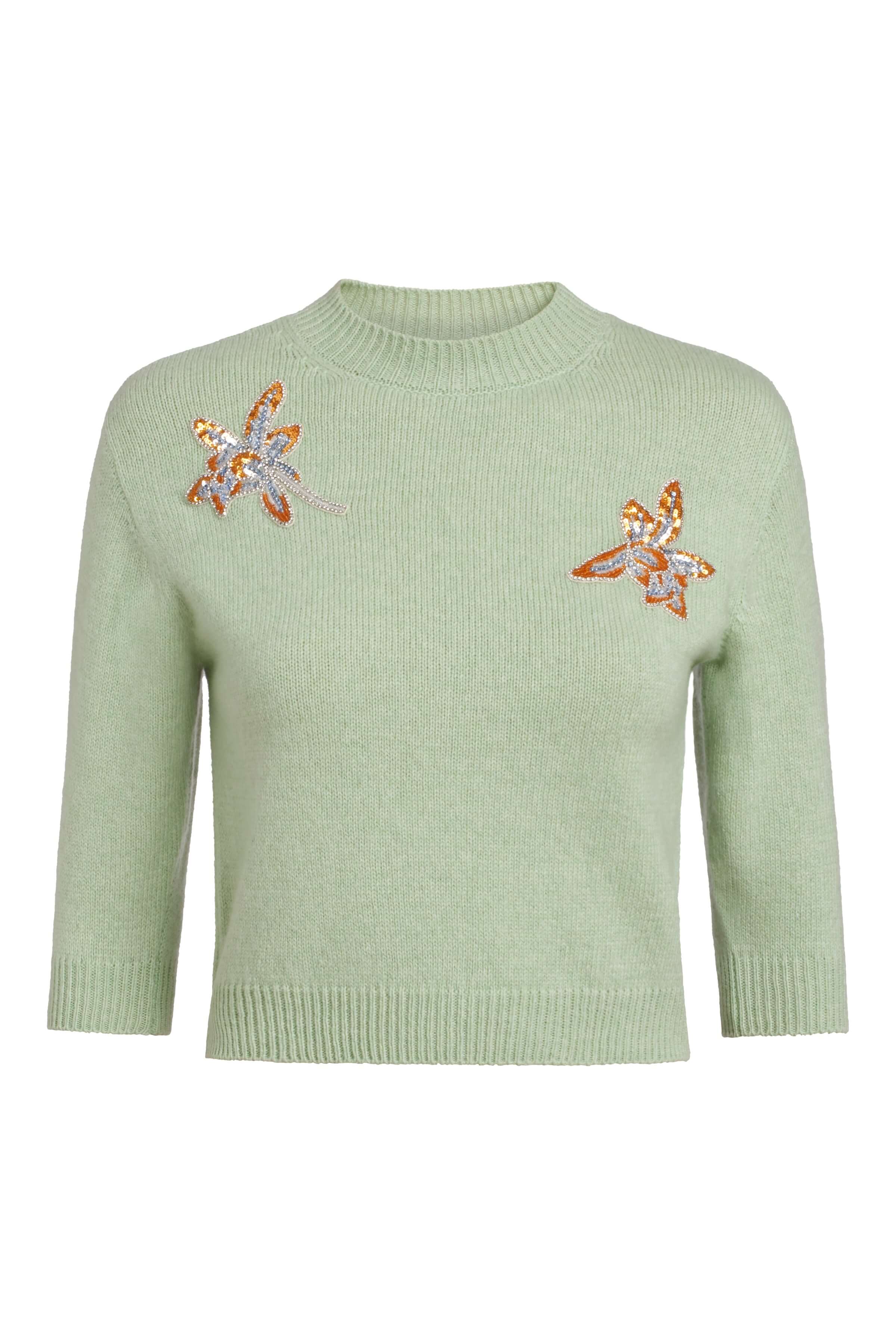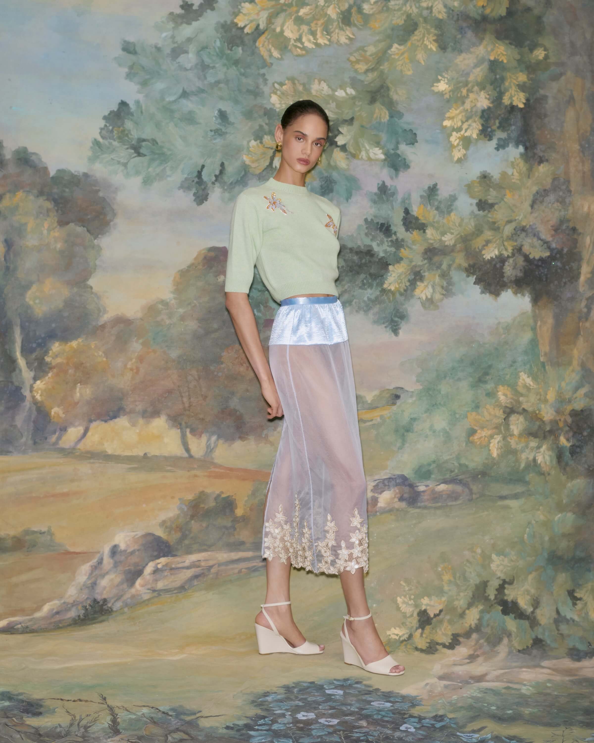 - The Posy Pistachio Sweater With Floral Beaded Patches is styled with our Amoret Ice Blue Satin and Tulle Skirt