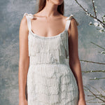 - Fitted bodice, self-tie bow shoulder straps, fully lined, back zip closure
