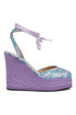 - Teal and purple metallic daisy brocade closed toed platform wedge with rope bottoms and self-tie fastening