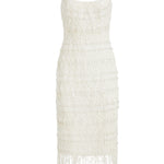 - Ivory corseted midi dress in hand beaded macramé with fringe hem