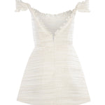 • Off-the-shoulder ruffle strap mini dress in off white pleated duchess satin with interior bustier corset