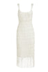 - Ivory corseted midi dress in hand beaded macramé with fringe hem