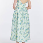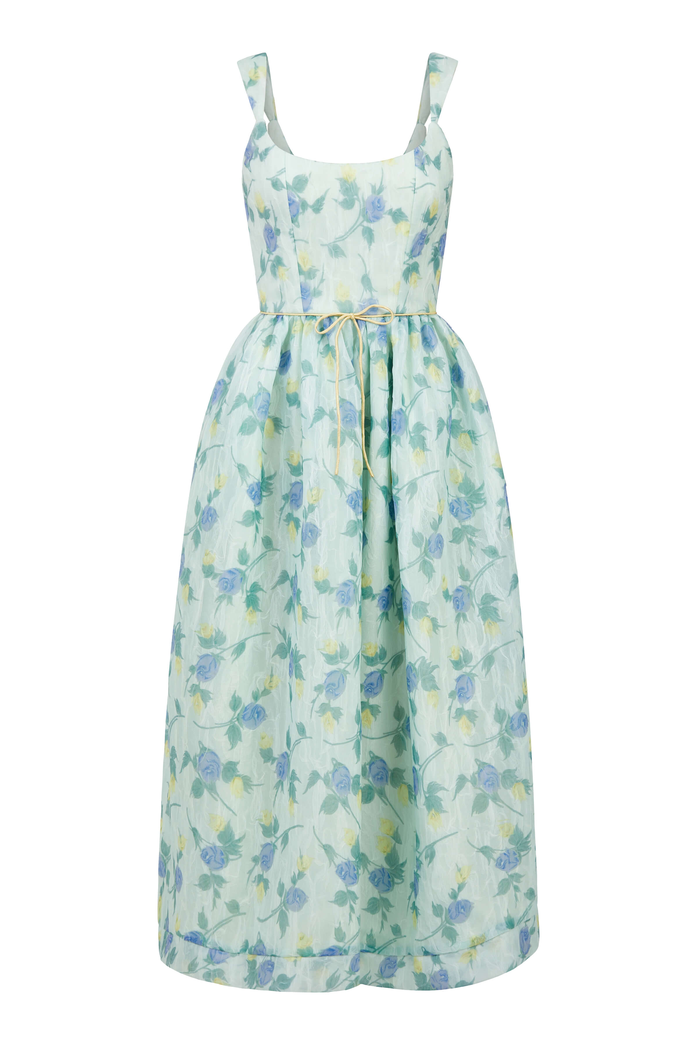 Blue and green floral textured organza corset midi dress with full skirt and bow piping detail, concealed pockets, fully lined