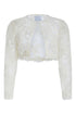 - Ivory lace cropped long sleeve jacket with scalloped hem and hook closure at neck, unlined