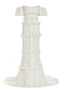 - Off-the-shoulder ruffled ivory tiered lace gown with train, fully lined