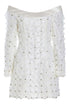 - White honeycomb smocked tulle long sleeve mini dress with satin off-the-shoulder neckline and crystal embellishment, fully lined