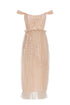 - Blush pink ruffled tulle off-the-shoulder midi dress with beaded floral embellishment, fully lined