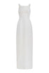 - White silk faille square neck column gown with bow details and back slit, fully lined