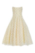 - Butter yellow honeycomb smocked tulle strapless midi dress with crystal embellishment, fully lined
