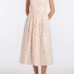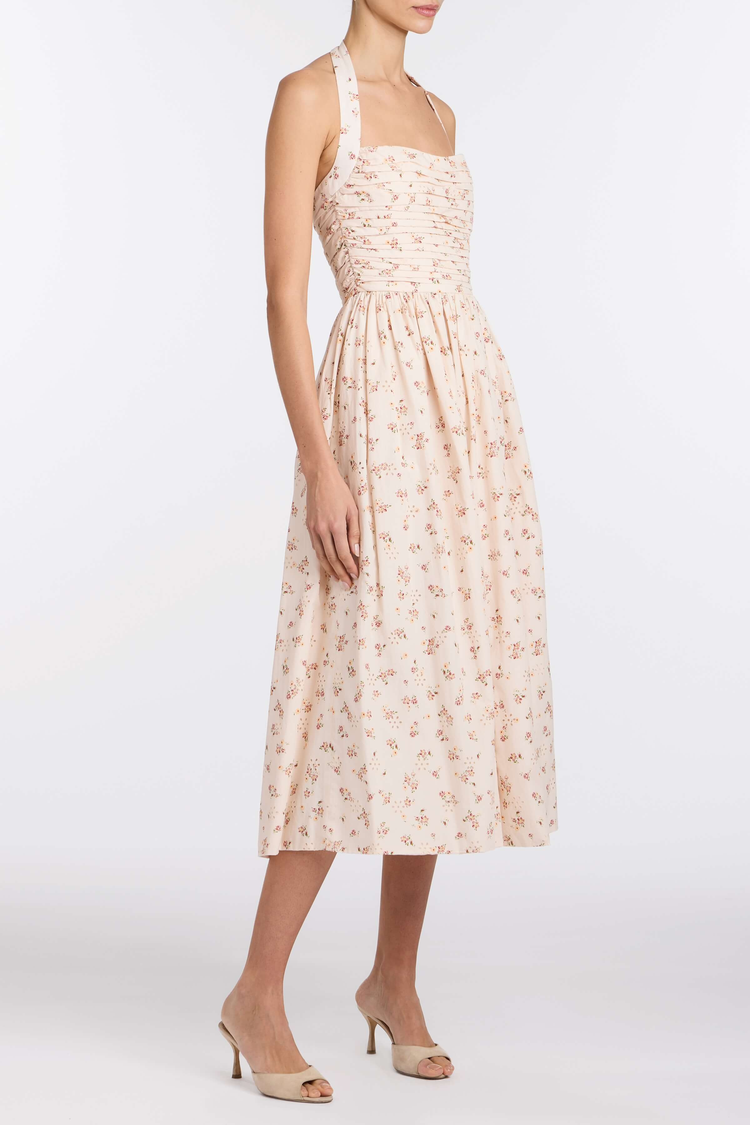 • Blush pink floral bouquet cotton eyelet full skirt midi dress with ruched bodice and halter neck, fully lined