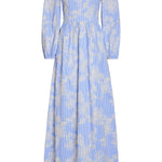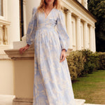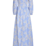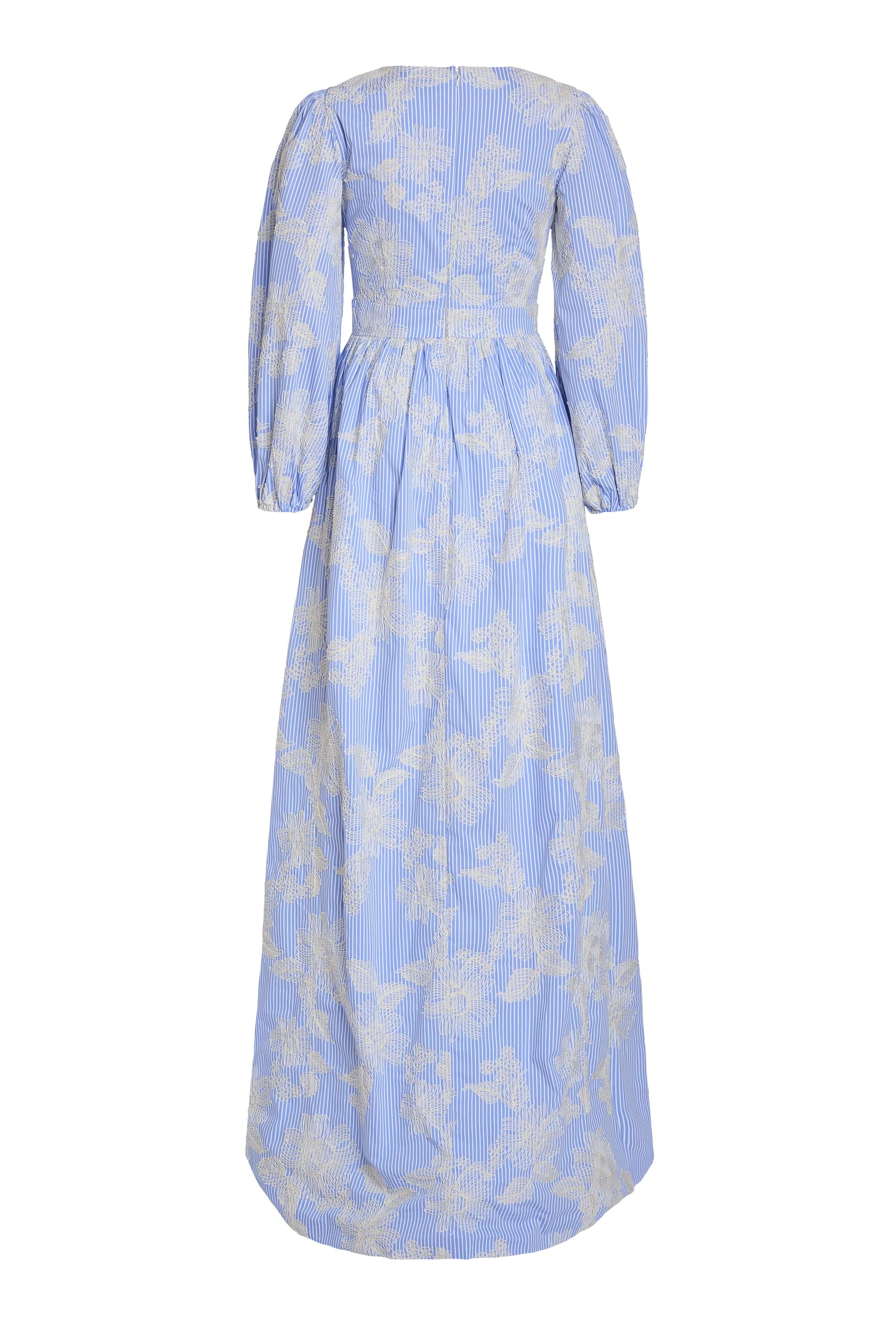 - Ivory floral embroidered cornflower blue cotton stripe long sleeve v-neck gown, fully lined