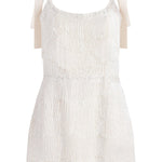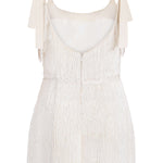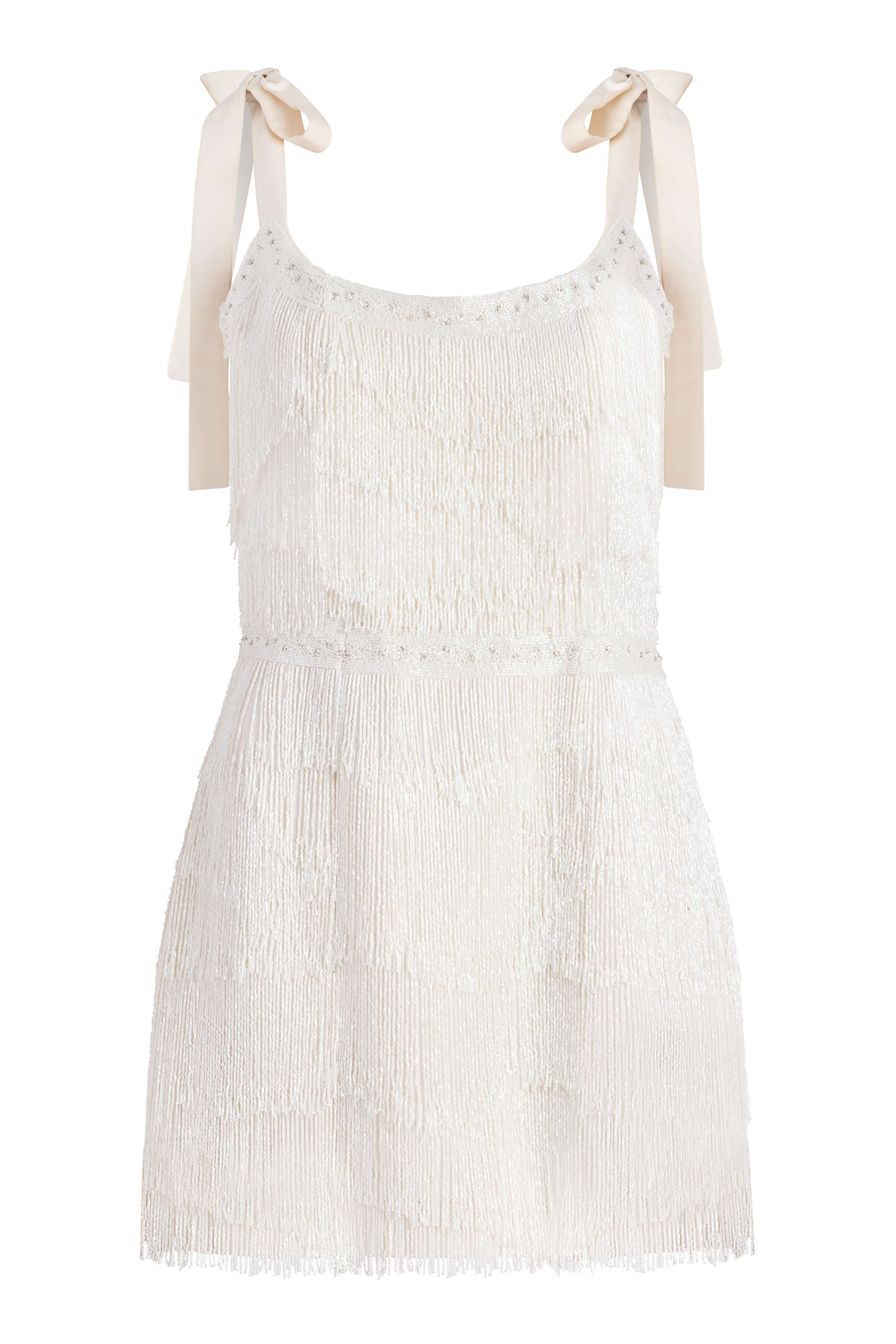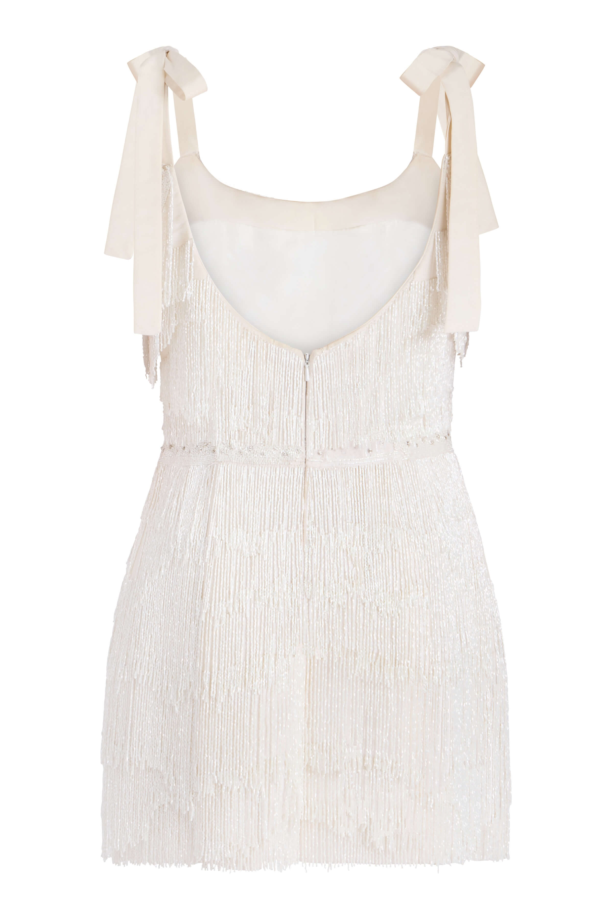 - Fitted bodice, self-tie bow shoulder straps, fully lined, back zip closure