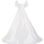 - Split corseted bodice, off-the-shoulder neckline with short puff sleeves, gathered waist, gown length, fully lined