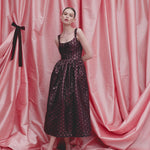 - Burgundy floral stripe midi corset dress with full skirt and scooped low back, fully lined