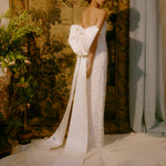 Evora Pearl Beaded White Lace Gown with Large Detachable Bow