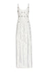 - White silk paneled column gown with white and metallic daisy beading throughout