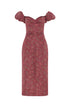 - Raspberry floral ikat column midi dress off-the-shoulder puff sleeves and front slit, fully lined